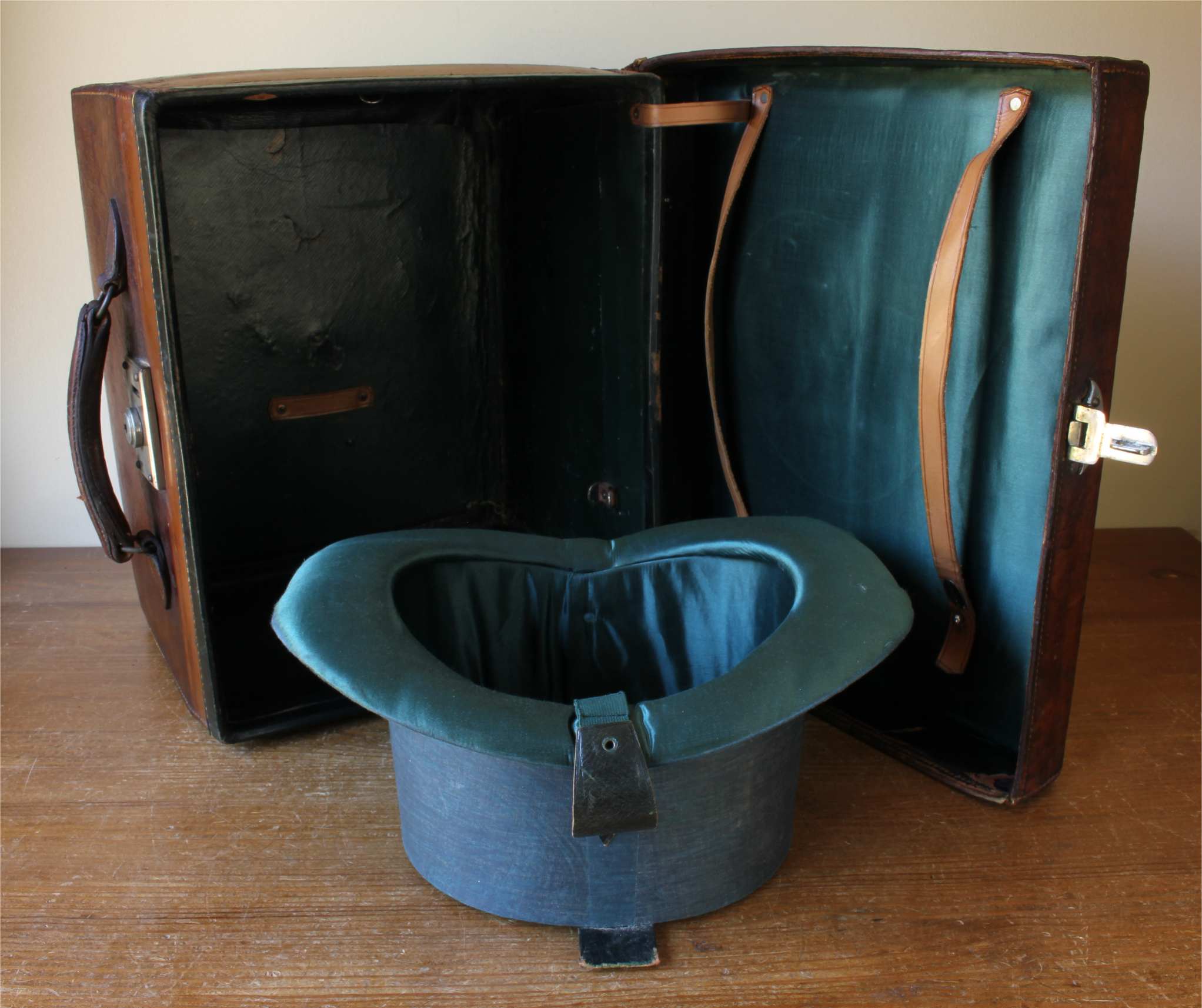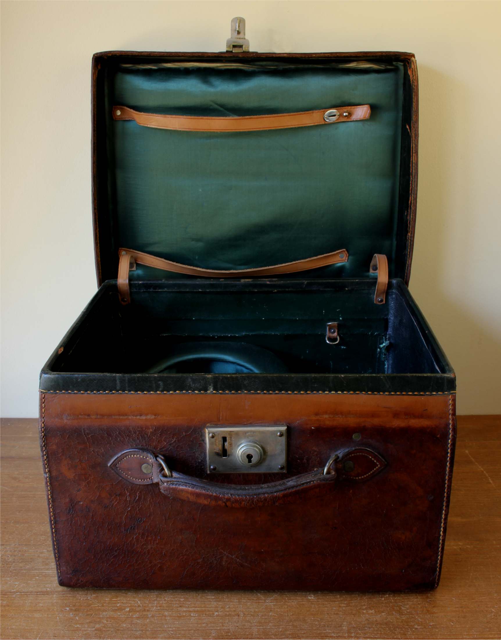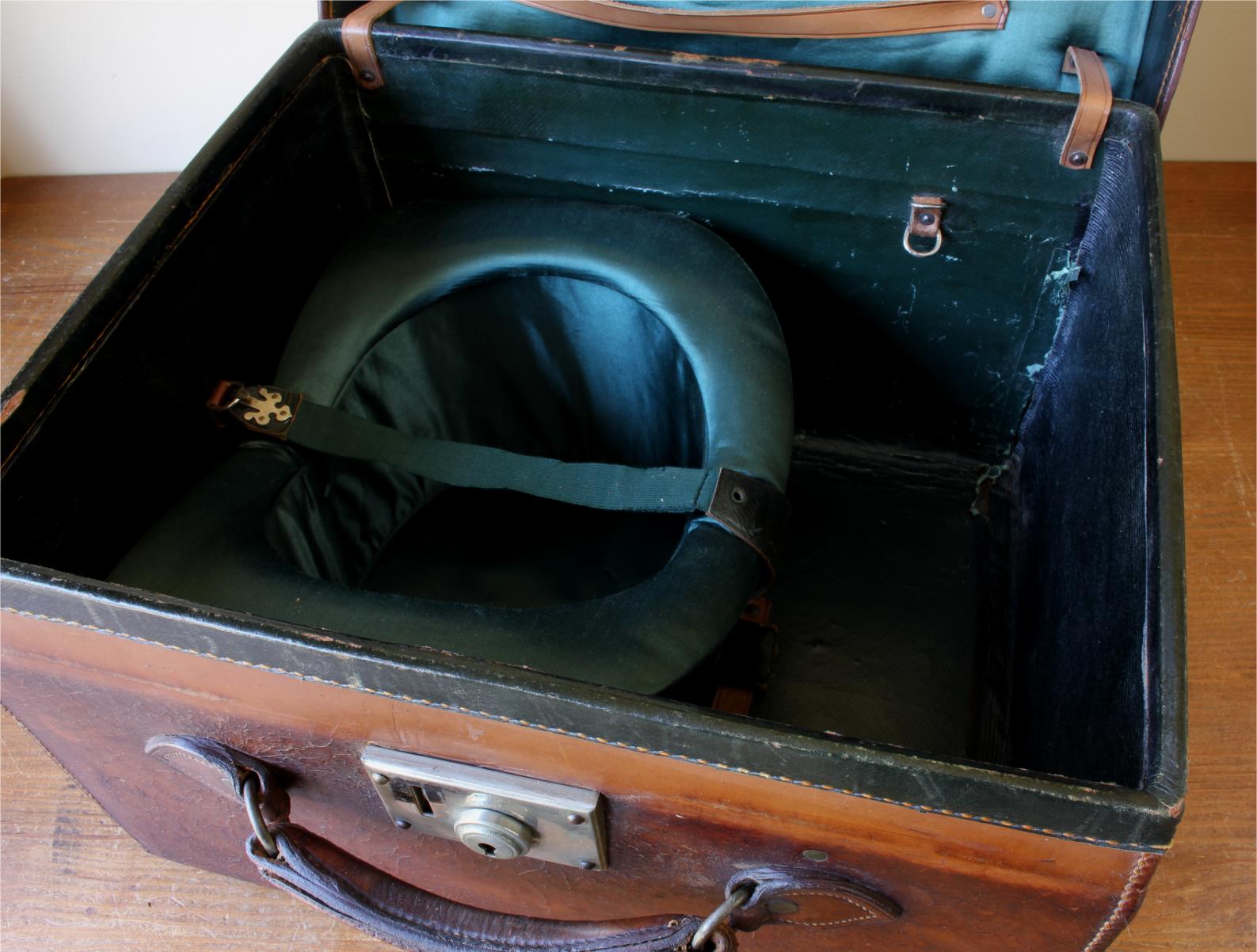 The case has a metal lock which is marked British Make, a leather carry handle, is nicely monogrammed L.H.B to the lid, stud feet to the underside, leather inner straps for storing your opera hat, green silk lining to the inner lid and has a removable padded green silk section for protecting your top hat.