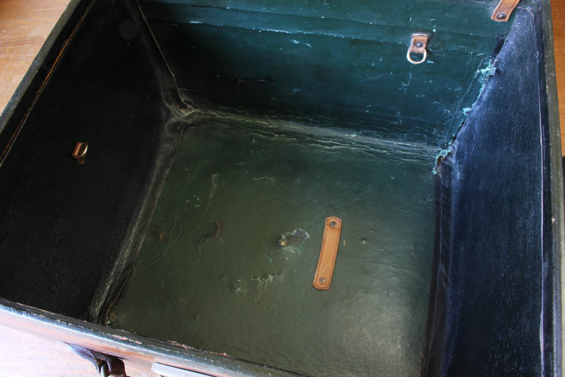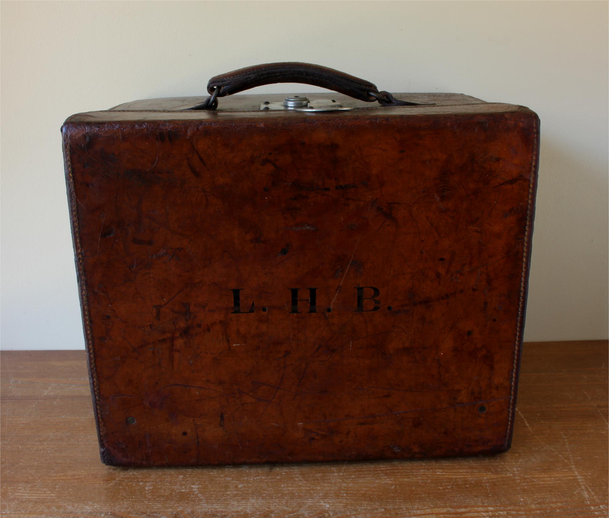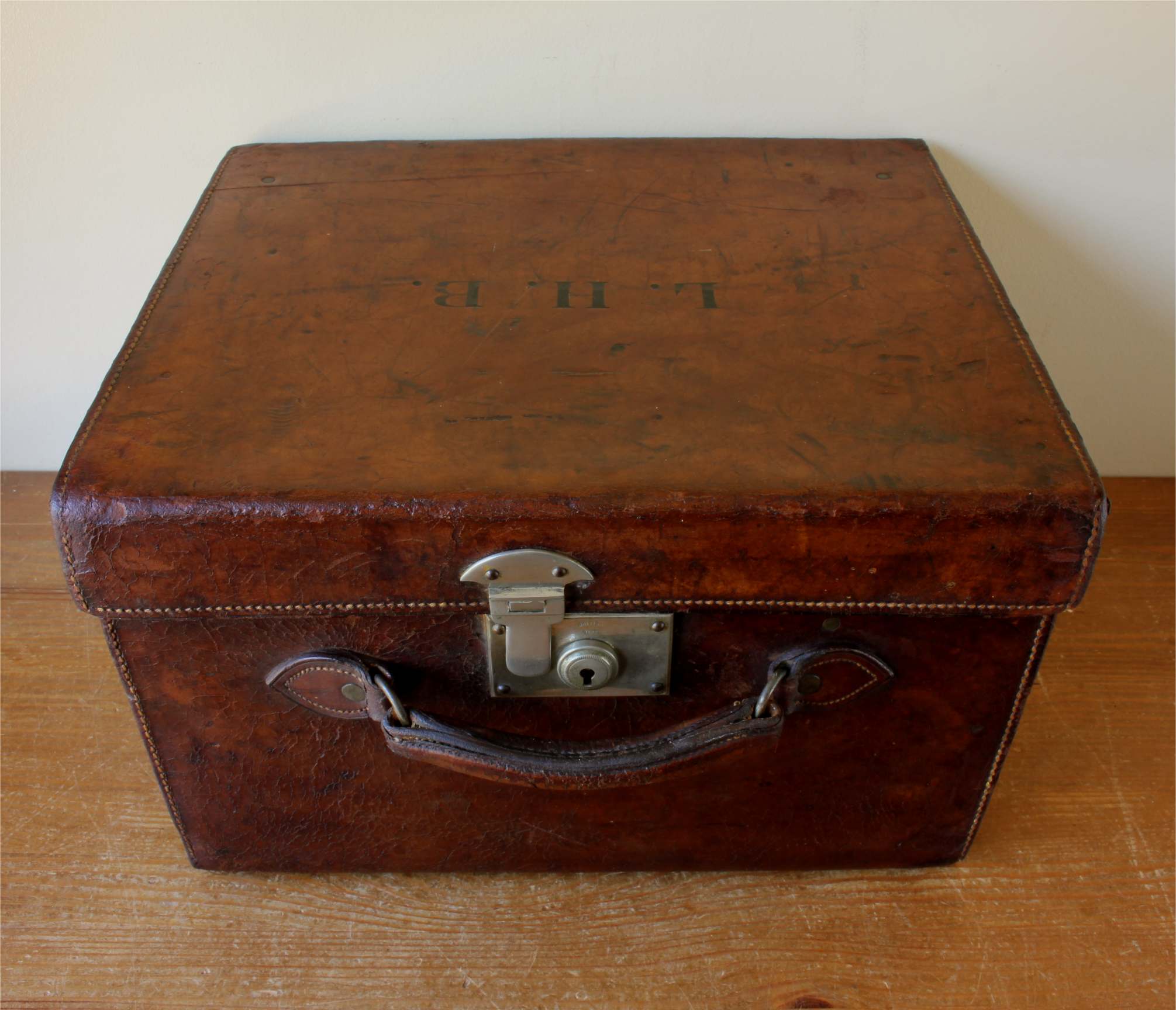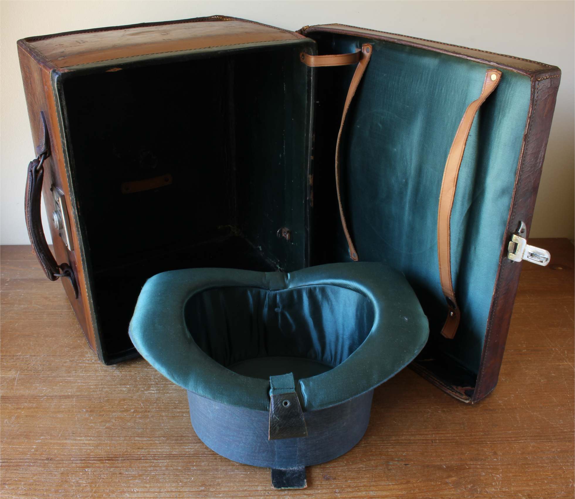 The case has a metal lock which is marked British Make, a leather carry handle, is nicely monogrammed L.H.B to the lid, stud feet to the underside, leather inner straps for storing your opera hat, green silk lining to the inner lid and has a removable padded green silk section for protecting your top hat.