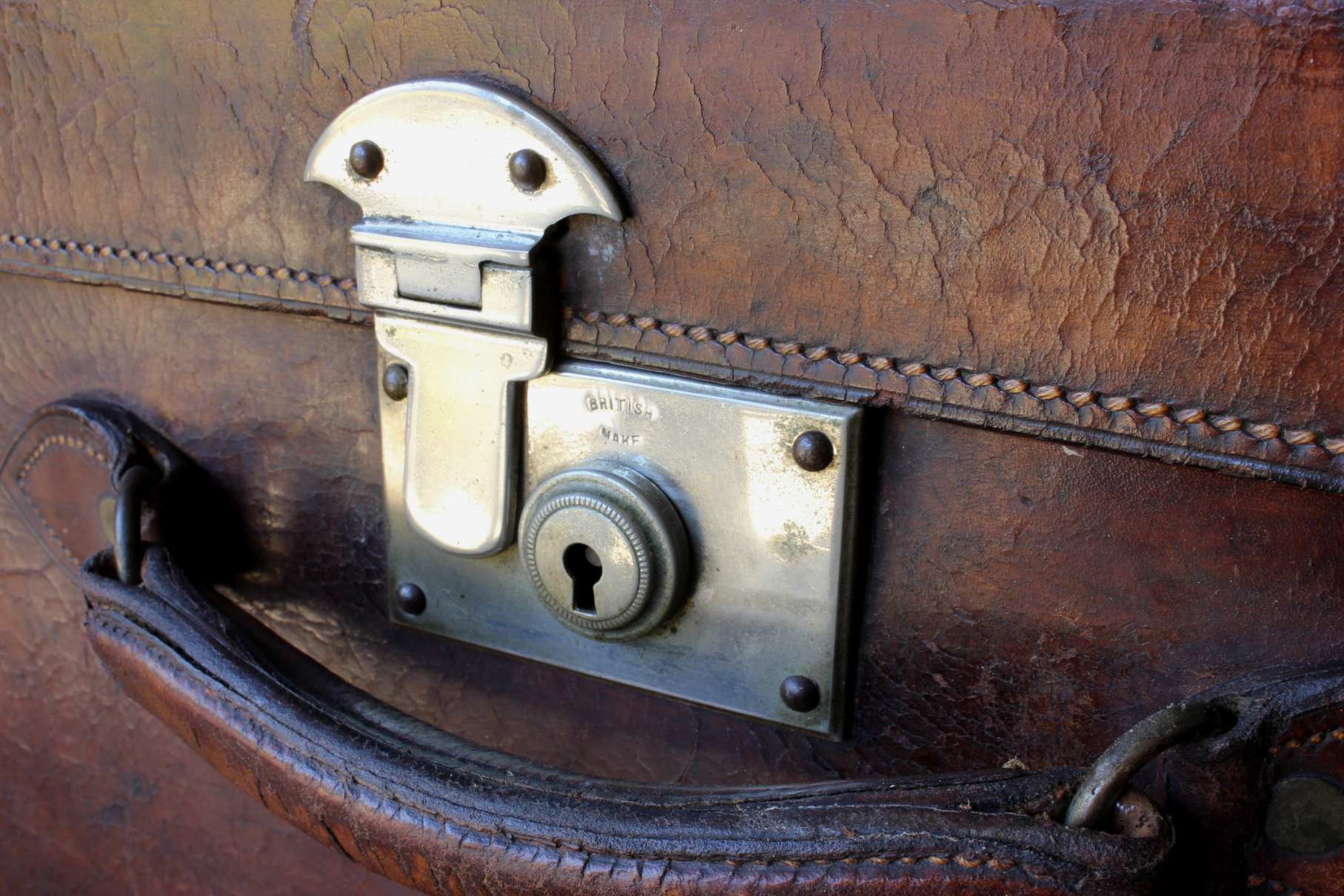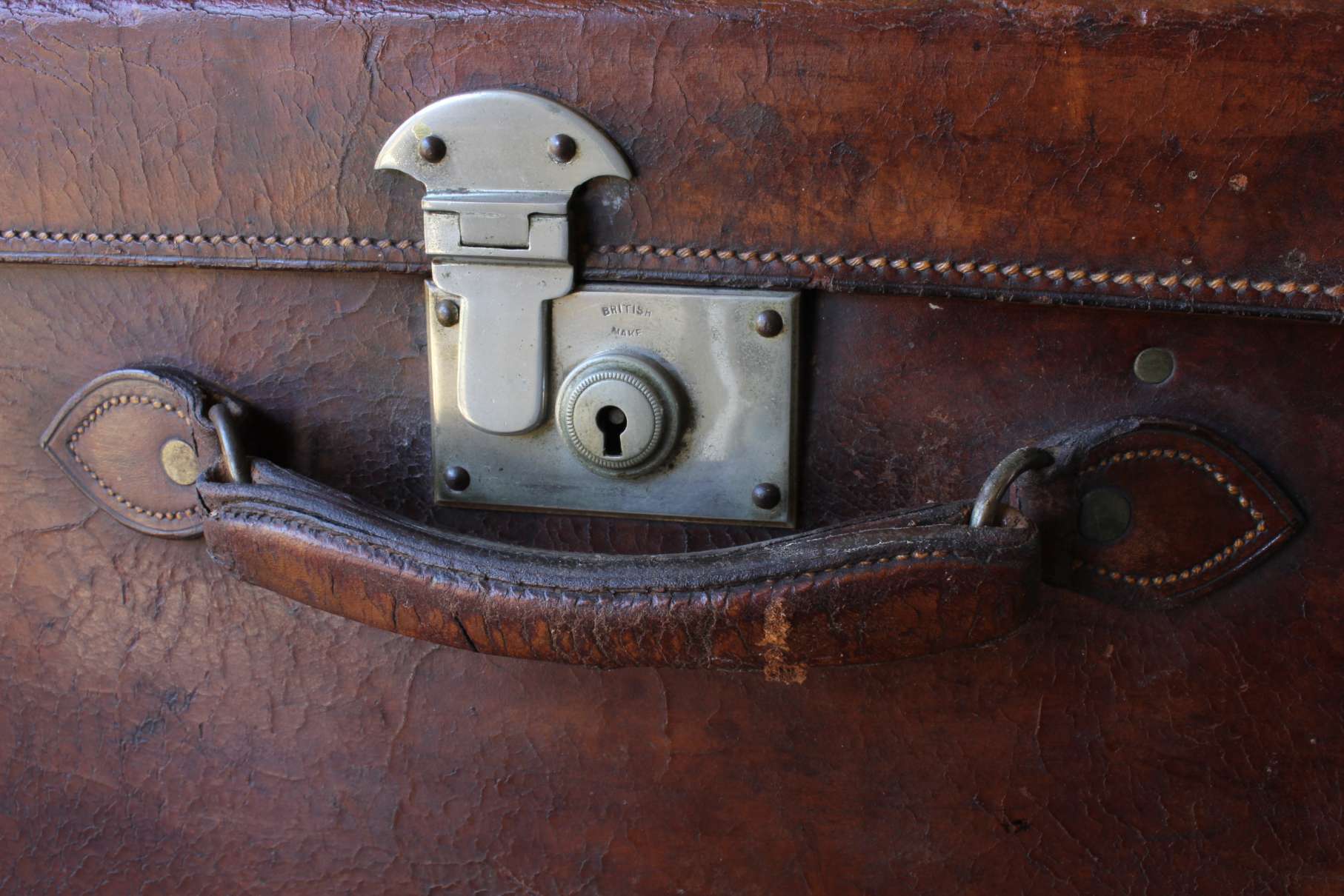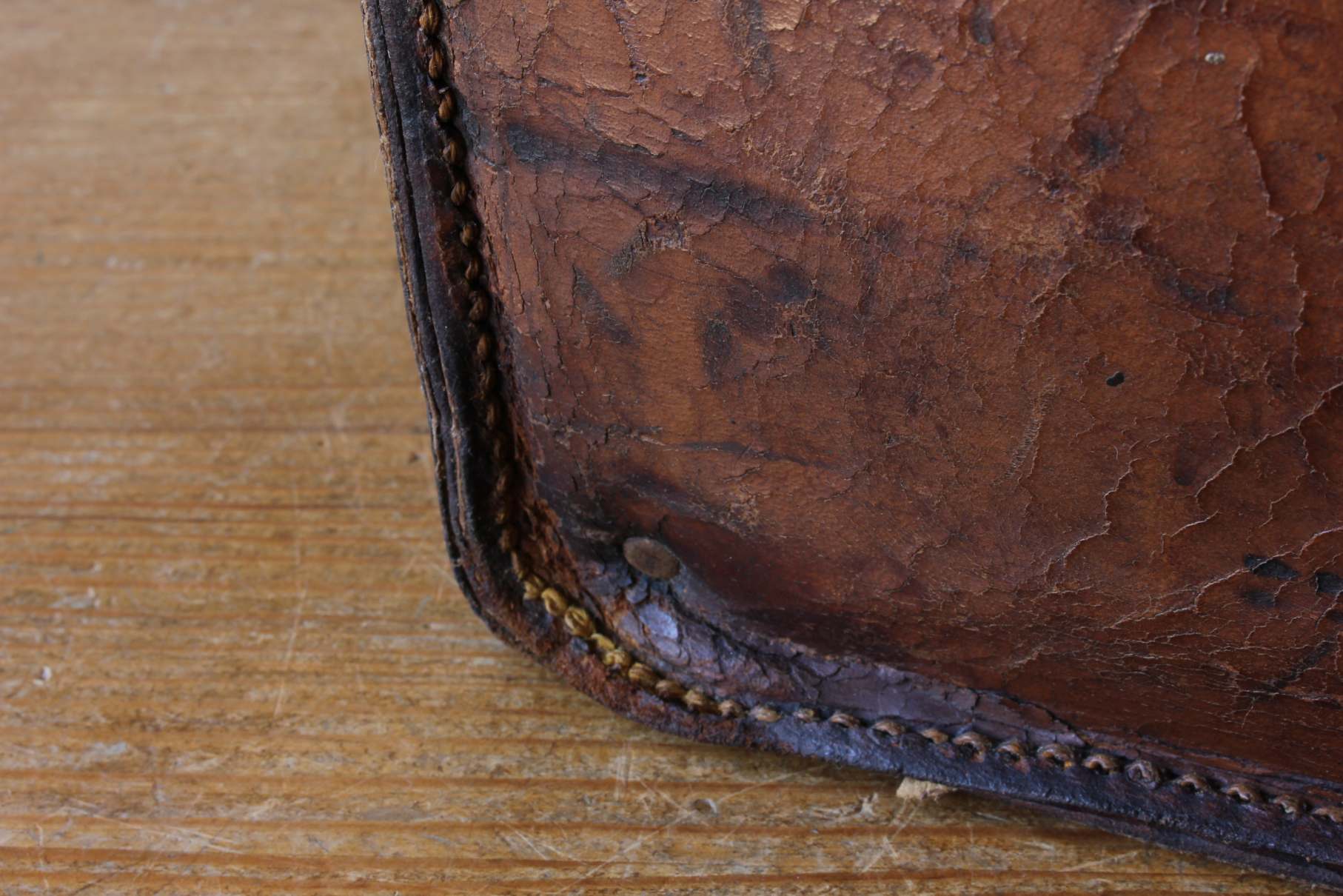 Condition: Lots of age related wear with scuffs and scrapes leaving a wonderful natural aged look. The leather has dried out and cracked in places. The back corners are misshapen. The interior lining is torn along the top. The locking clasp works fine but there is no key. Please see pictures.