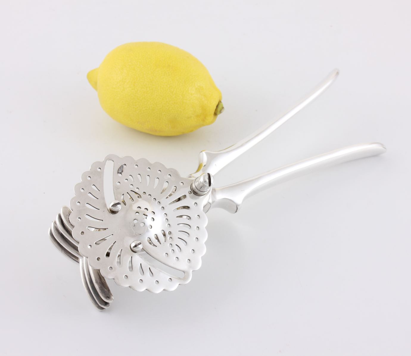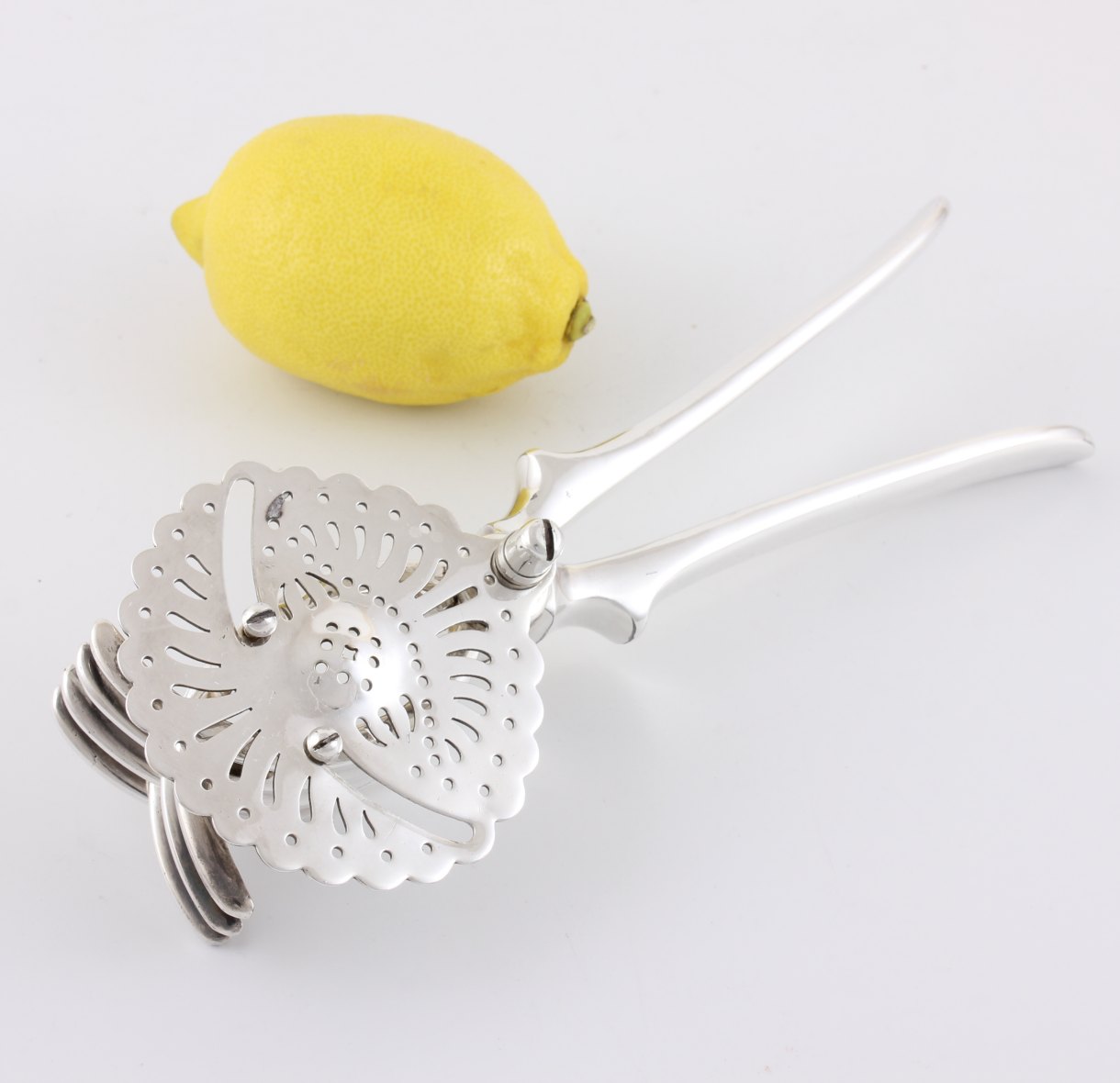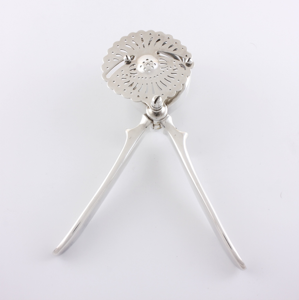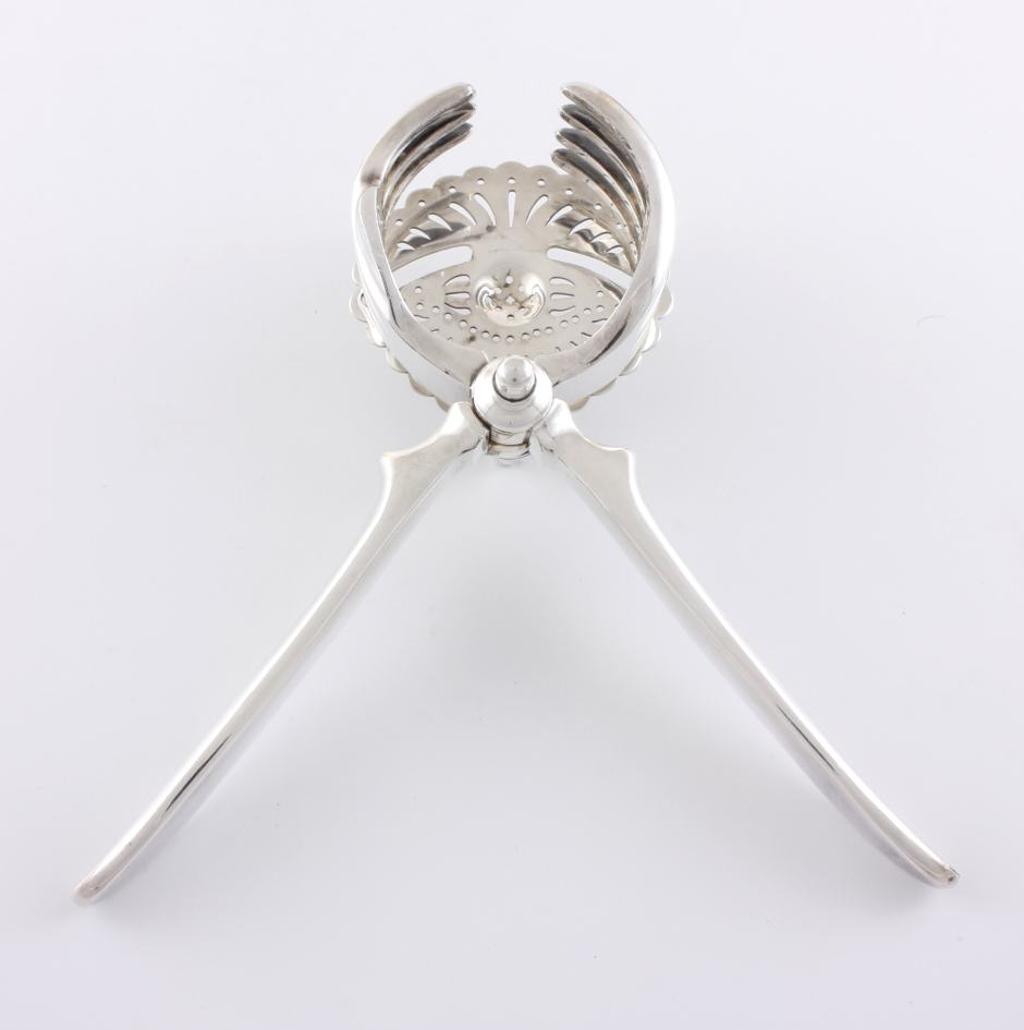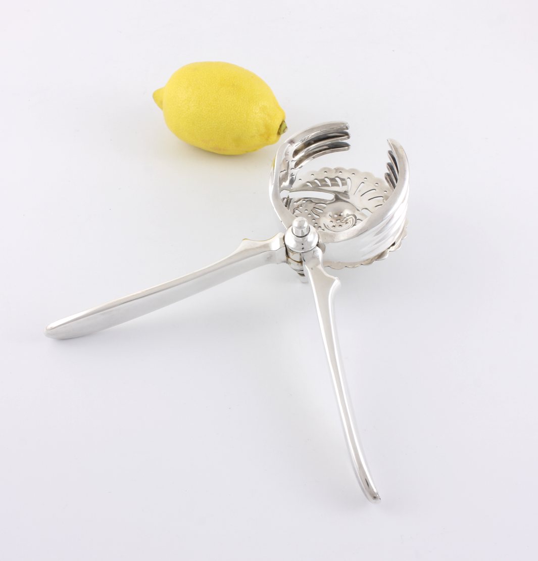 This handsome silver plated lemon squeezer which dates from c1930 has a pierced strainer which retains the pips once your fruit has been squeezed and works by placing your lemon or lime half within the claws and then closing the two handles to squeeze.