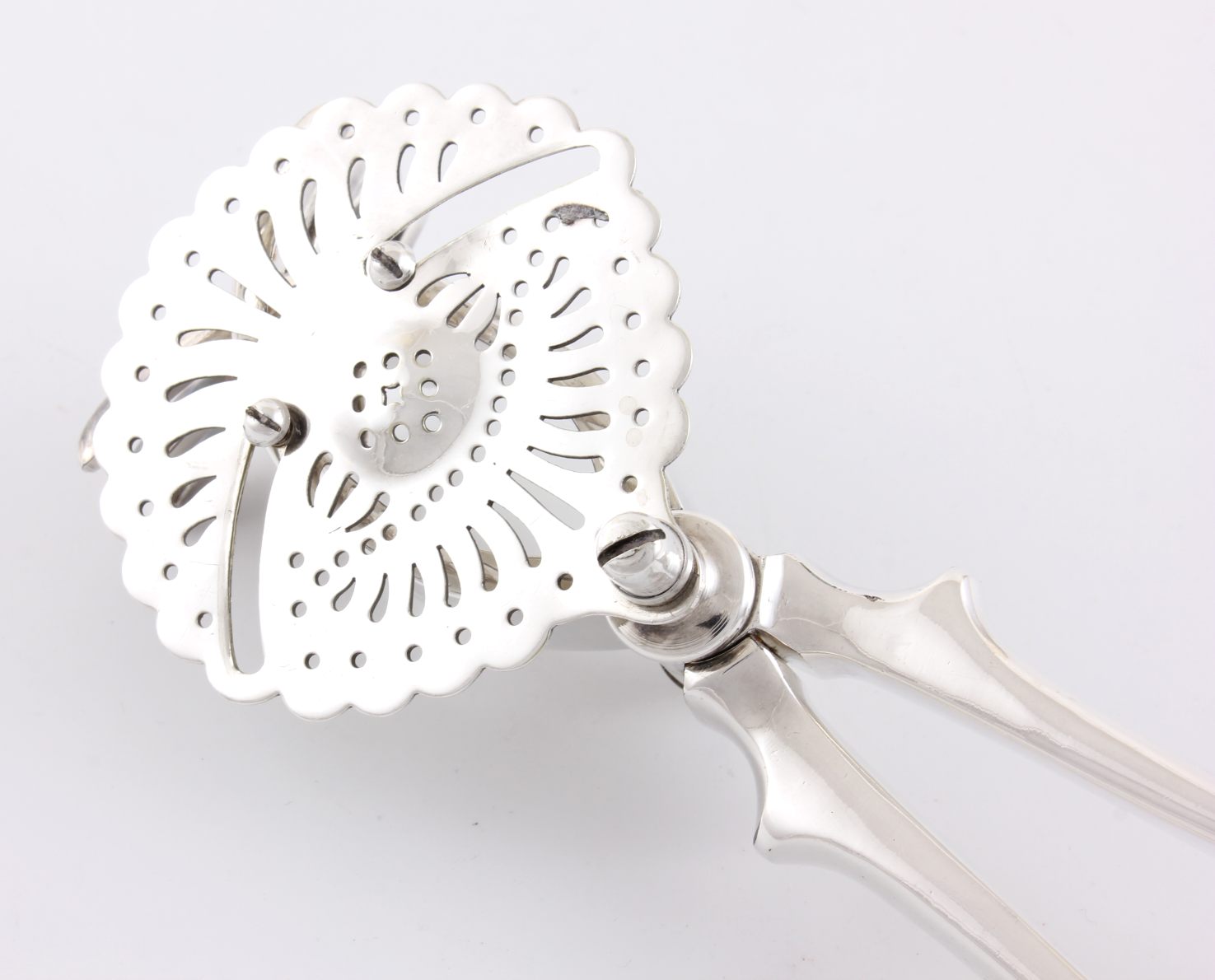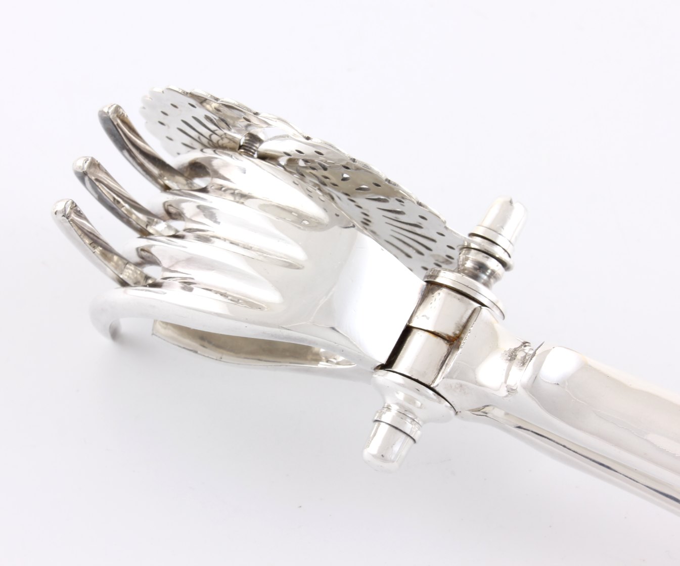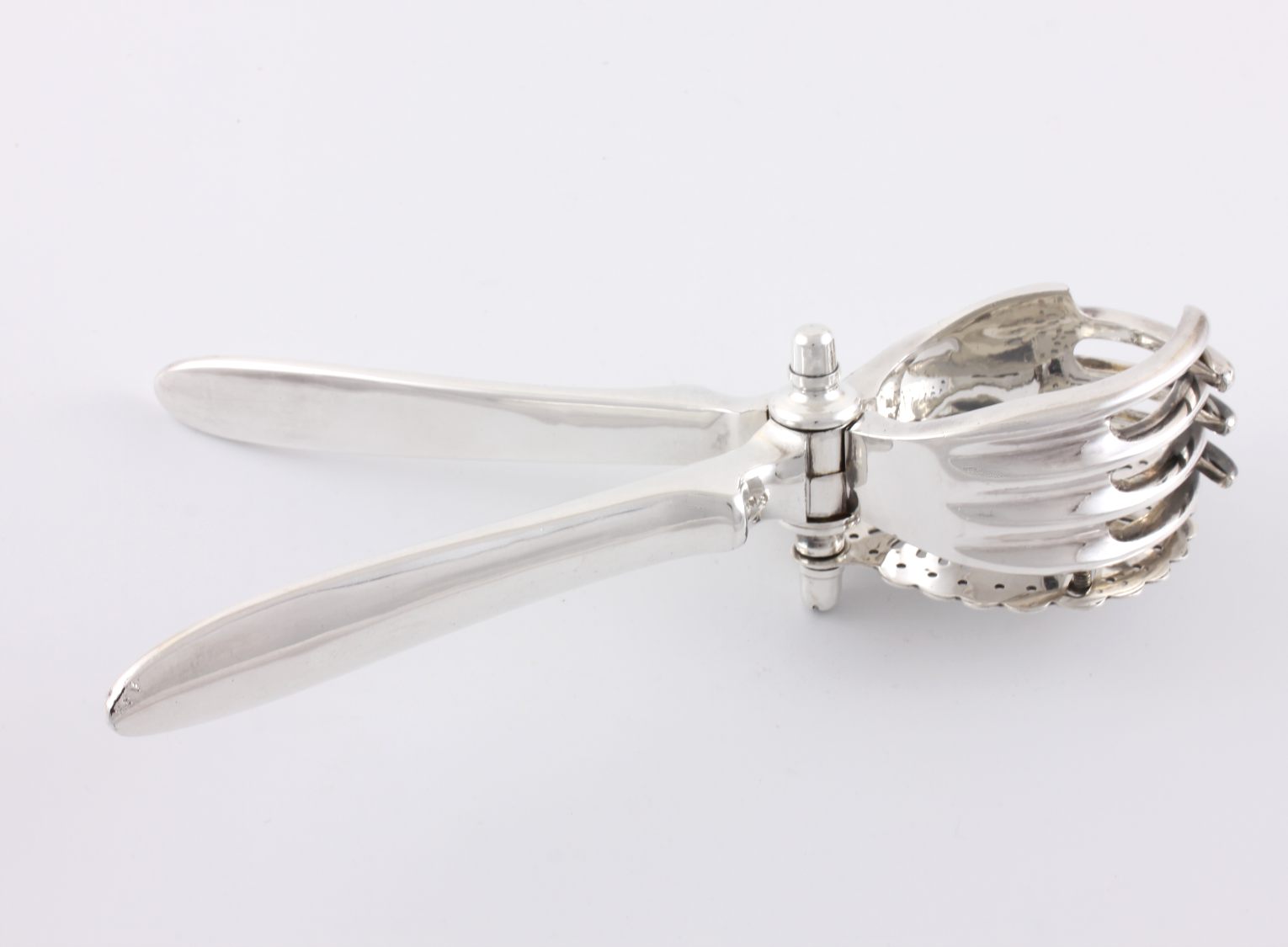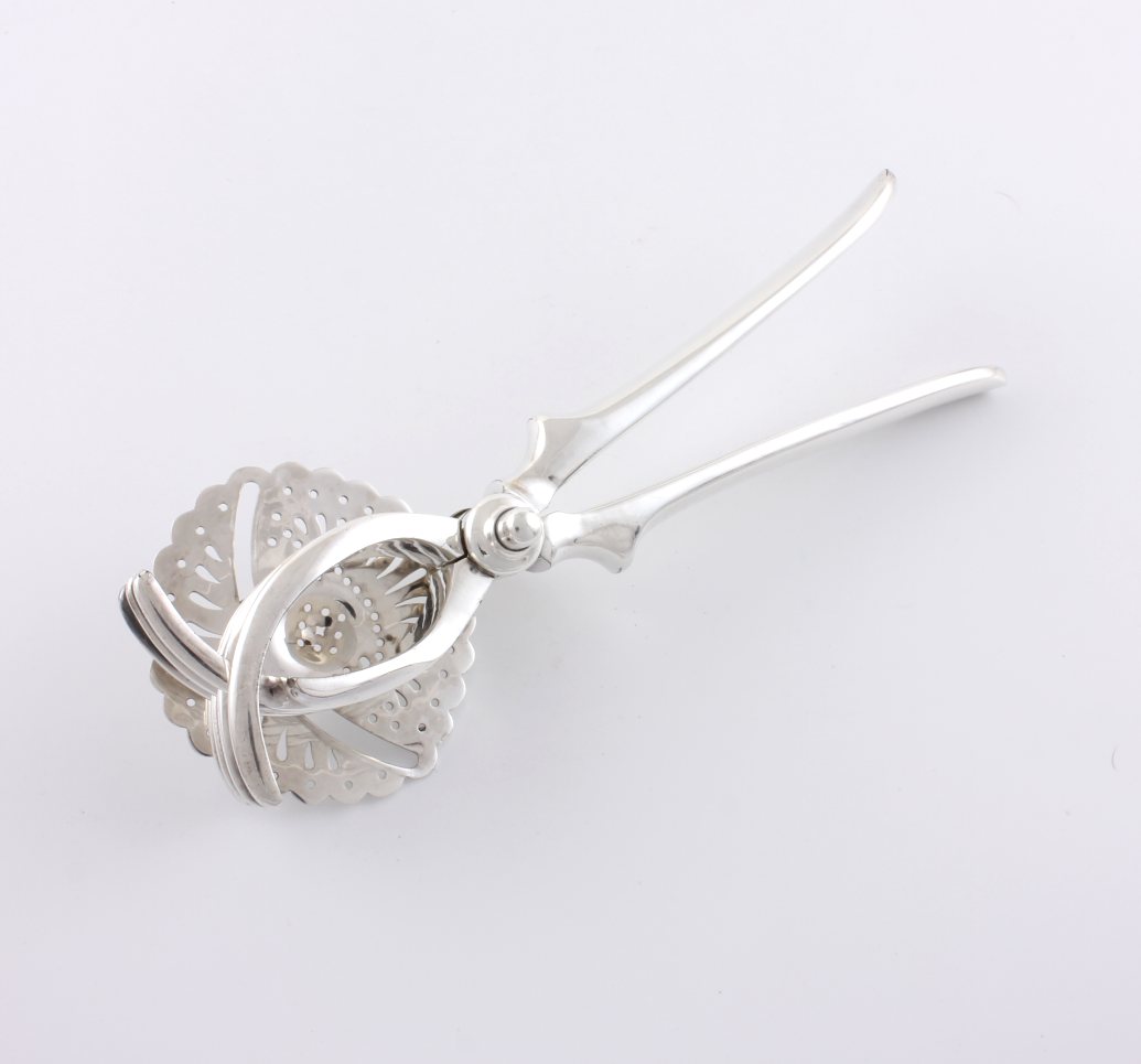 This handsome silver plated lemon squeezer which dates from c1930 has a pierced strainer which retains the pips once your fruit has been squeezed and works by placing your lemon or lime half within the claws and then closing the two handles to squeeze.