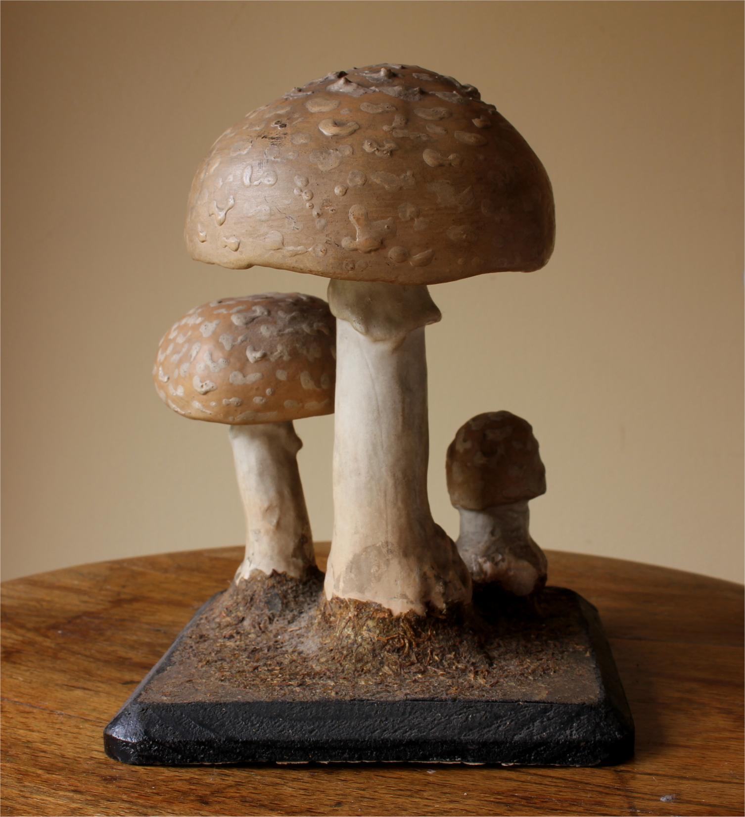 This decorative piece is a large size, is unusual being a mushroom trio, made of plaster which has very good detail and is mounted on it's original wooden base which is marked with the number 6 and has a label to the underside.