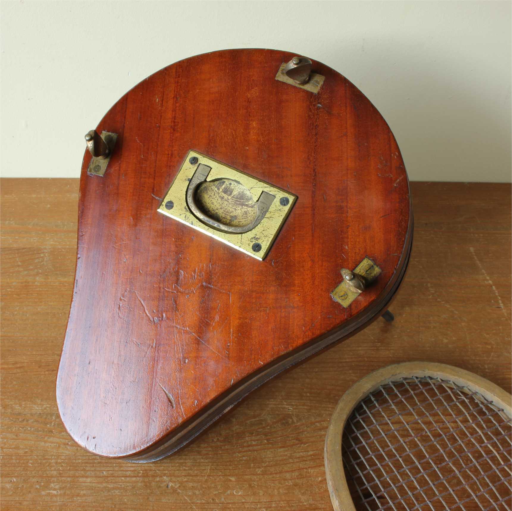 This attractive antique wooden tennis racket press which is made of wood has brass fittings, metal screws, a gilt brass carrying handle and dates from c1900.