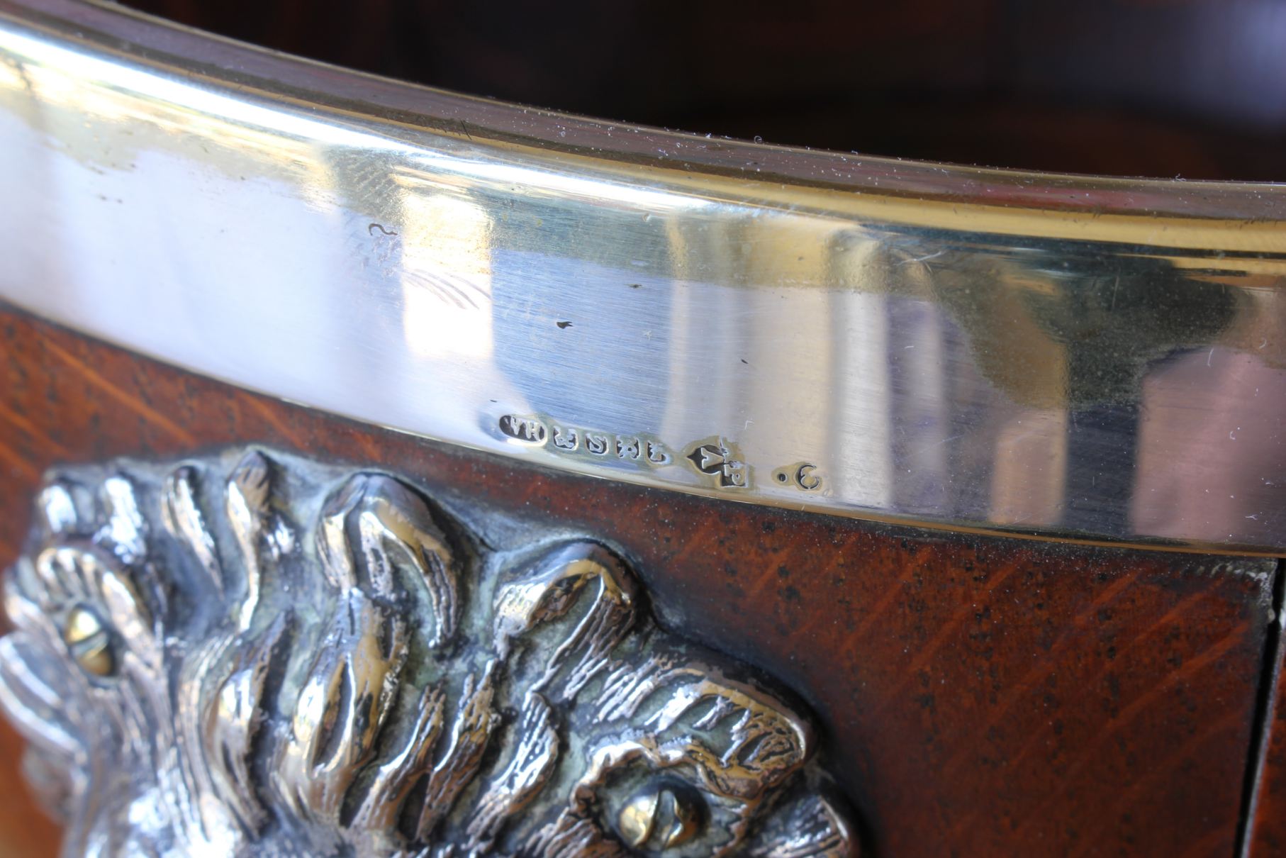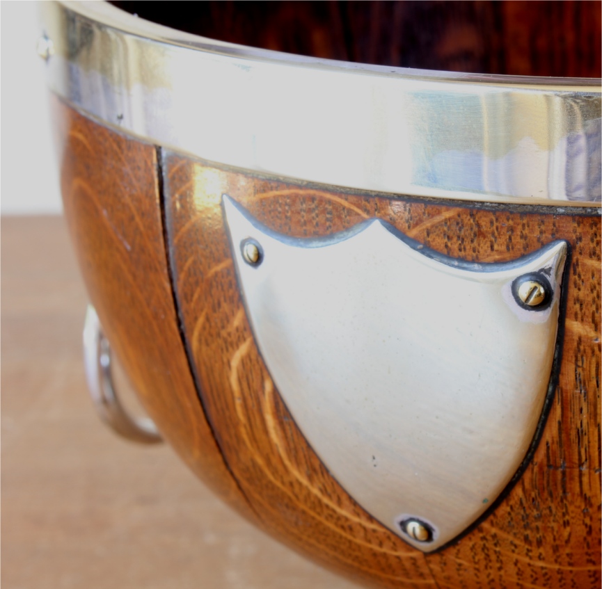 This handsome English Oak fruit bowl which is by William Hutton & Sons Ltd dates from c1900, has silver plated lion head and ring handles to the sides, silver plated rim and sits on a raised silver plated foot.