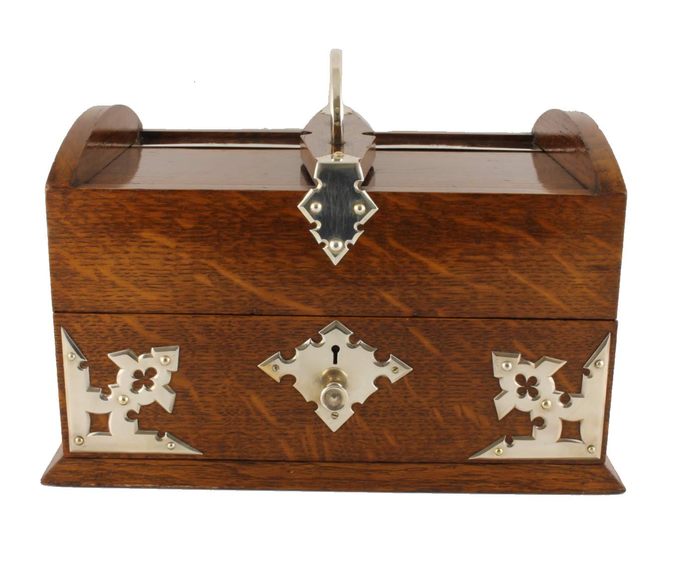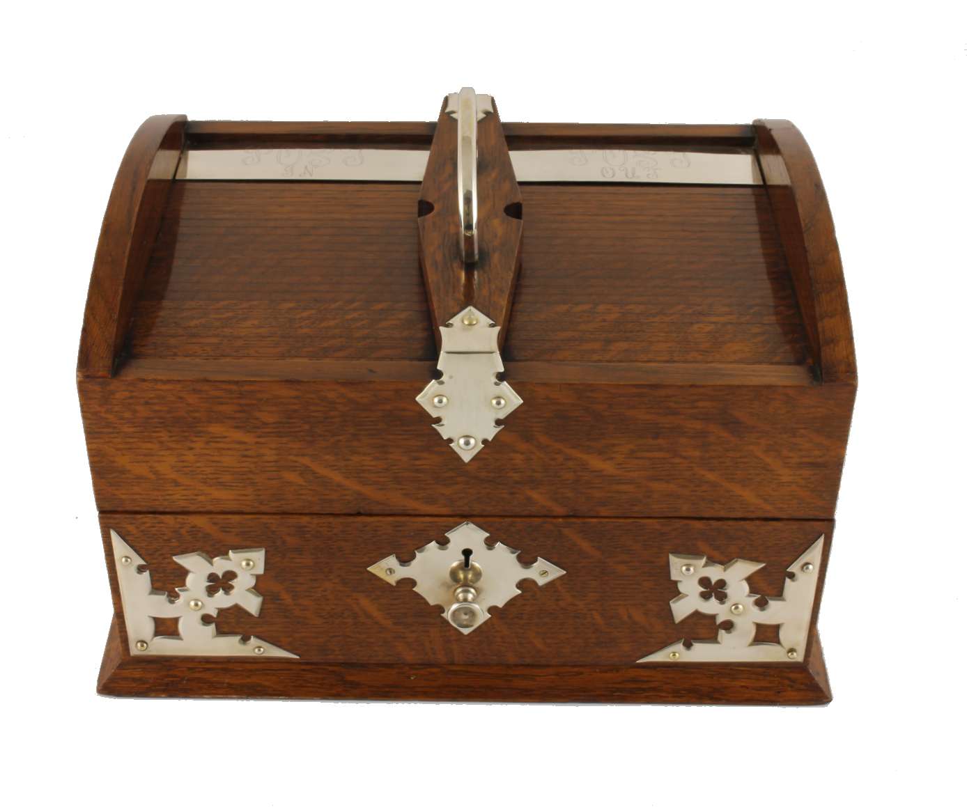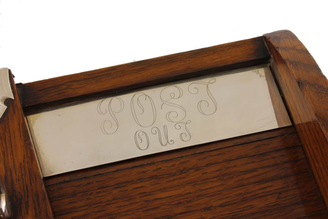 This handsome antique table humidor which is made of English oak dates from c1900 and has two compartments to the top with silver plated fittings which are nicely engraved with Post In and Post Out.
