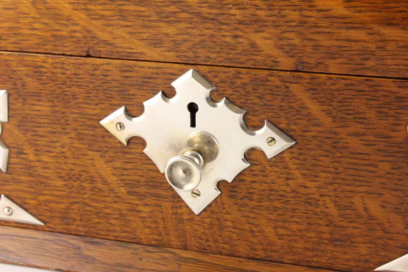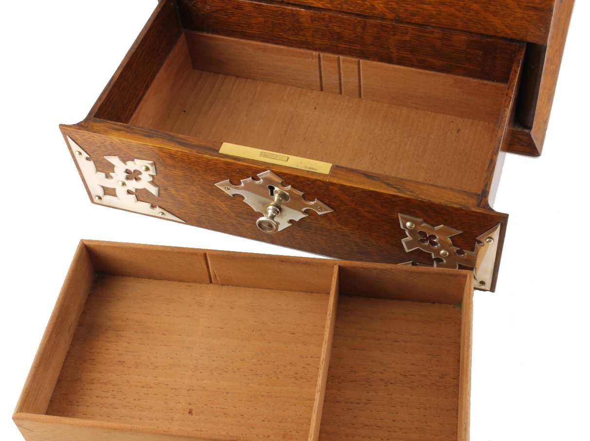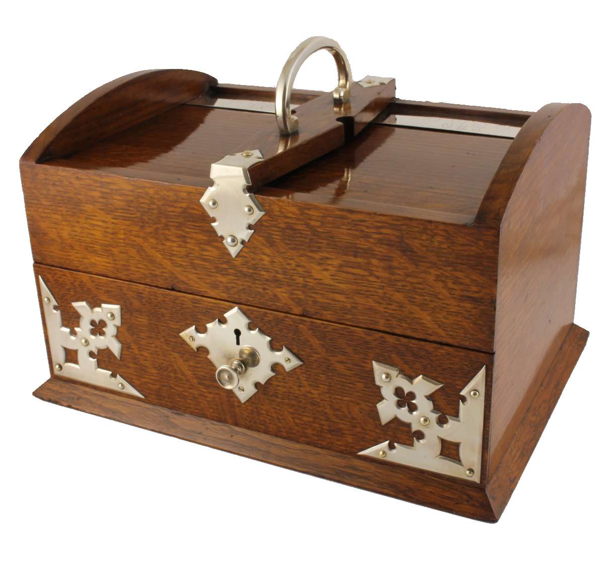 This handsome antique table humidor which is made of English oak dates from c1900 and has two compartments to the top with silver plated fittings which are nicely engraved with Post In and Post Out.