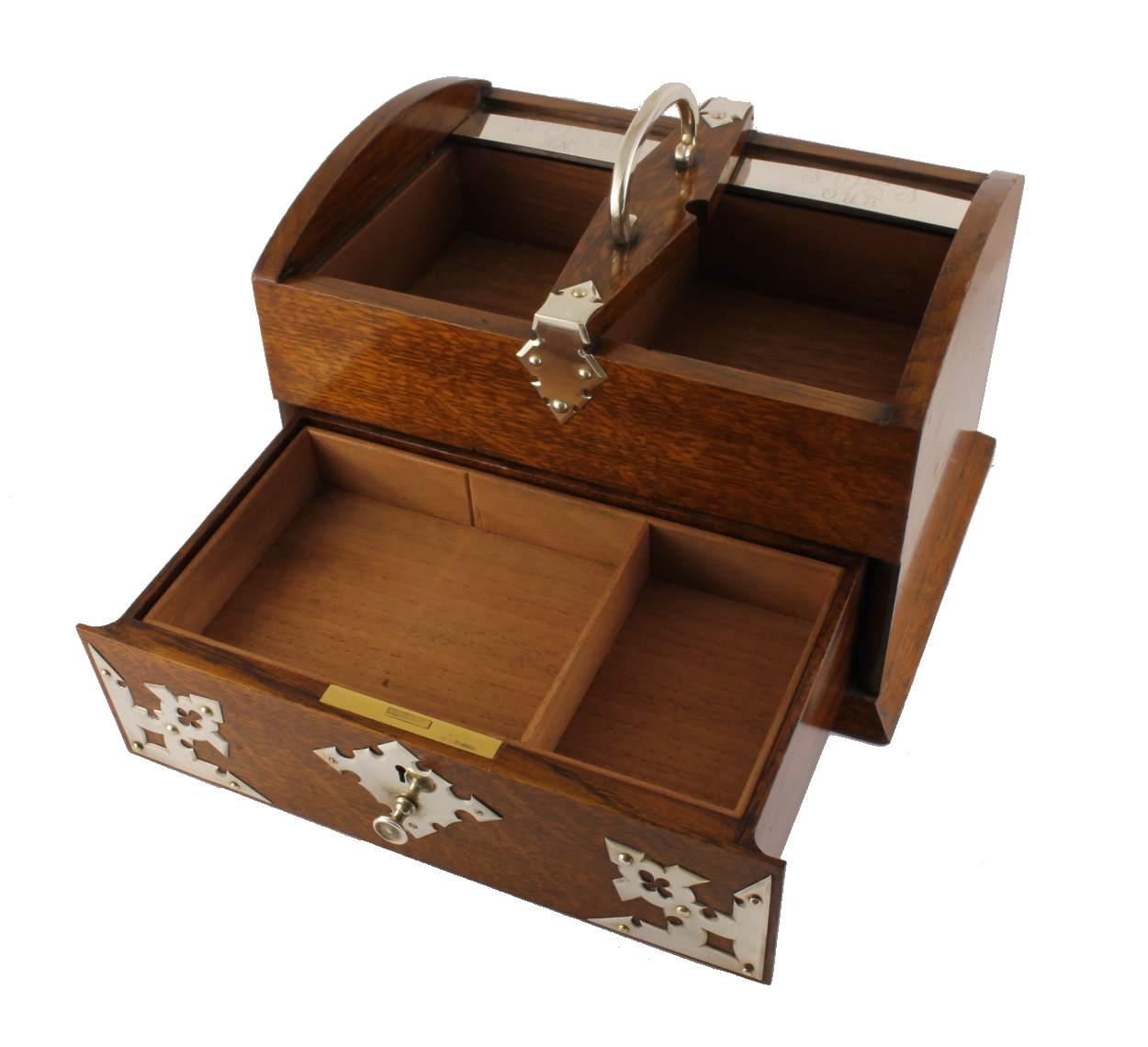 This unusual box sits nicely on a desk or table and can also be carried using the top silver plated handle.