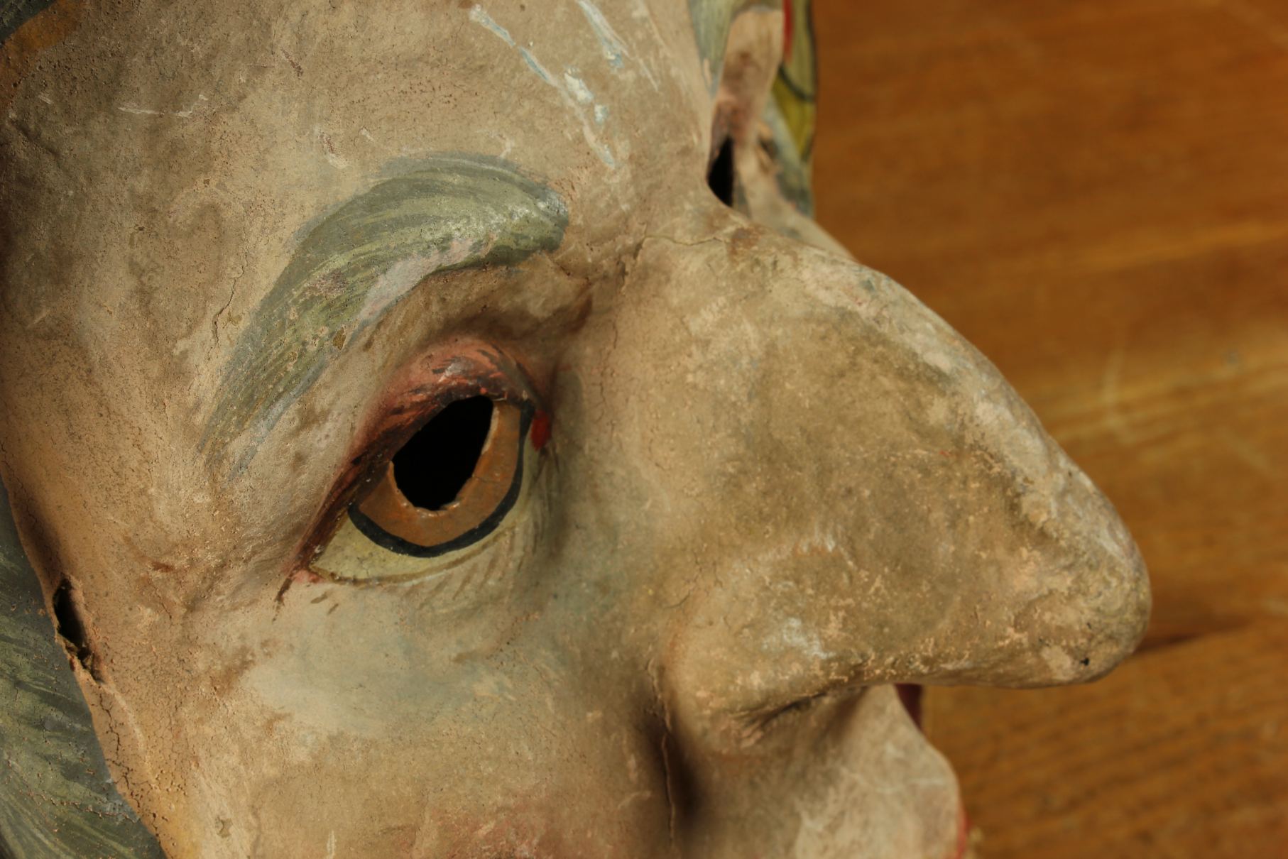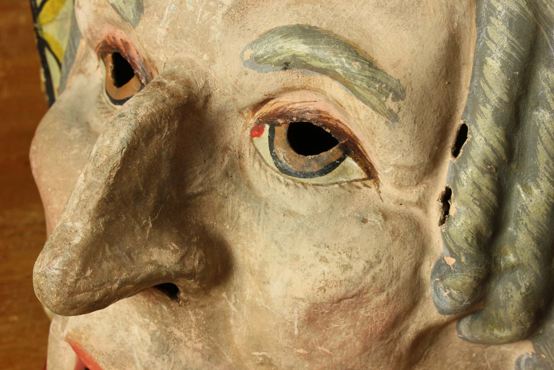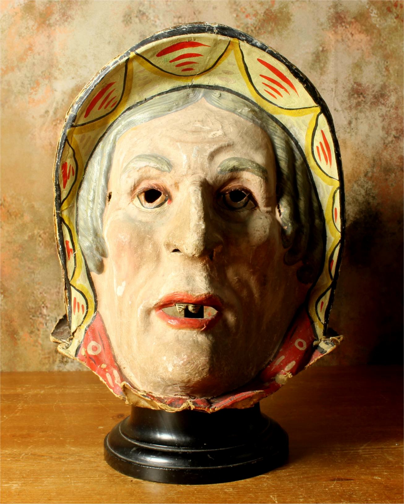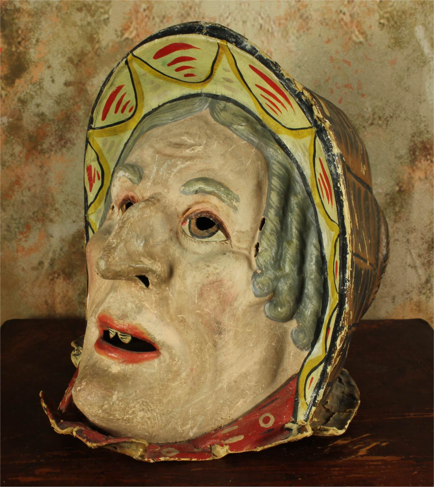This stunning antique carnival mask which is made of papier mache dates from the early 20th century, originates from Europe and is in the form of an old lady's head.