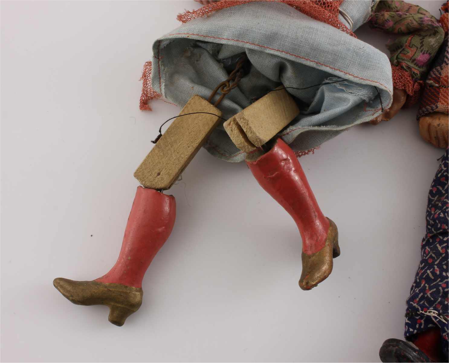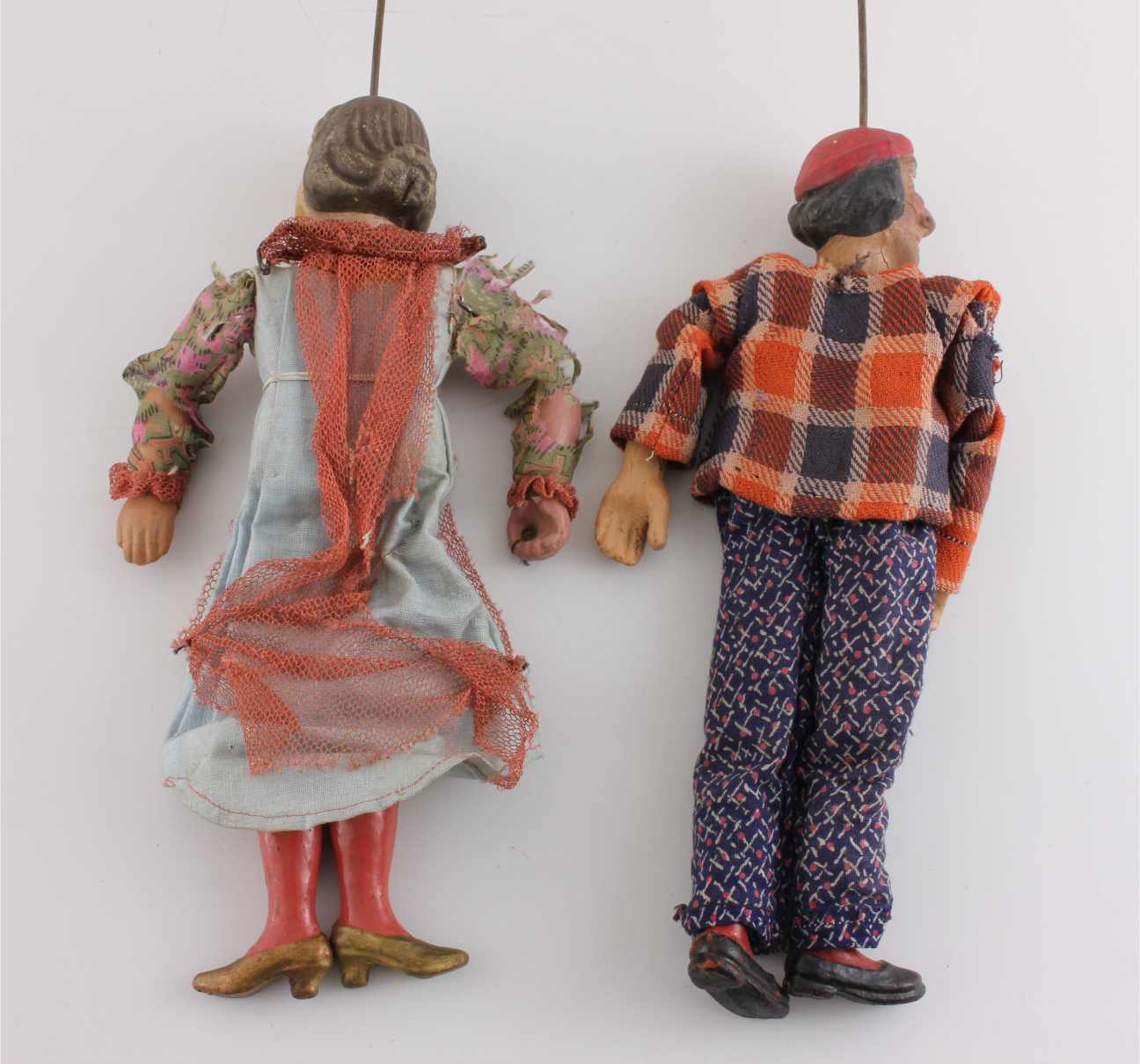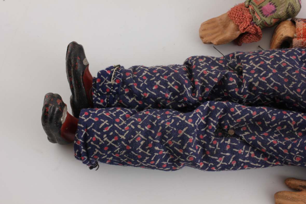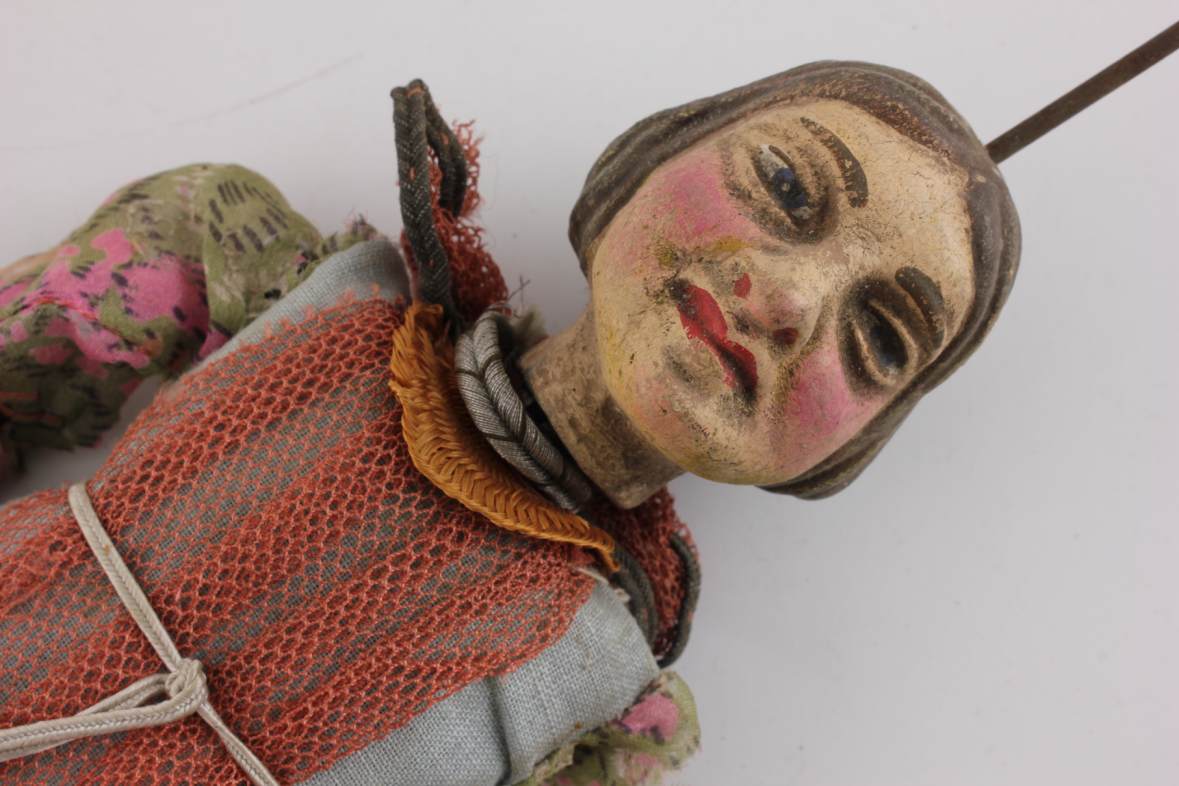 These rod marionette figures which date from the early 20th century have movable limbs and would have once had strings attached to the limbs running down from their wire and wood supports in order to make them move. A wire is attached to the support which runs down through their heads in order to control them.