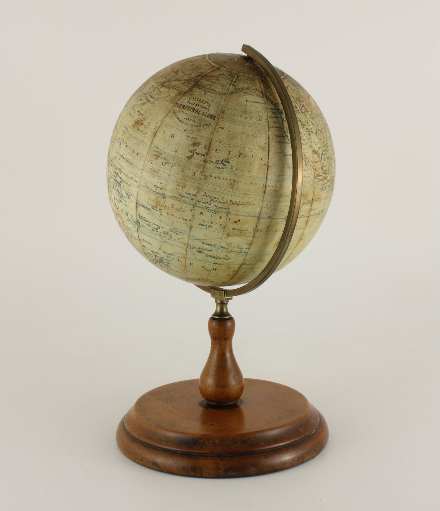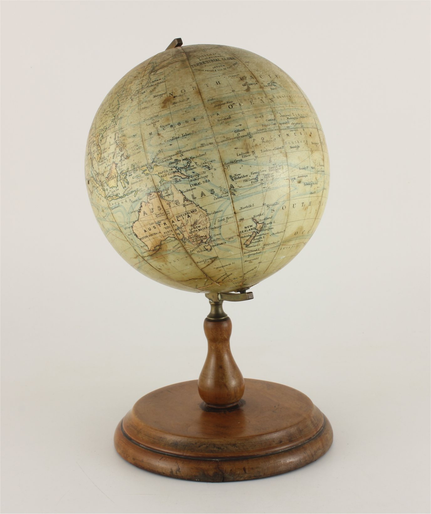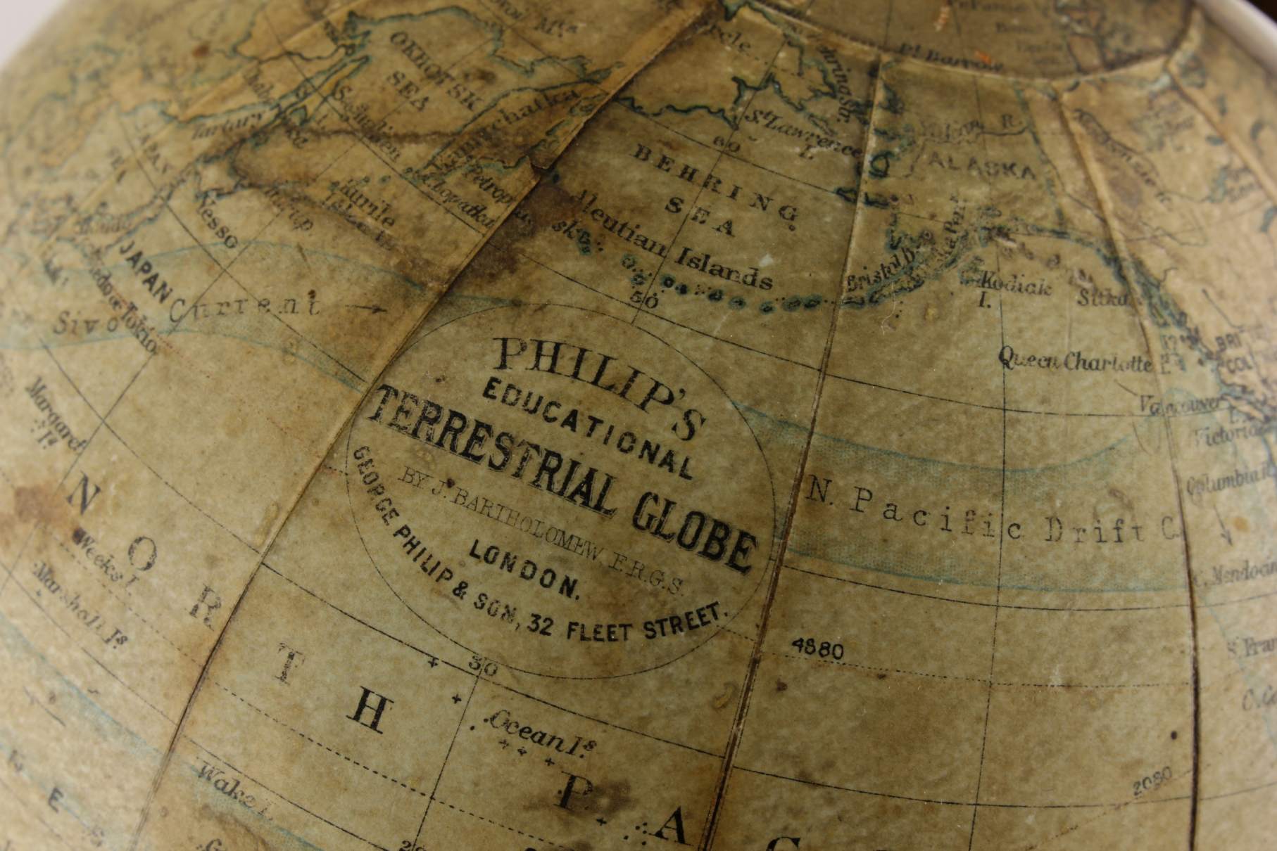 Printed on the globe is: Philip's Educational Terrestrial Globe by J Bartholomew FRGS London. George Philip & Son. 32 Fleet Street.