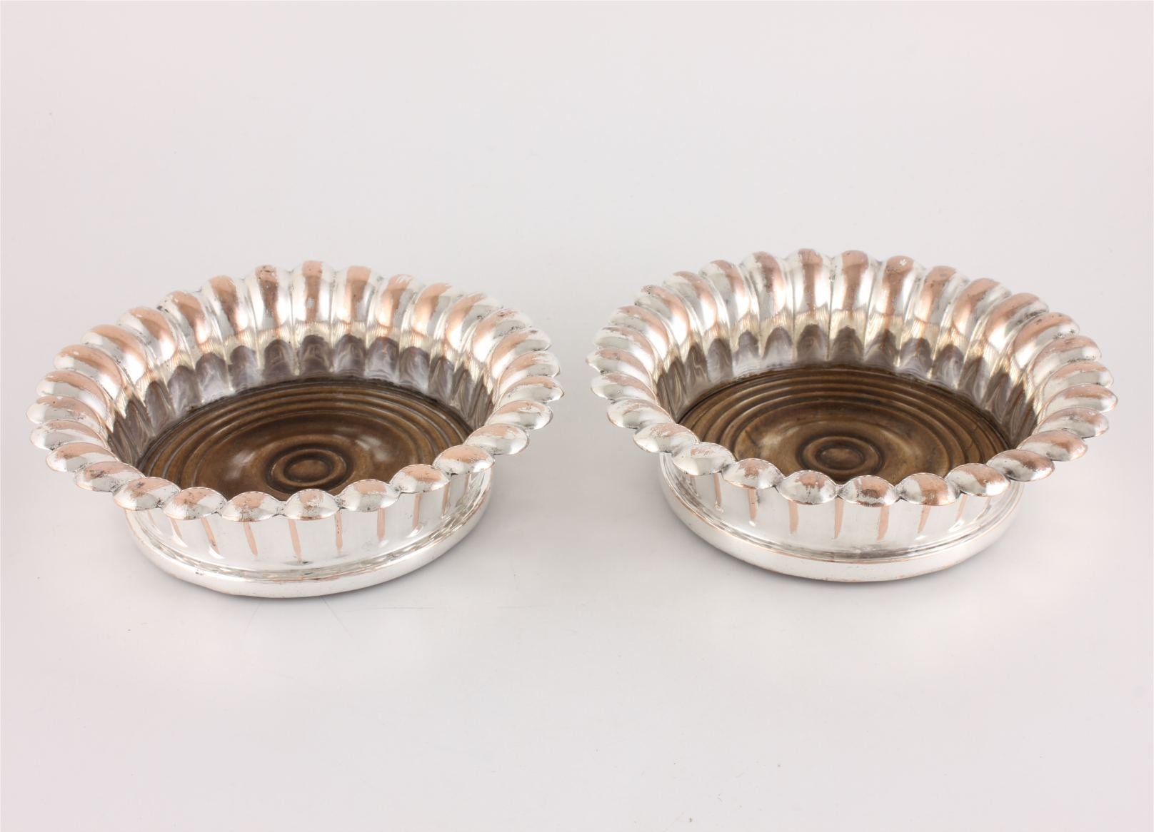 This fabulous pair of antique Champagne bottle coasters which are made of silver plate have wooden bases and date from the early 1800's.
