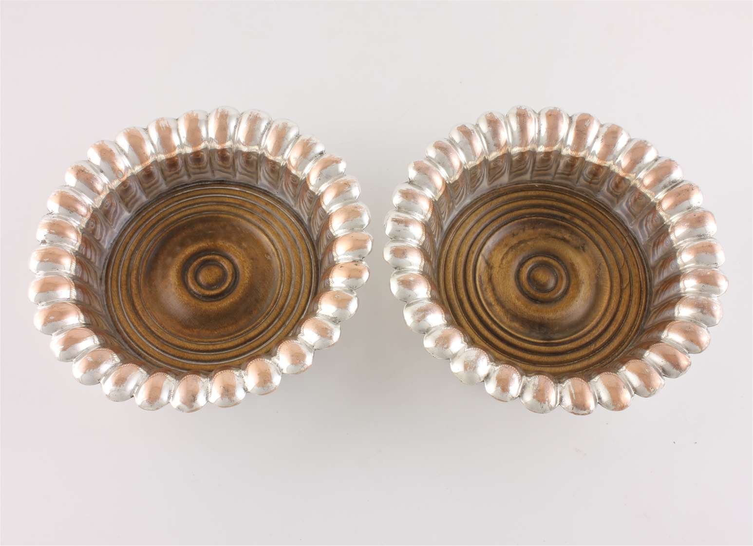 These two late Georgian wine bottle holders have fluted edges with some wear to the silver plate which shows a warm copper colour coming through adding to their wonderful antique look.