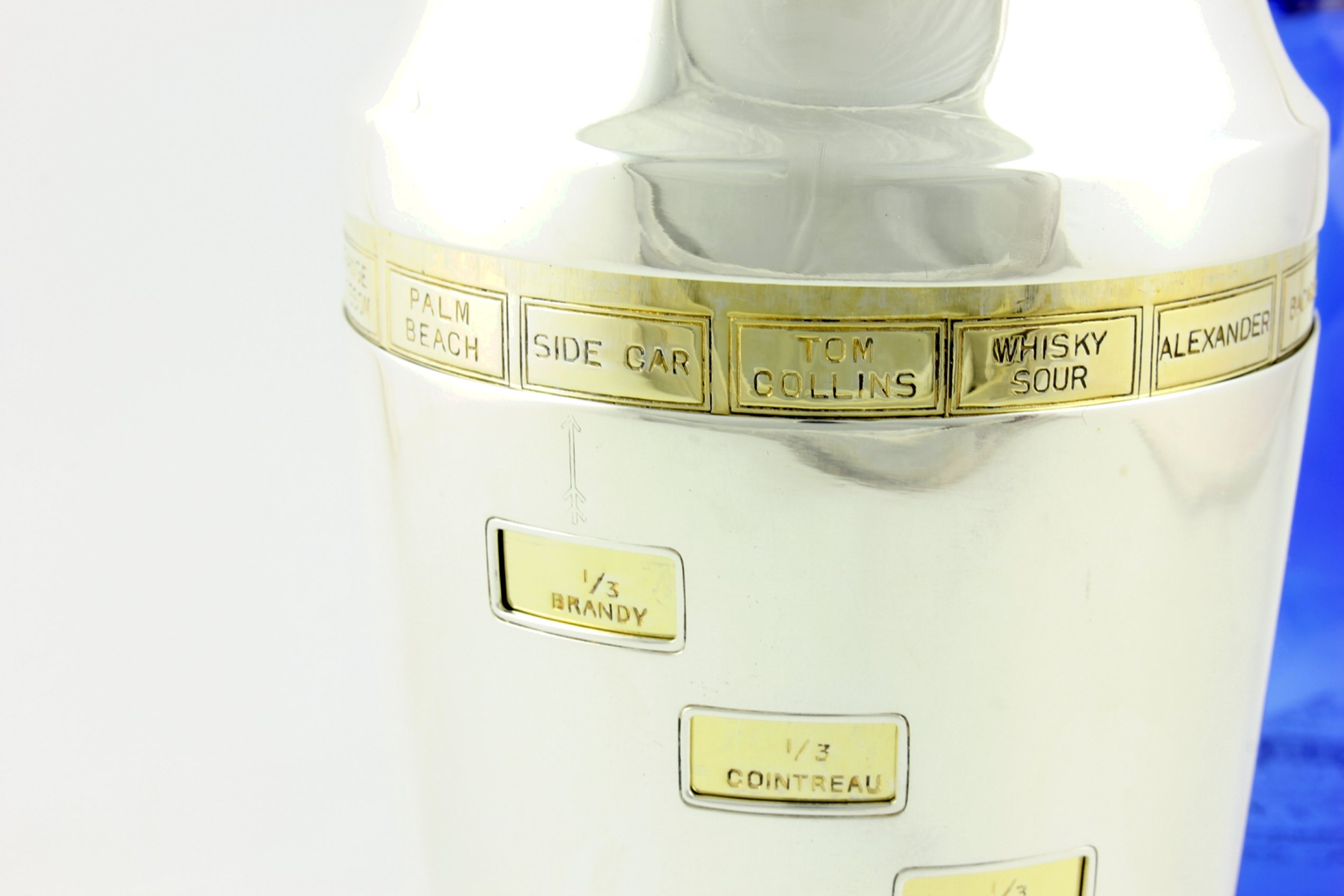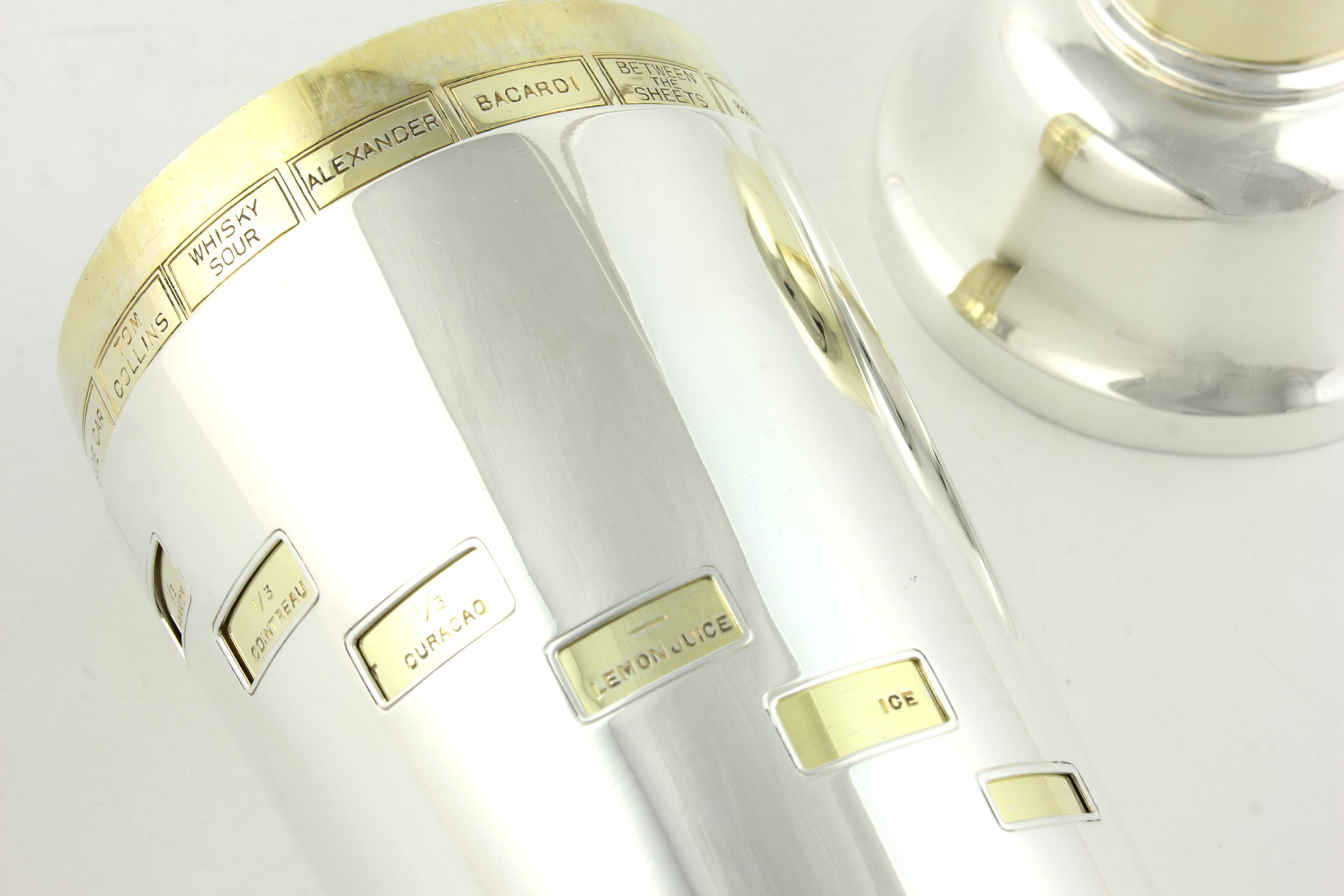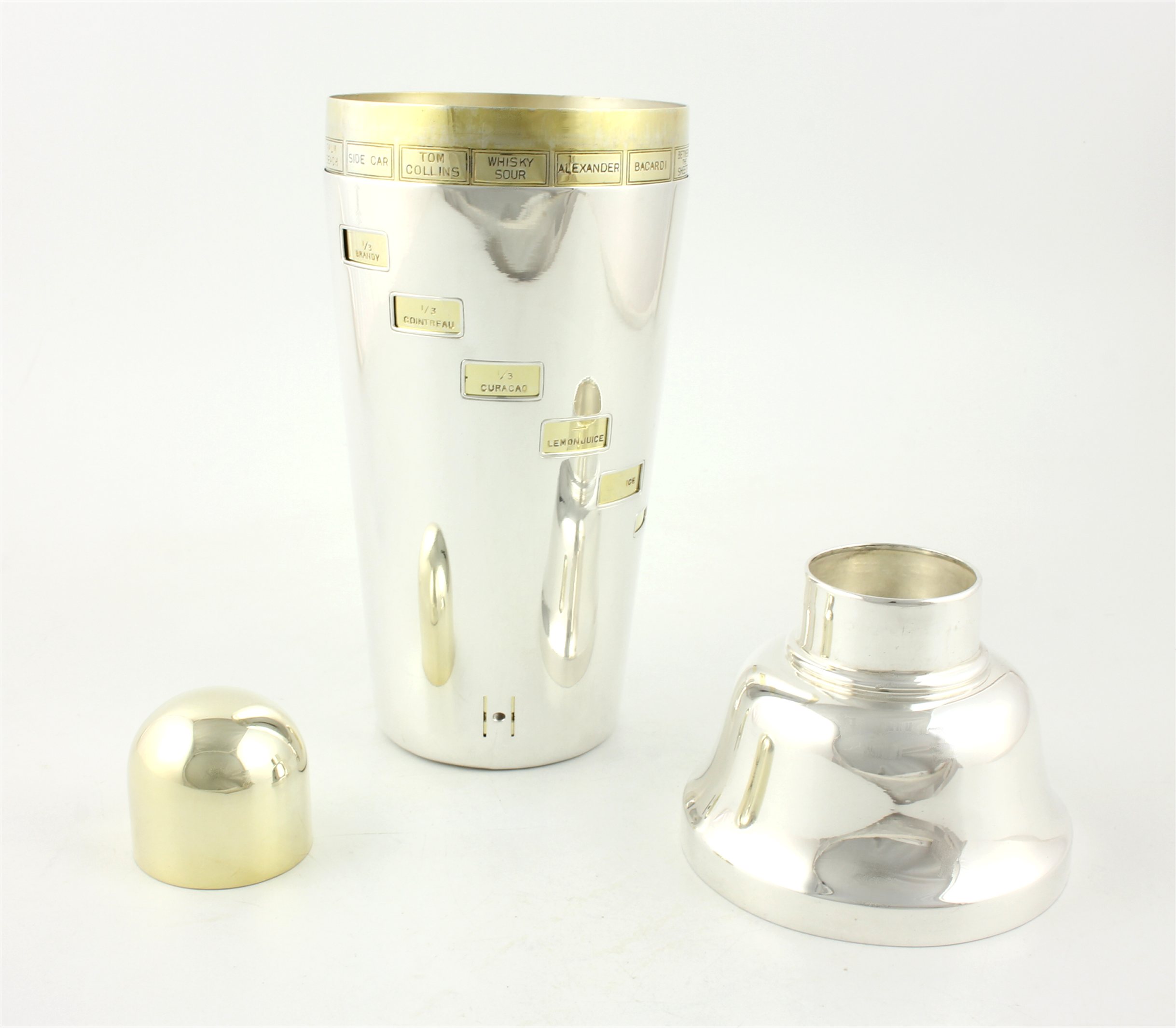 This stylish four piece Dial a Drink recipe cocktail shaker which is in wonderful original condition features a silver plated sleeve which fits over the gilded body, has a silver plated top strainer section, lightly gilded lid and is marked to the underside with Patented in Great Britain. Number 398119. Other Patents Pending.