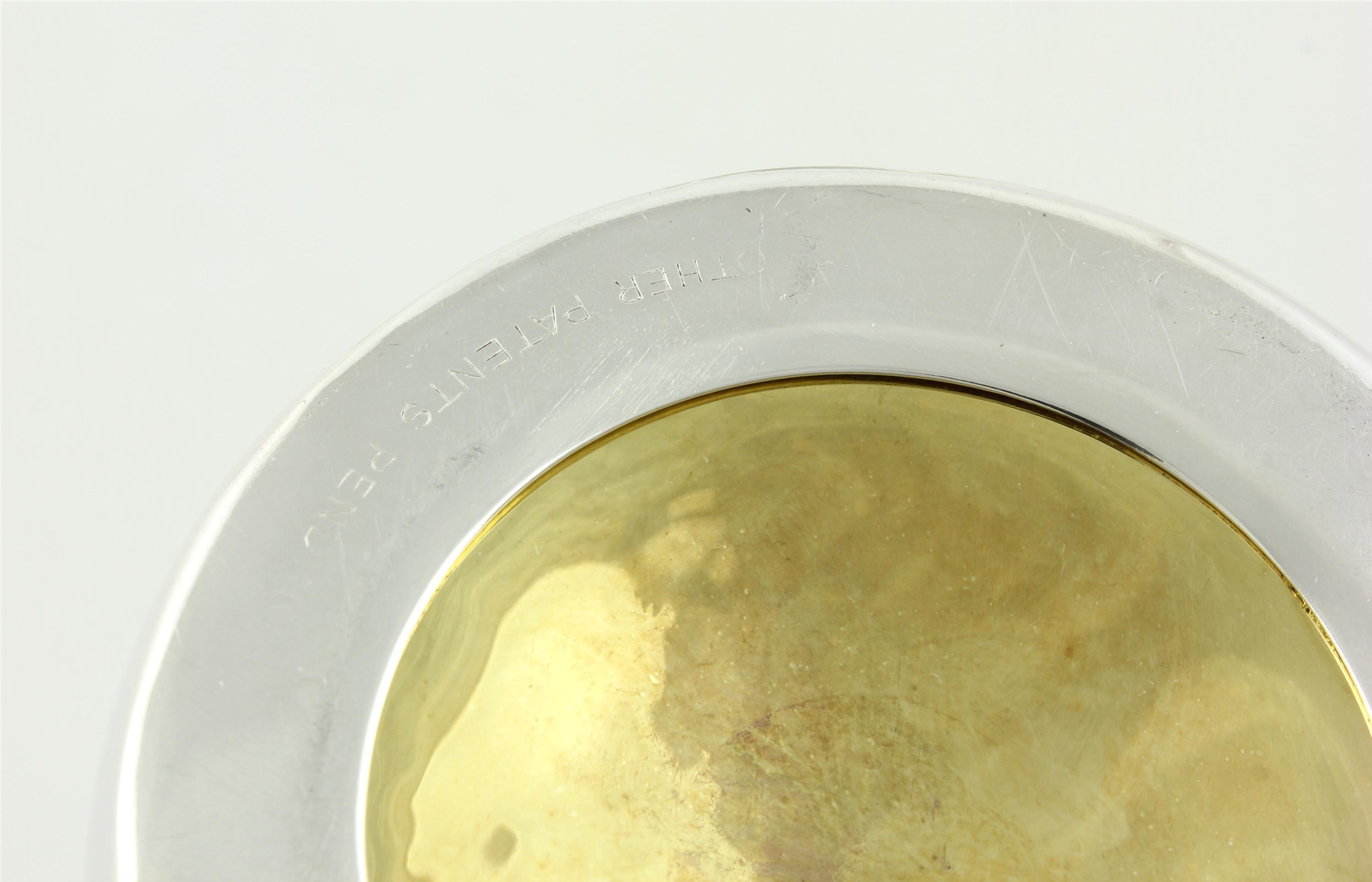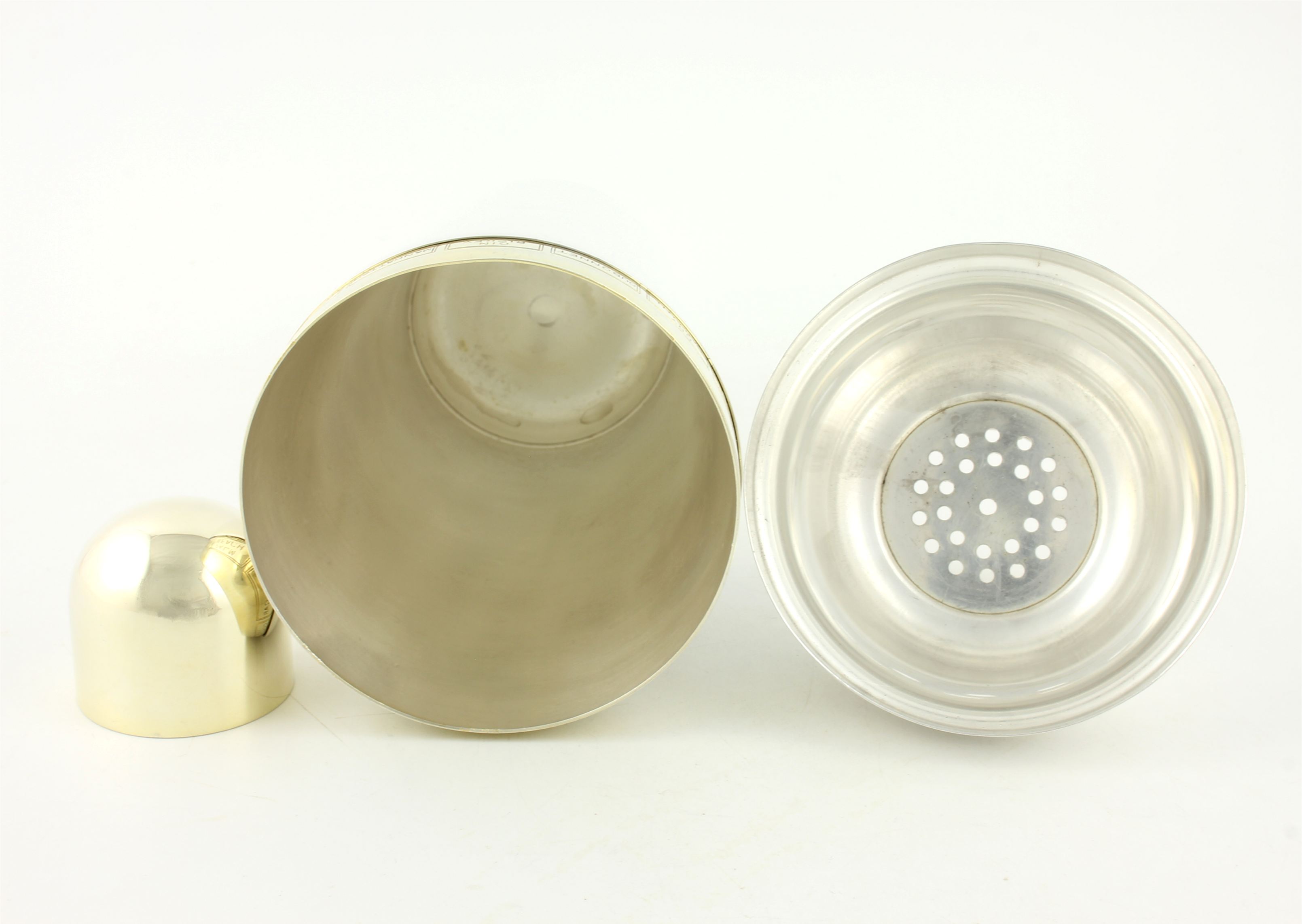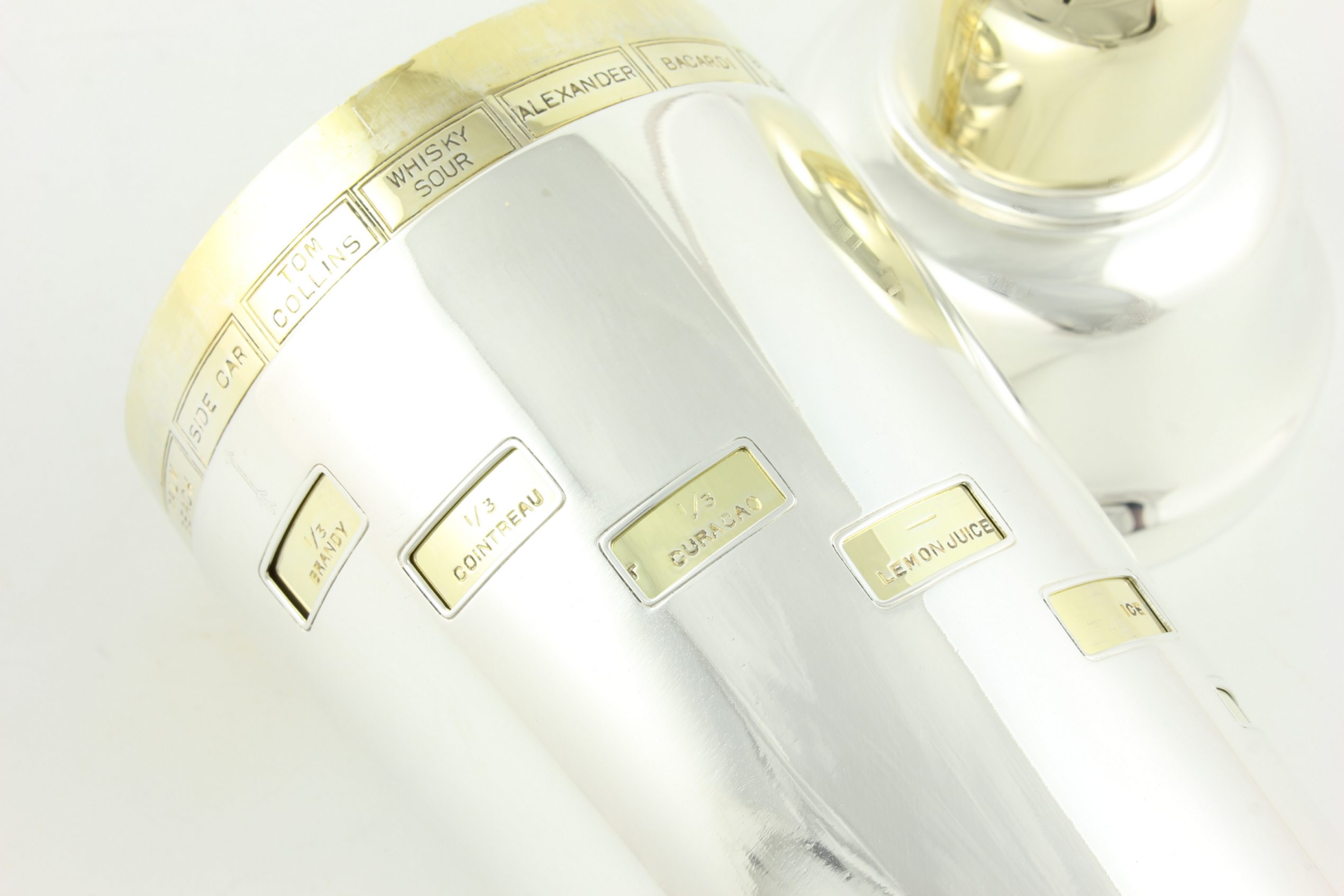 This stylish four piece Dial a Drink recipe cocktail shaker which is in wonderful original condition features a silver plated sleeve which fits over the gilded body, has a silver plated top strainer section, lightly gilded lid and is marked to the underside with Patented in Great Britain. Number 398119. Other Patents Pending.