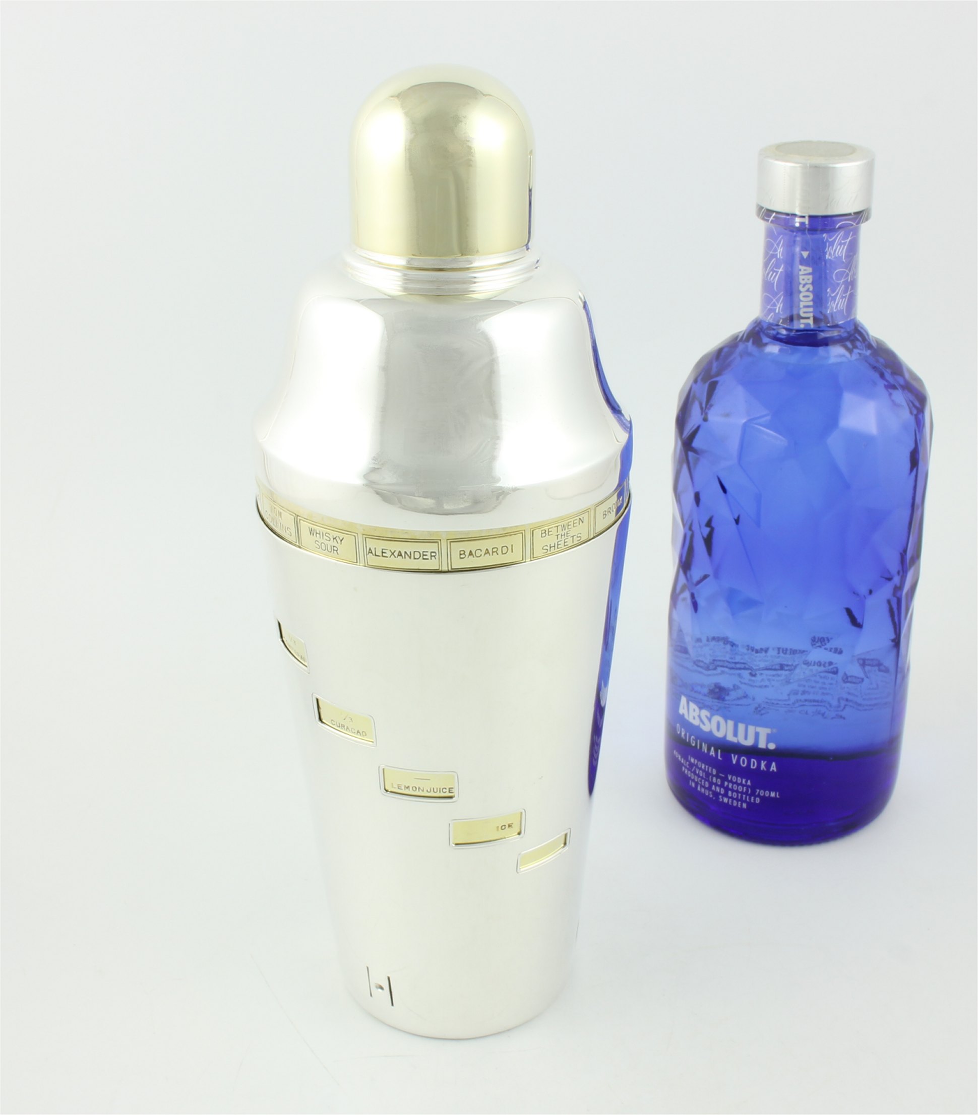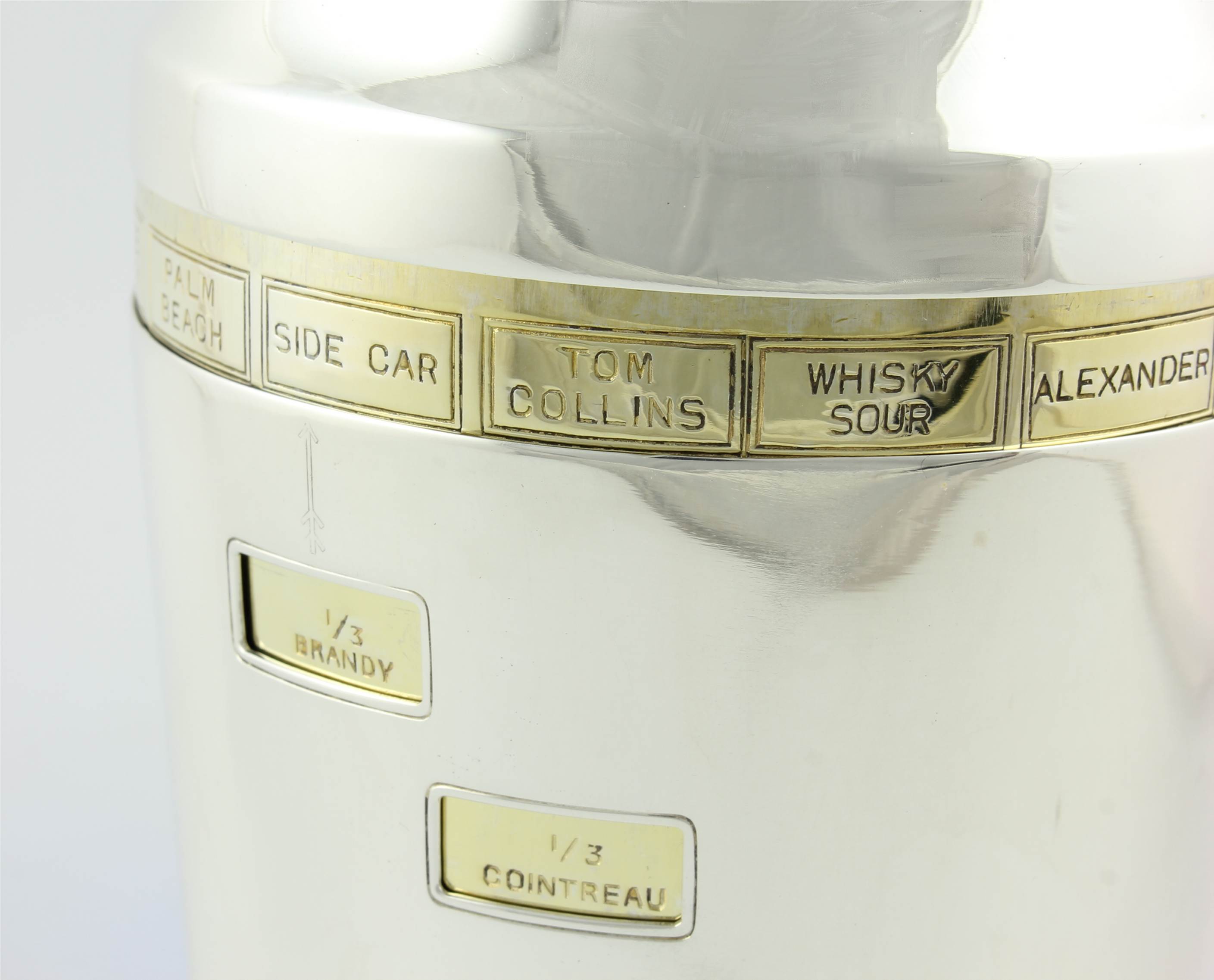 This Art Deco cocktail shaker which is a nice large size shows 15 cocktail choices engraved around the body. Once you have chosen your cocktail by pointing to it with the arrow, the ingredients are shown in the windows below.