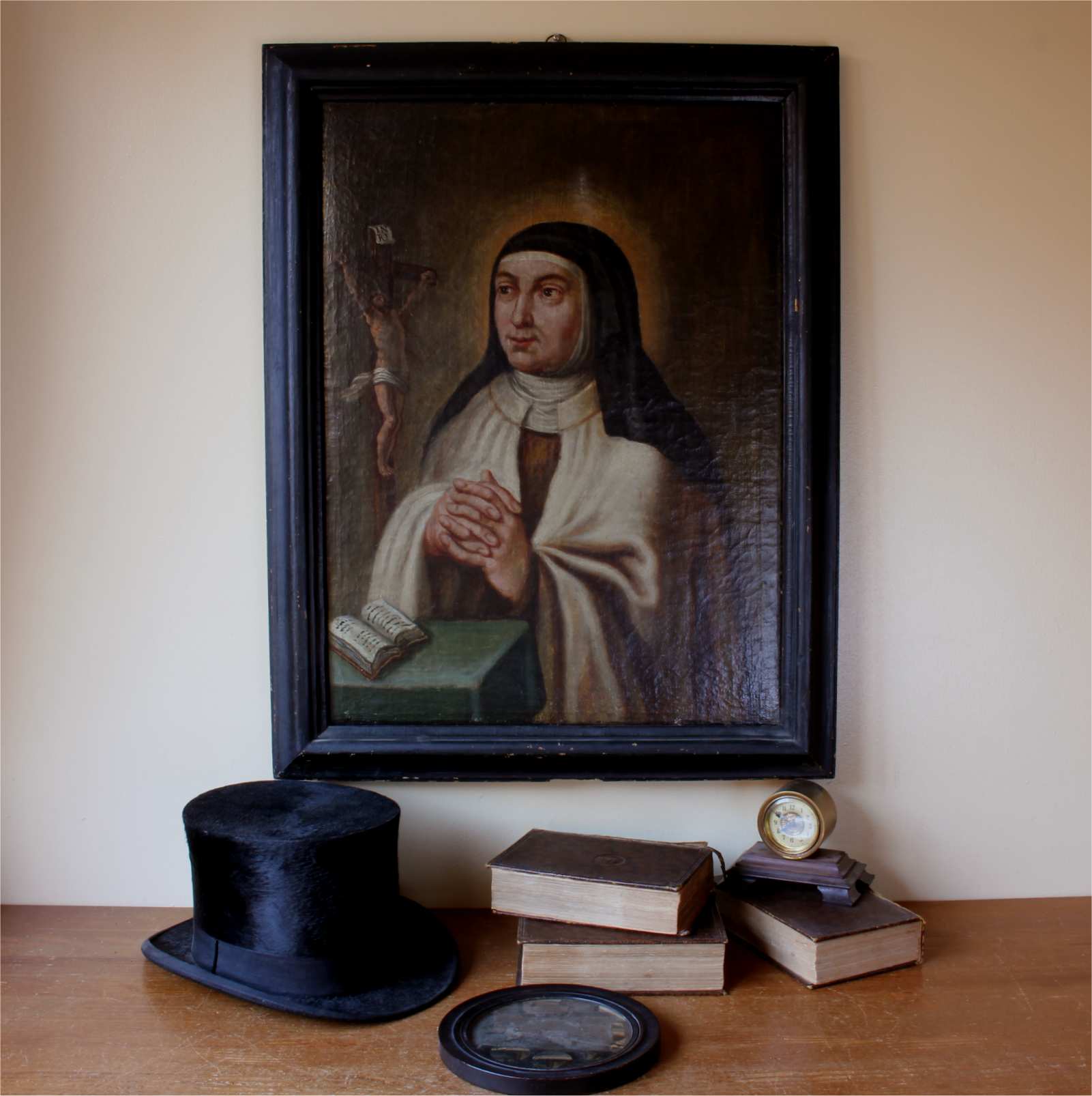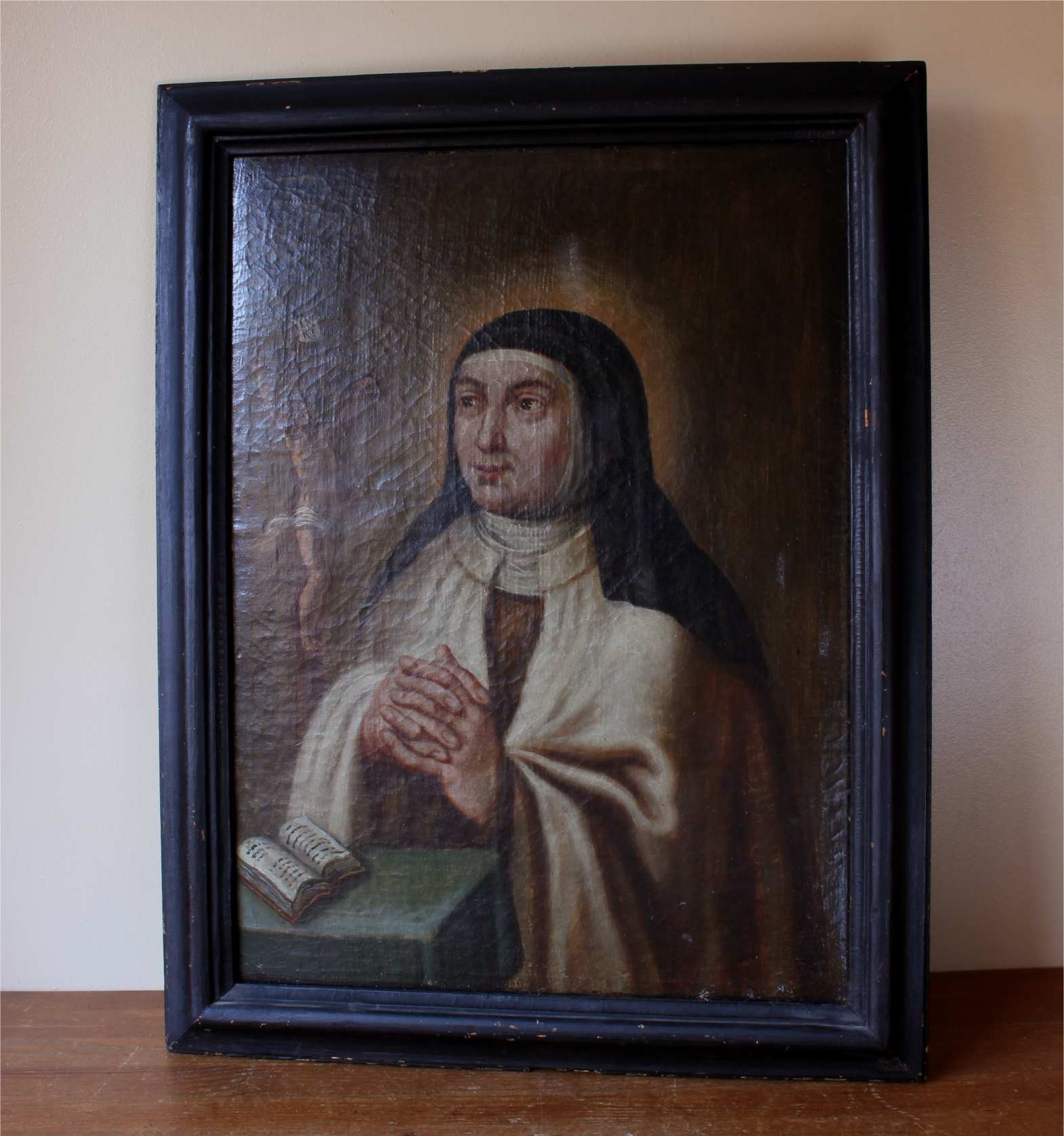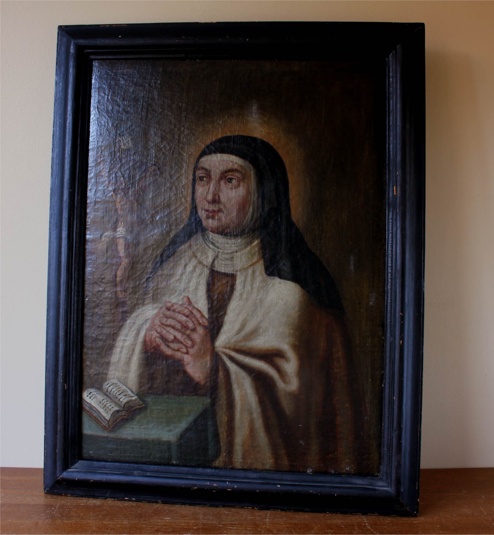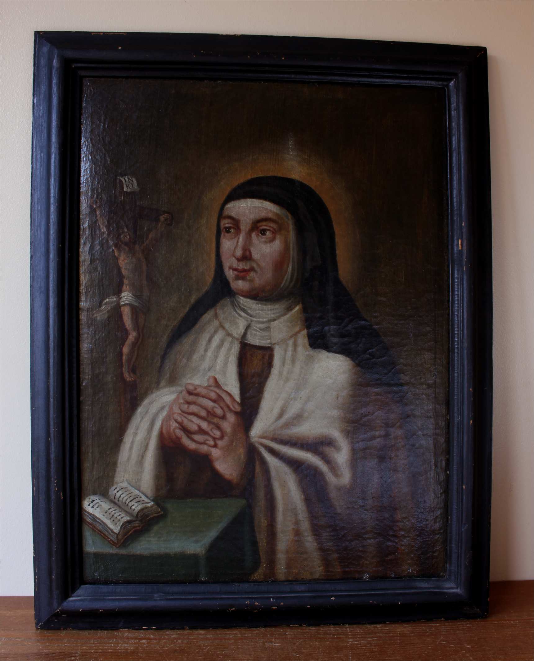 This nice decorative antique oil painting of St Teresa praying and looking up to Christ is an oil on canvas and is mounted in a wood frame.