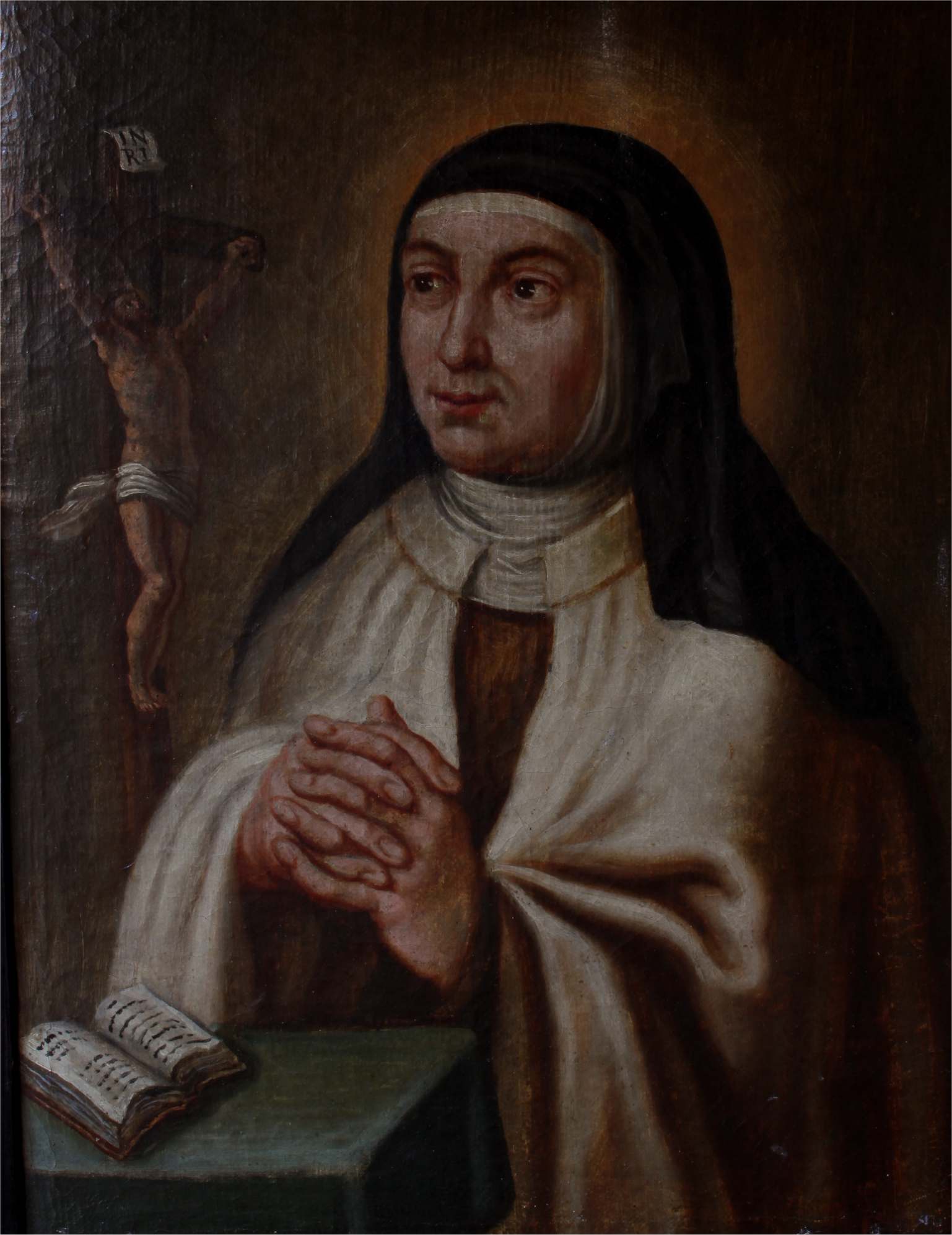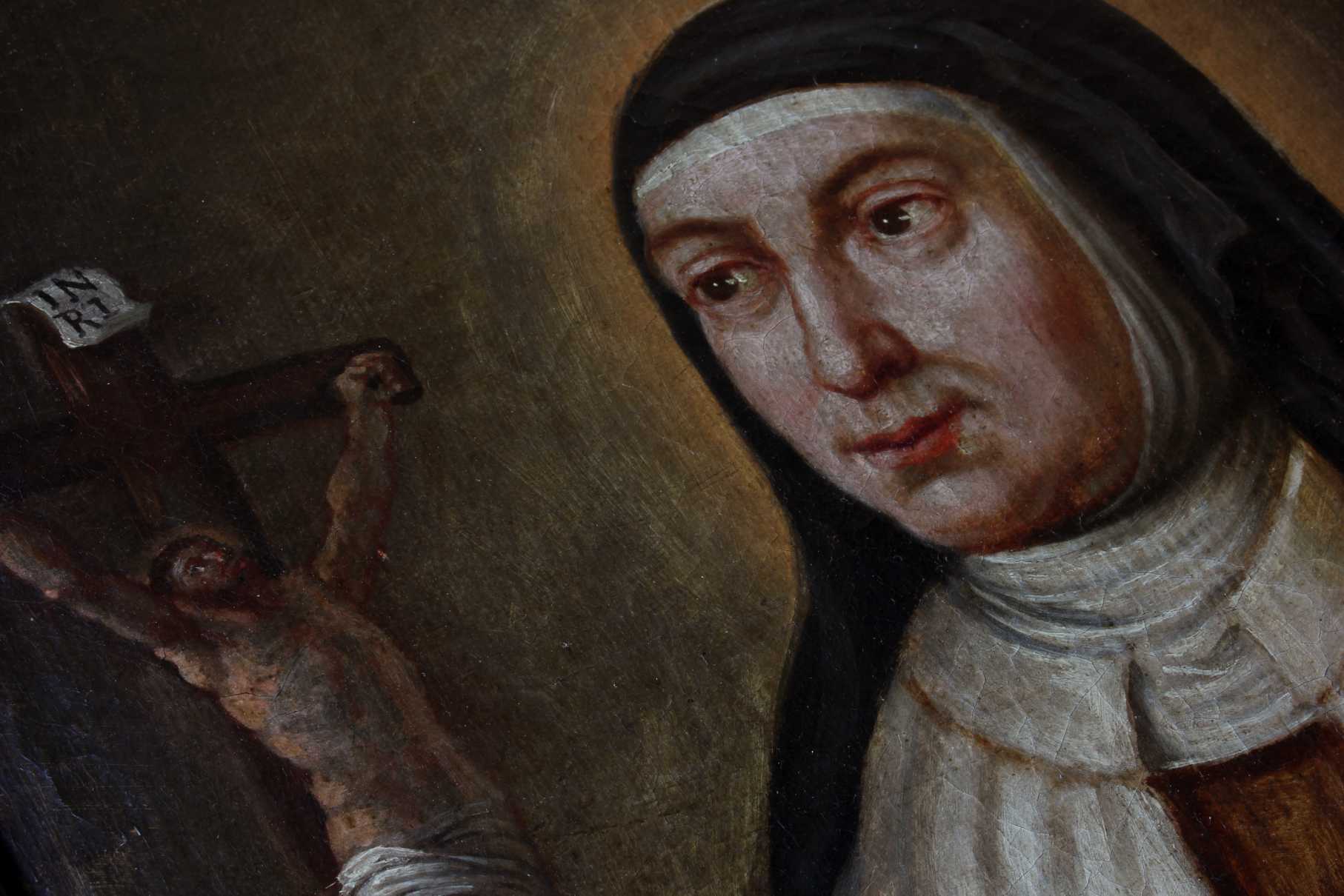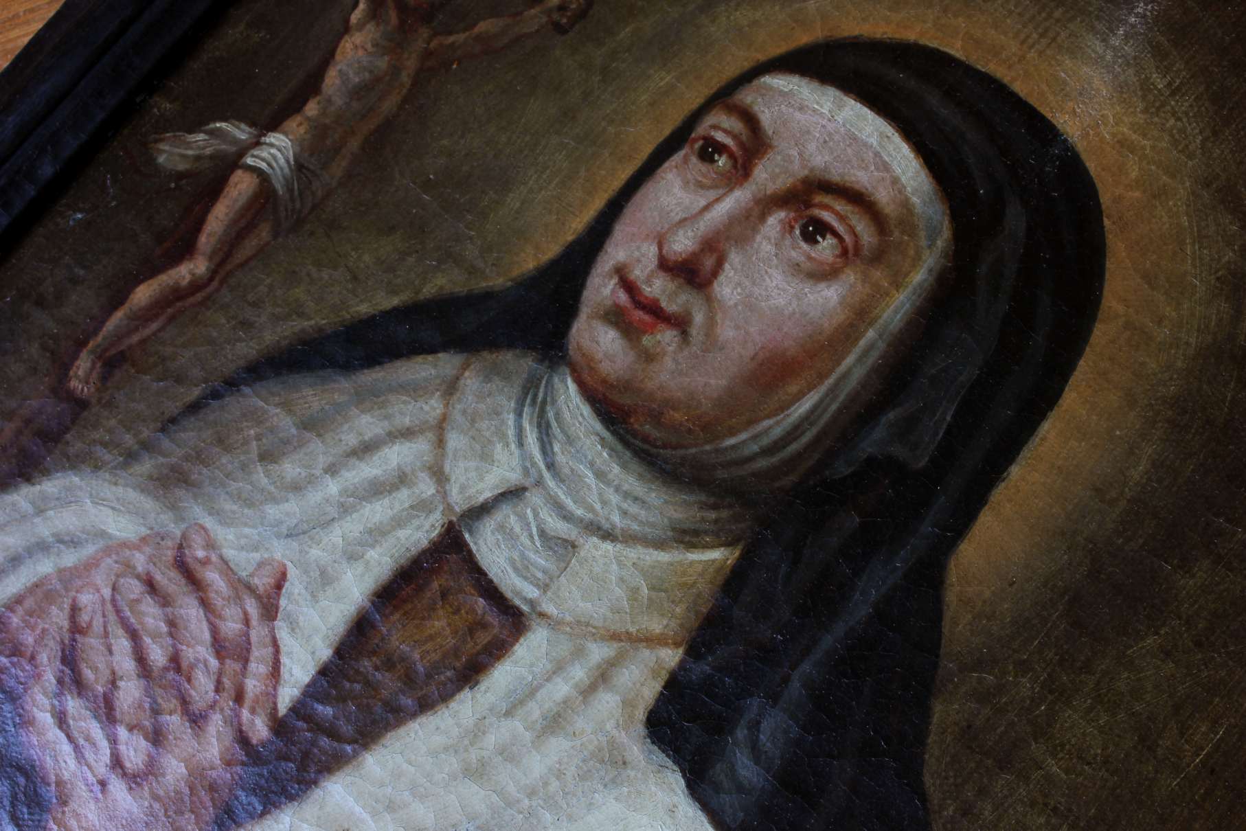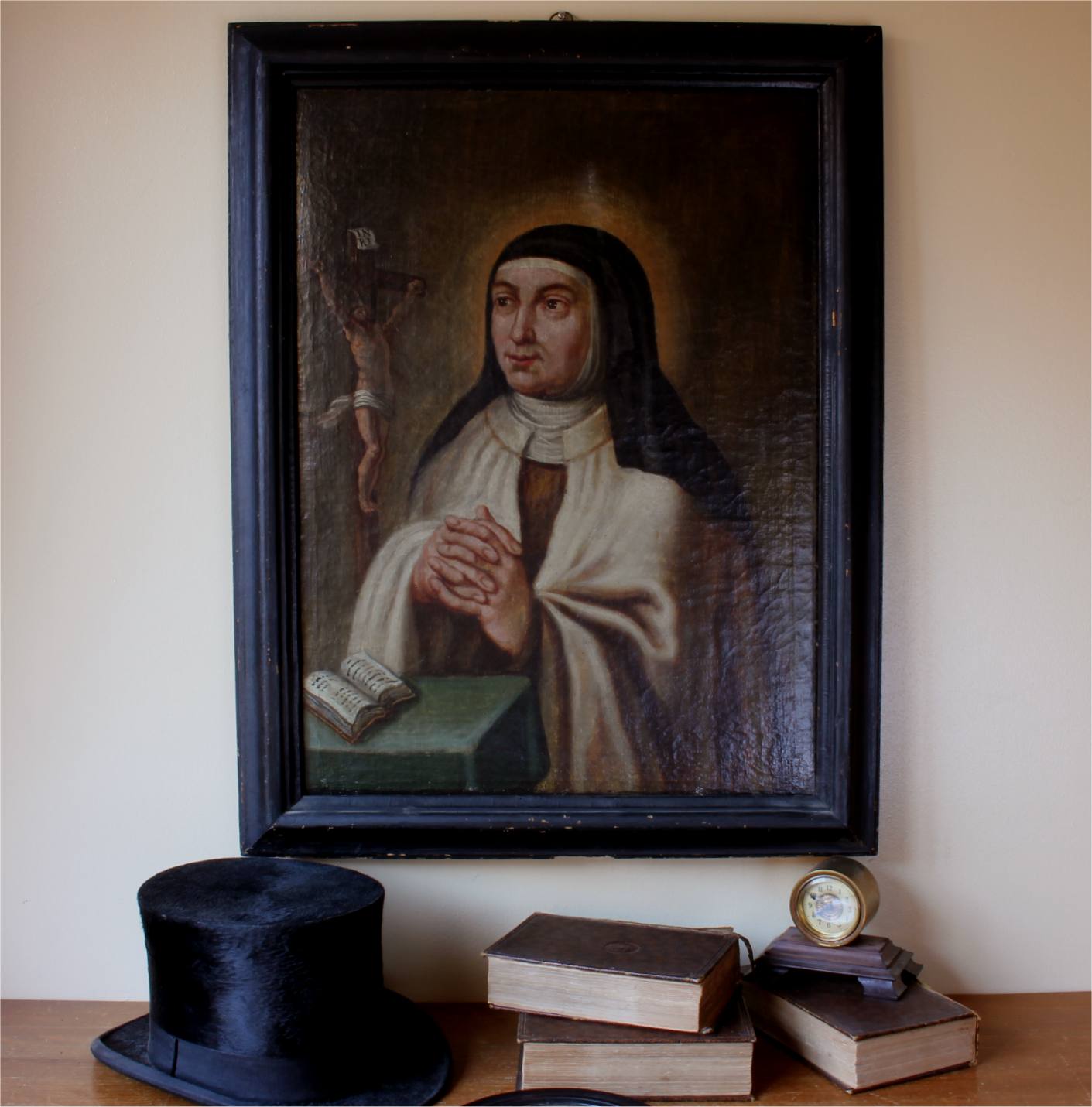 This nice decorative antique oil painting of St Teresa praying and looking up to Christ is an oil on canvas and is mounted in a wood frame.