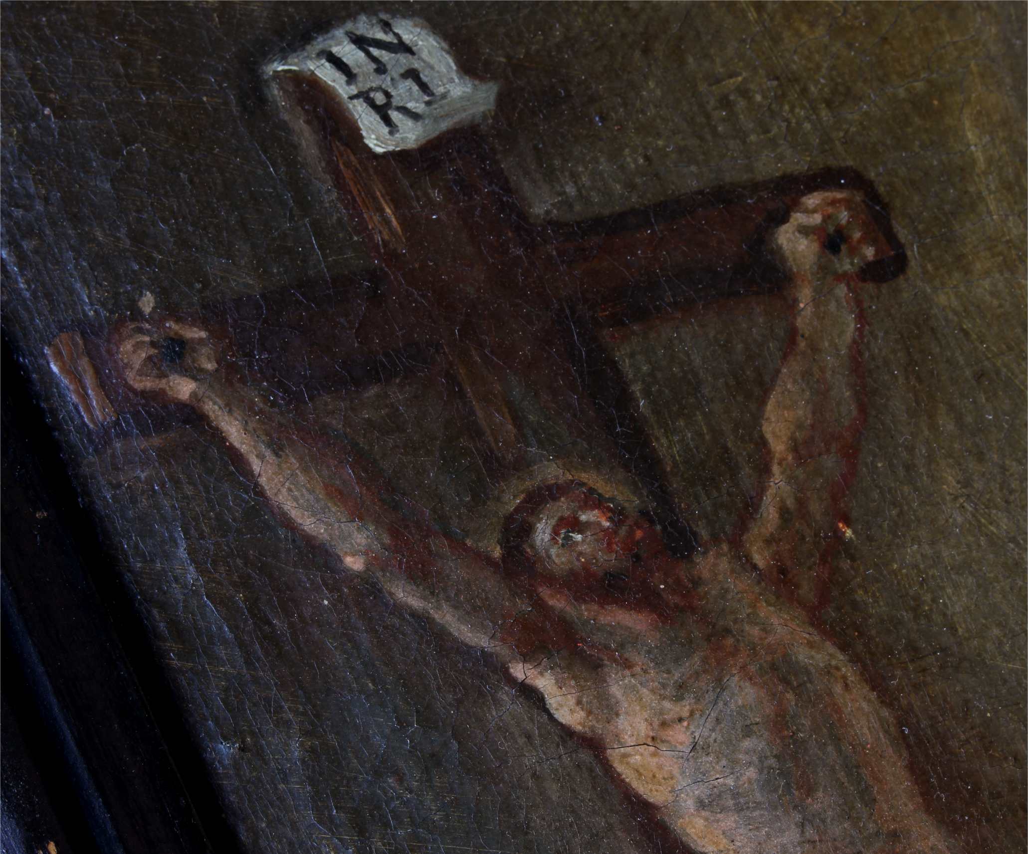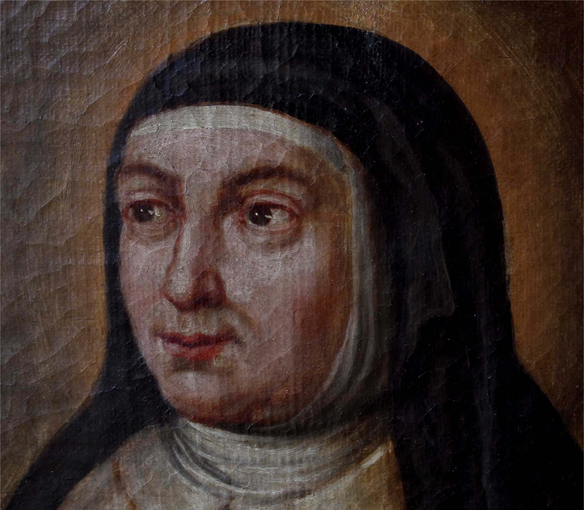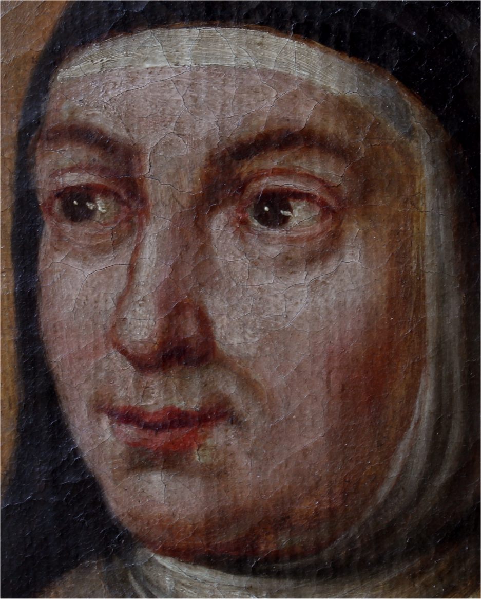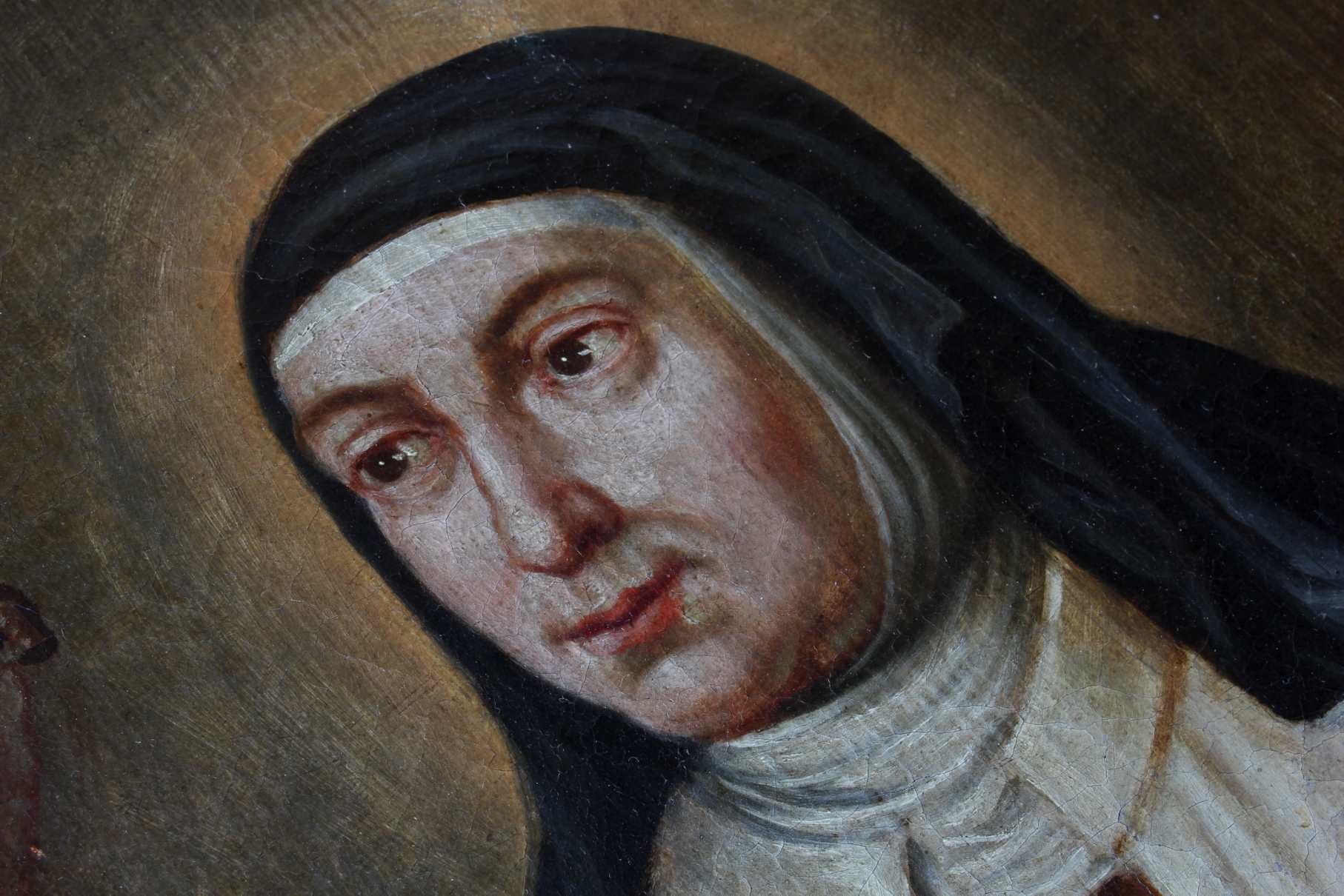 This nice decorative antique oil painting of St Teresa praying and looking up to Christ is an oil on canvas and is mounted in a wood frame.