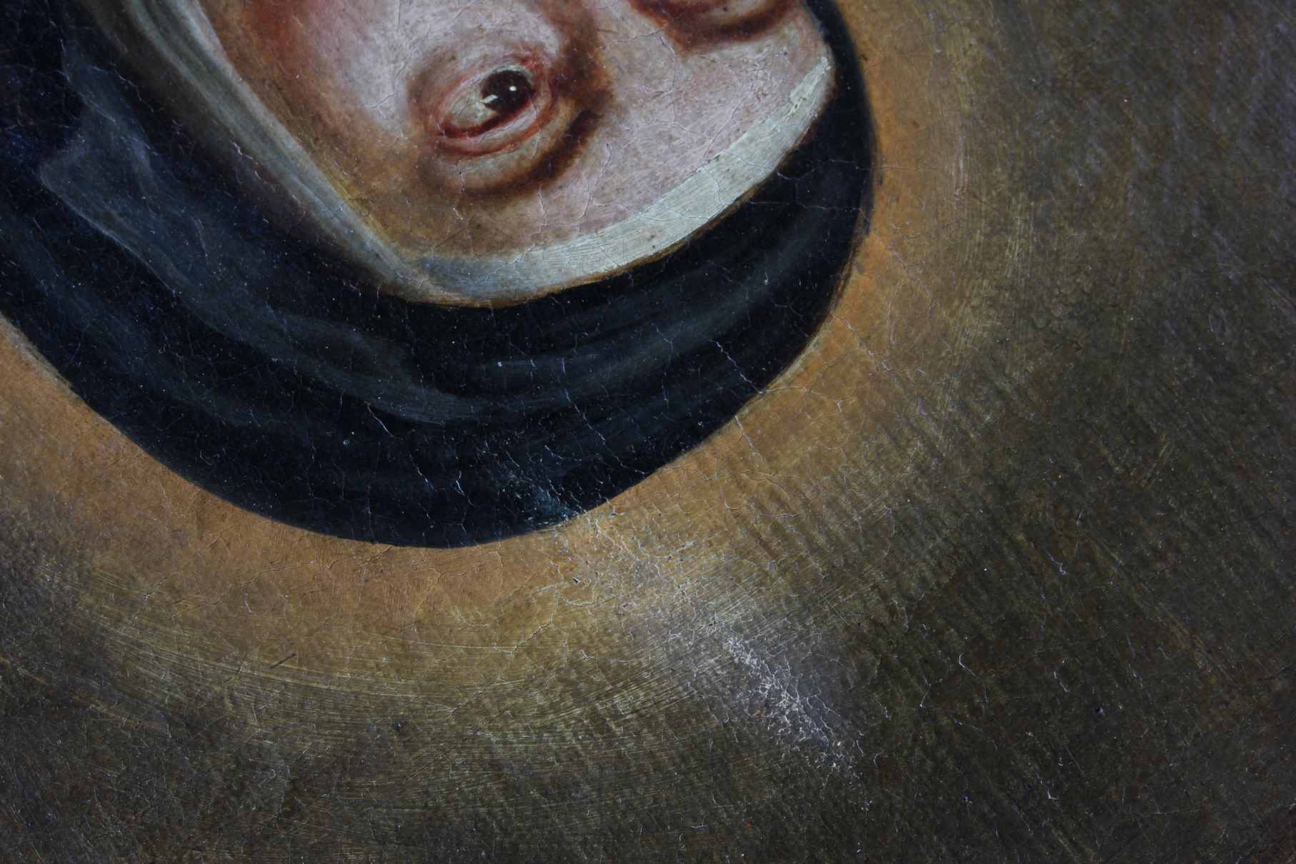 This nun painting displays well due to the striking way it has been painted and with it's aged look would make a wonderful decorative piece of antique religious art.