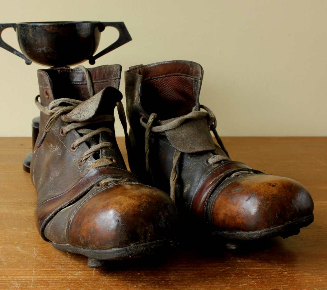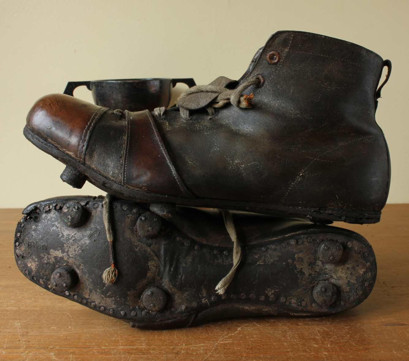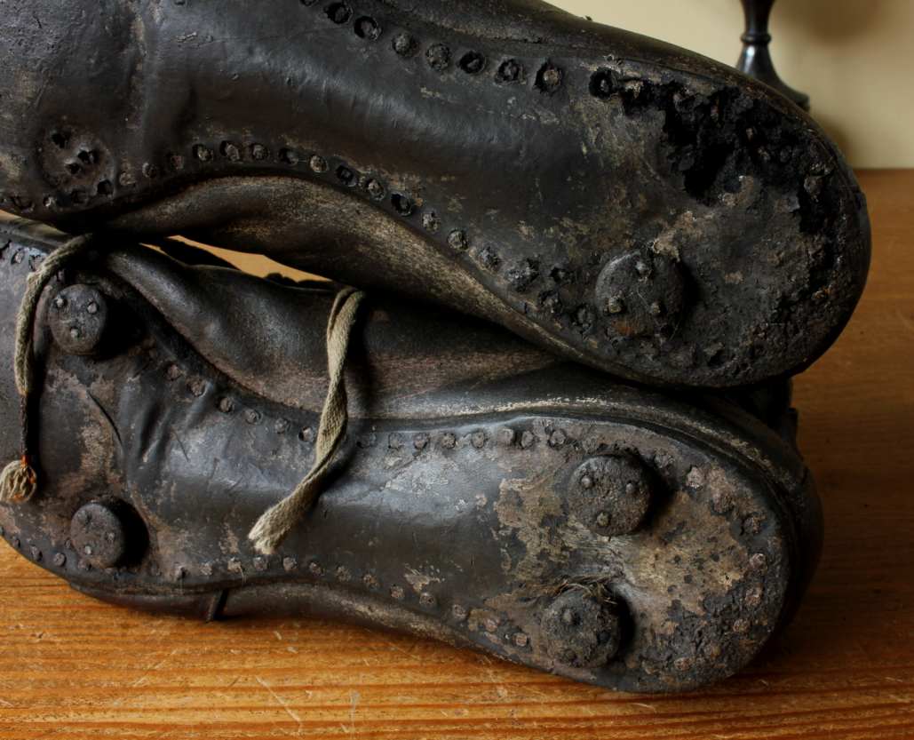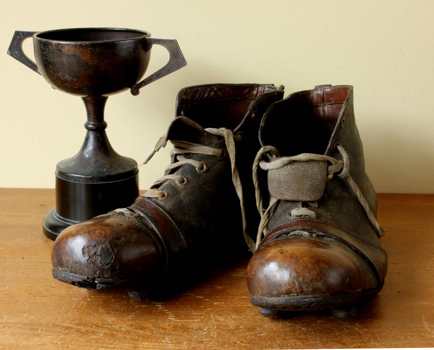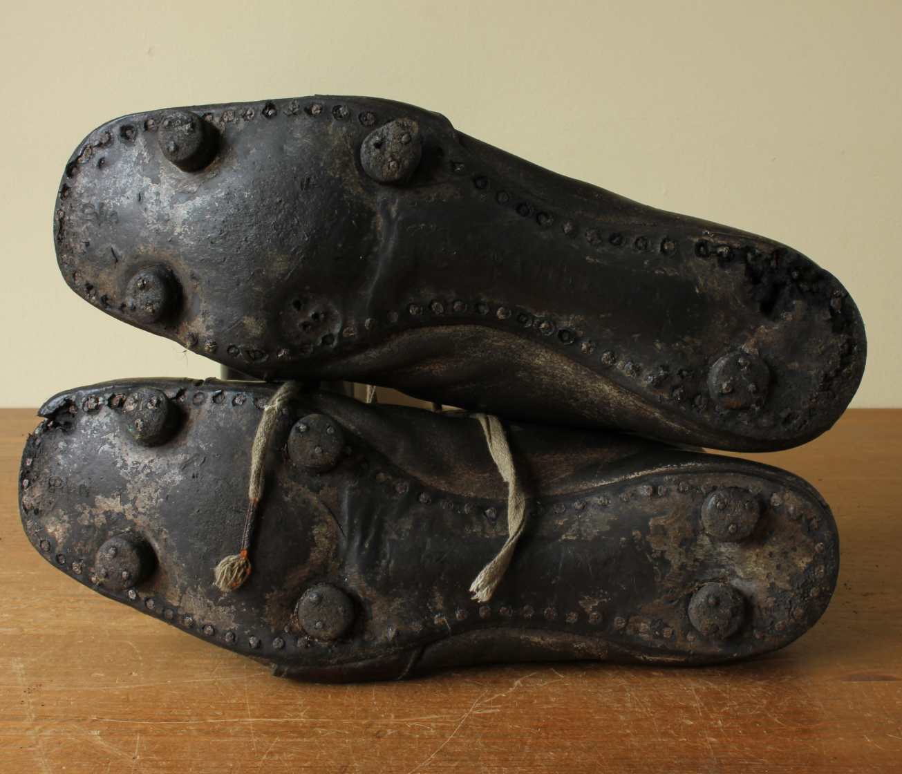 This handsome pair of vintage / antique football boots which have lots of age related wear are made of brown leather with leather soles, nailed on studs and date from c1930.