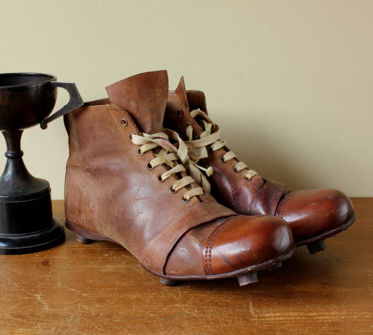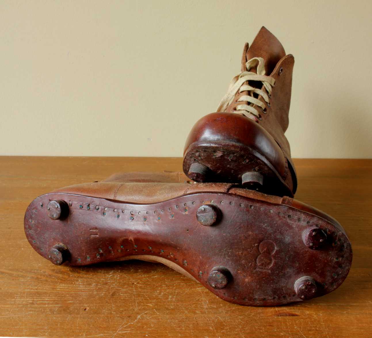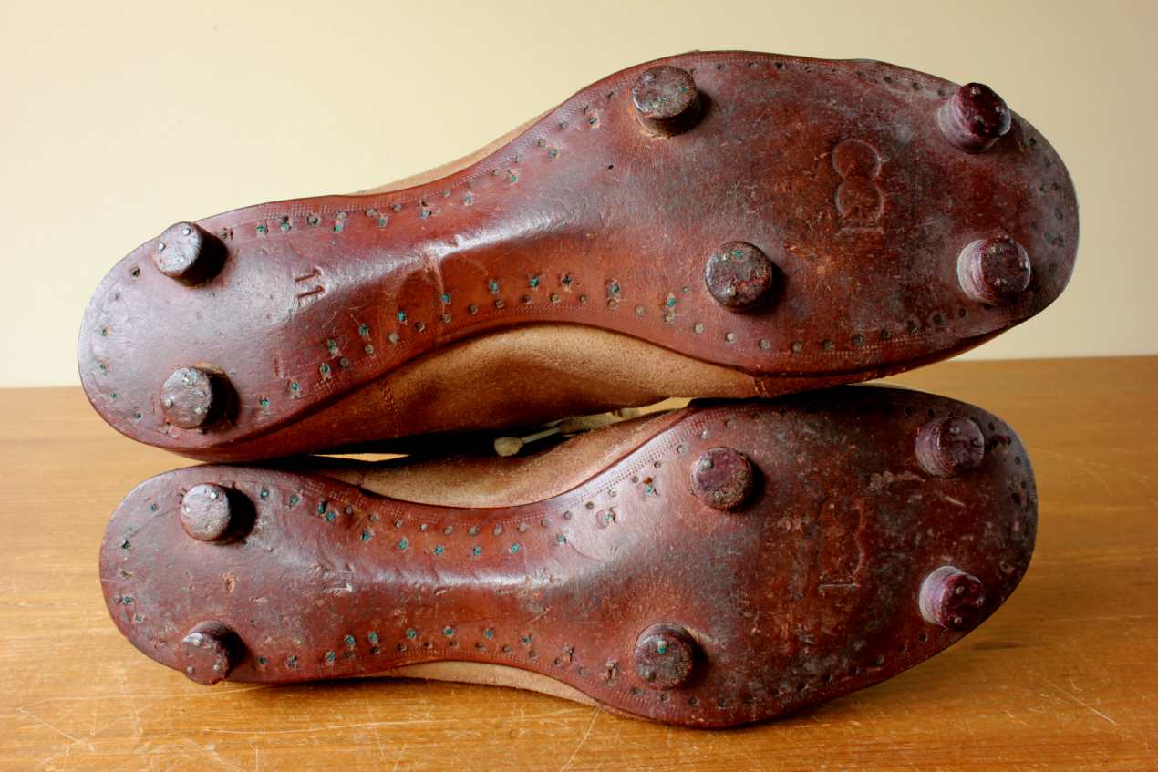 This very nice pair of vintage / antique football boots which are made of brown leather with leather soles and nailed on studs date from the 1940's and are a large size being an adults size 11.