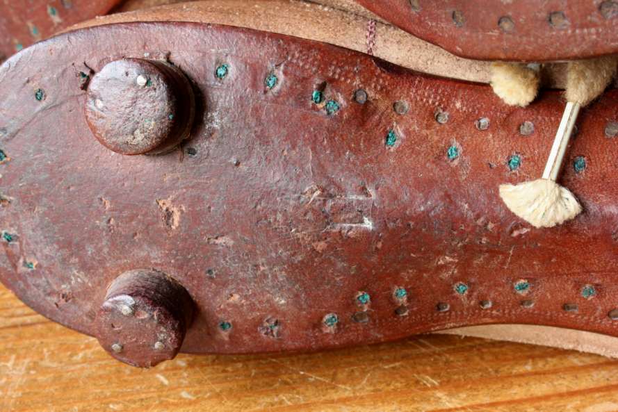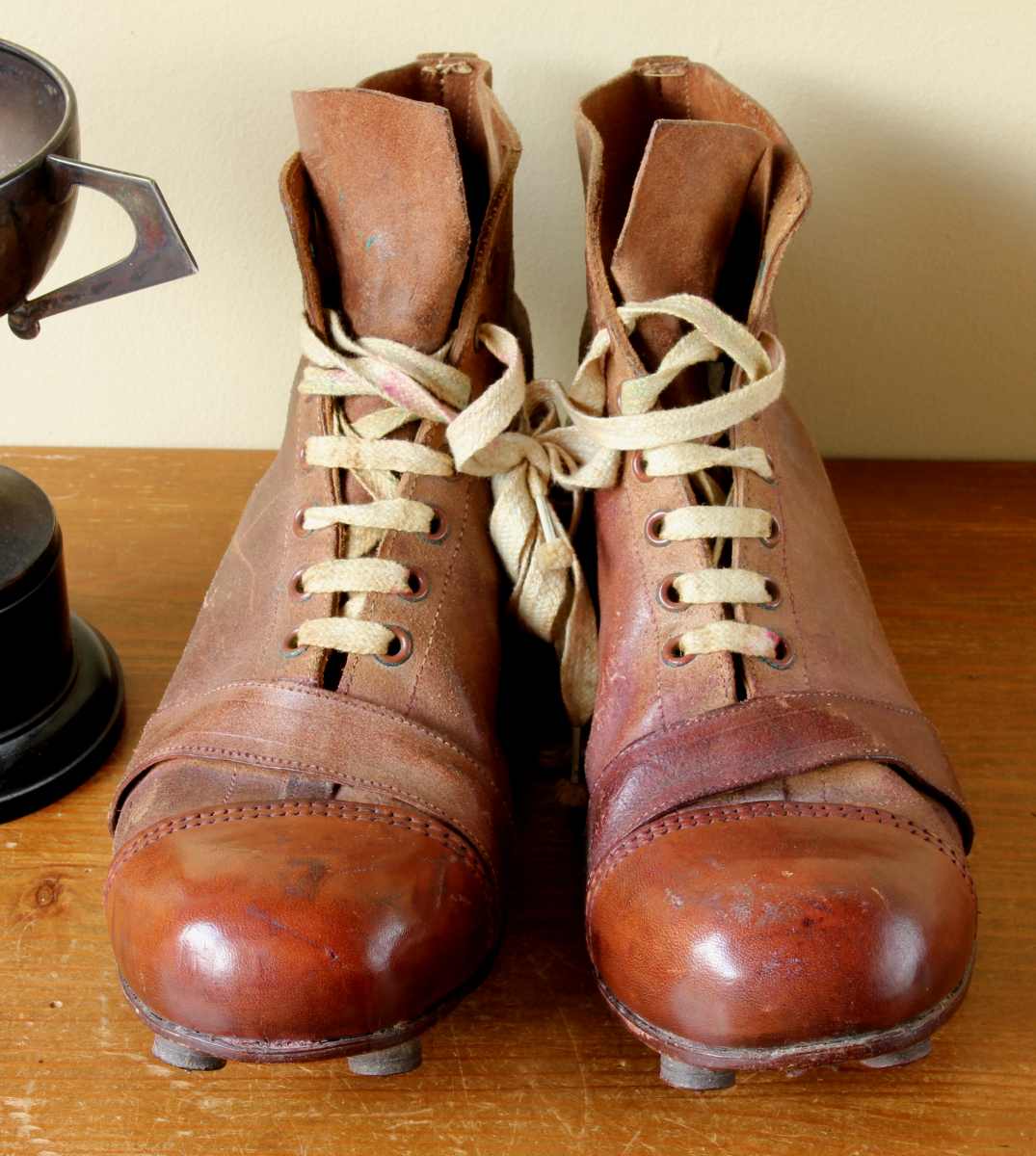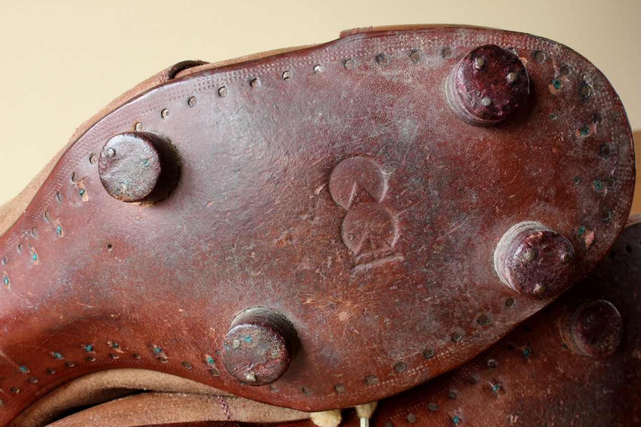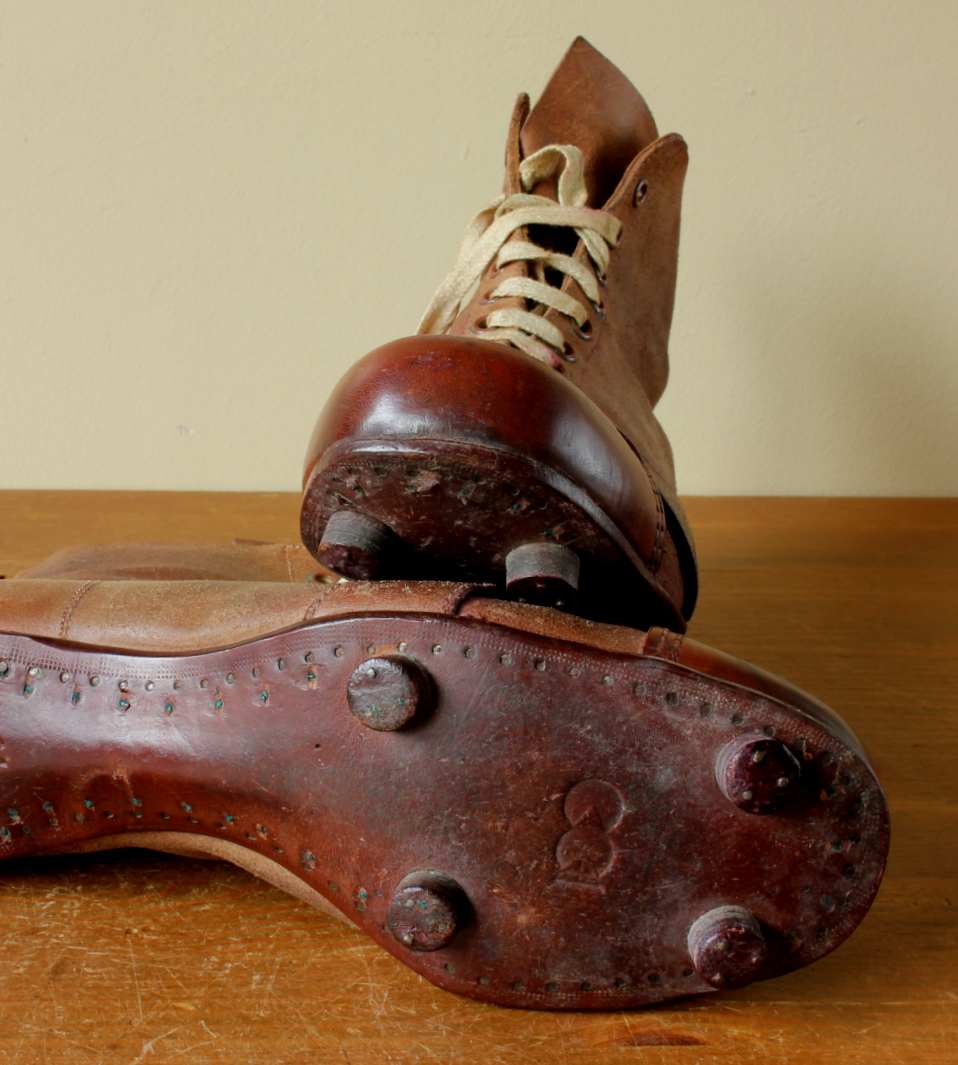 This very nice pair of vintage / antique football boots which are made of brown leather with leather soles and nailed on studs date from the 1940's and are a large size being an adults size 11.