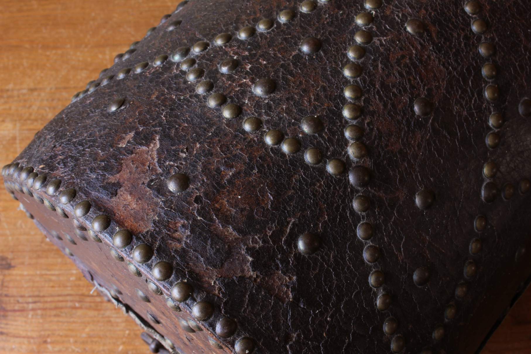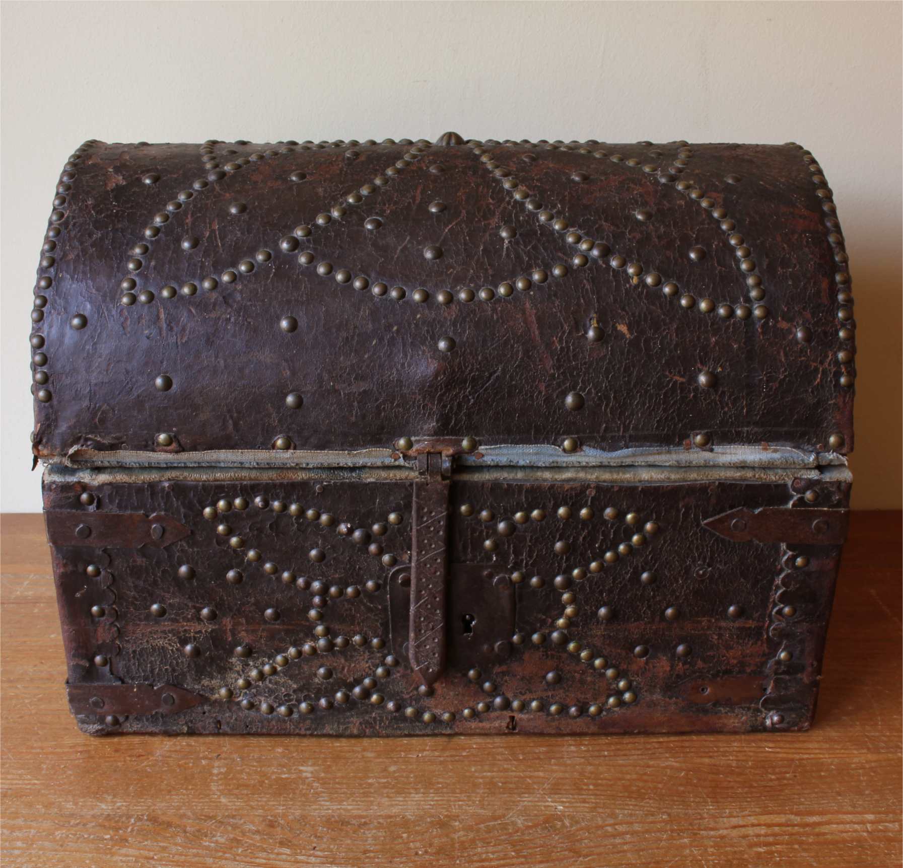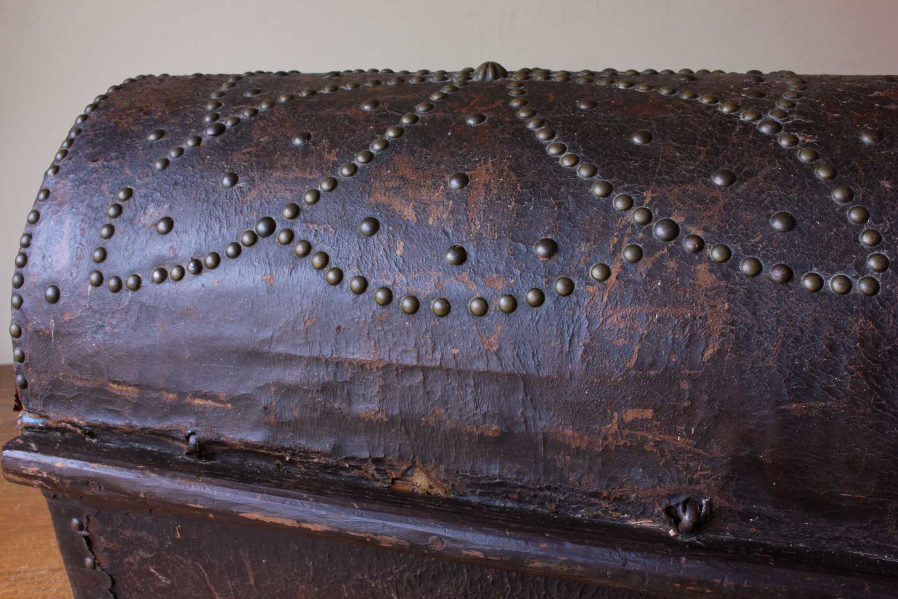 This fabulous Spanish brown leather trunk with beautiful brass stud-work which includes floral studs has a domed lid and dates from the late 17th / early 18th century.