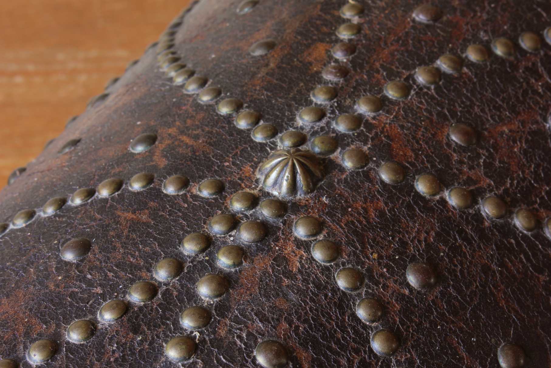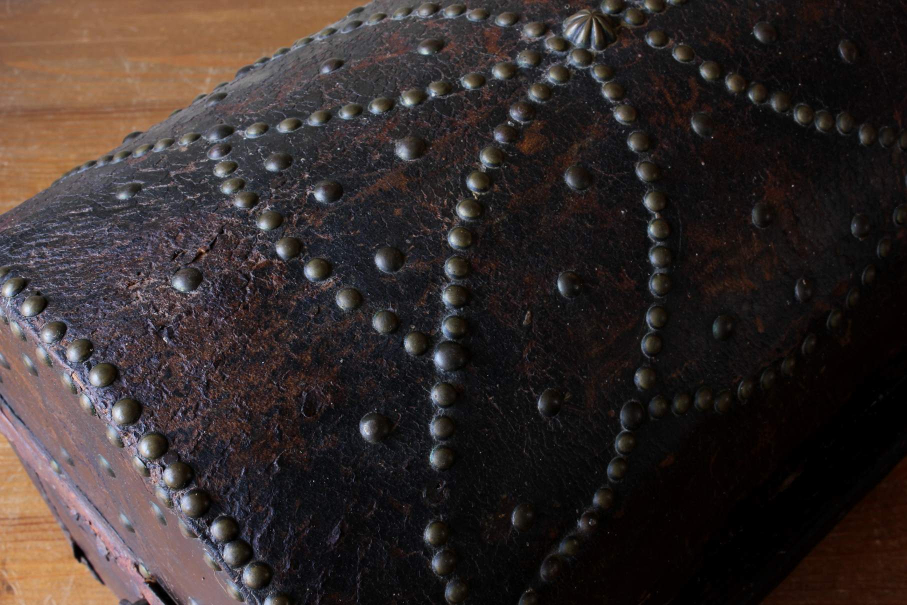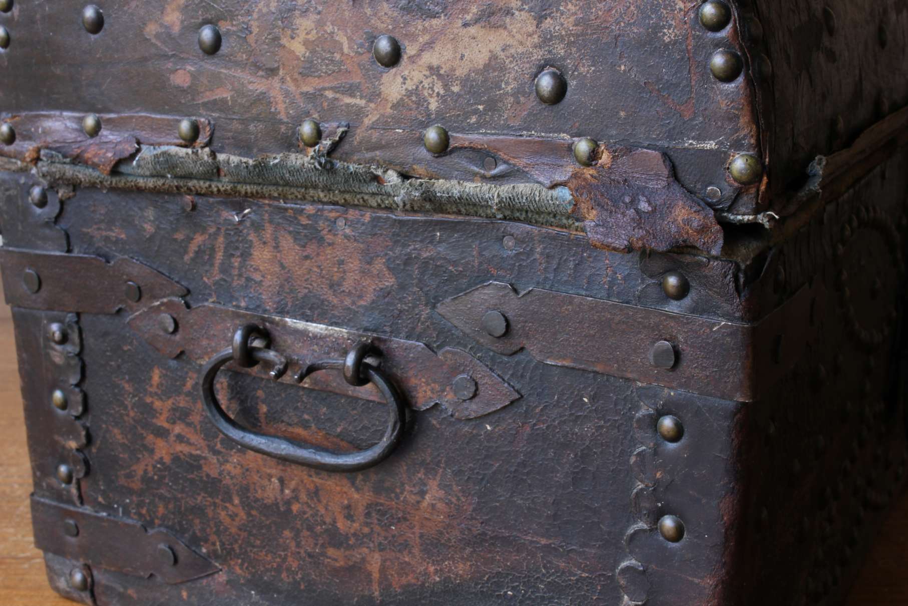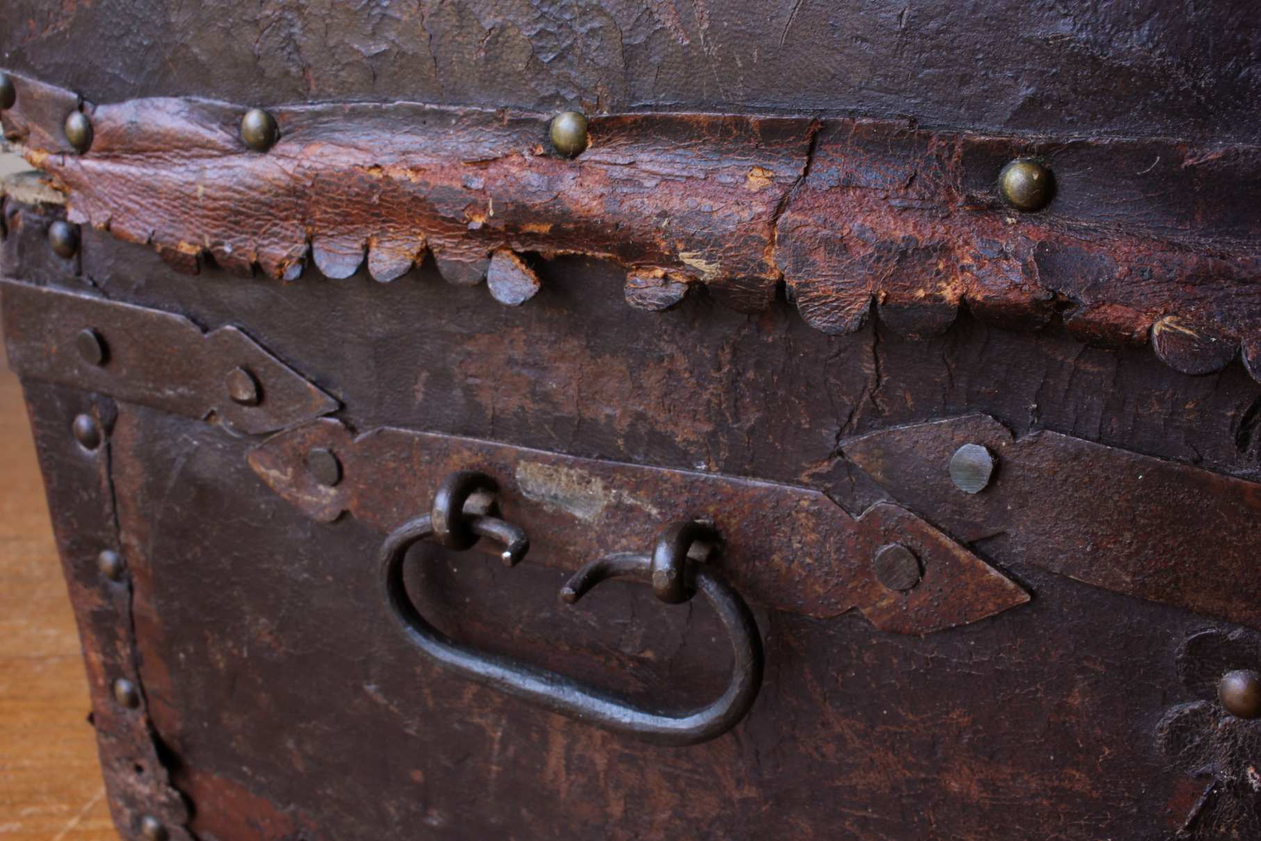 This fabulous Spanish brown leather trunk with beautiful brass stud-work which includes floral studs has a domed lid and dates from the late 17th / early 18th century.