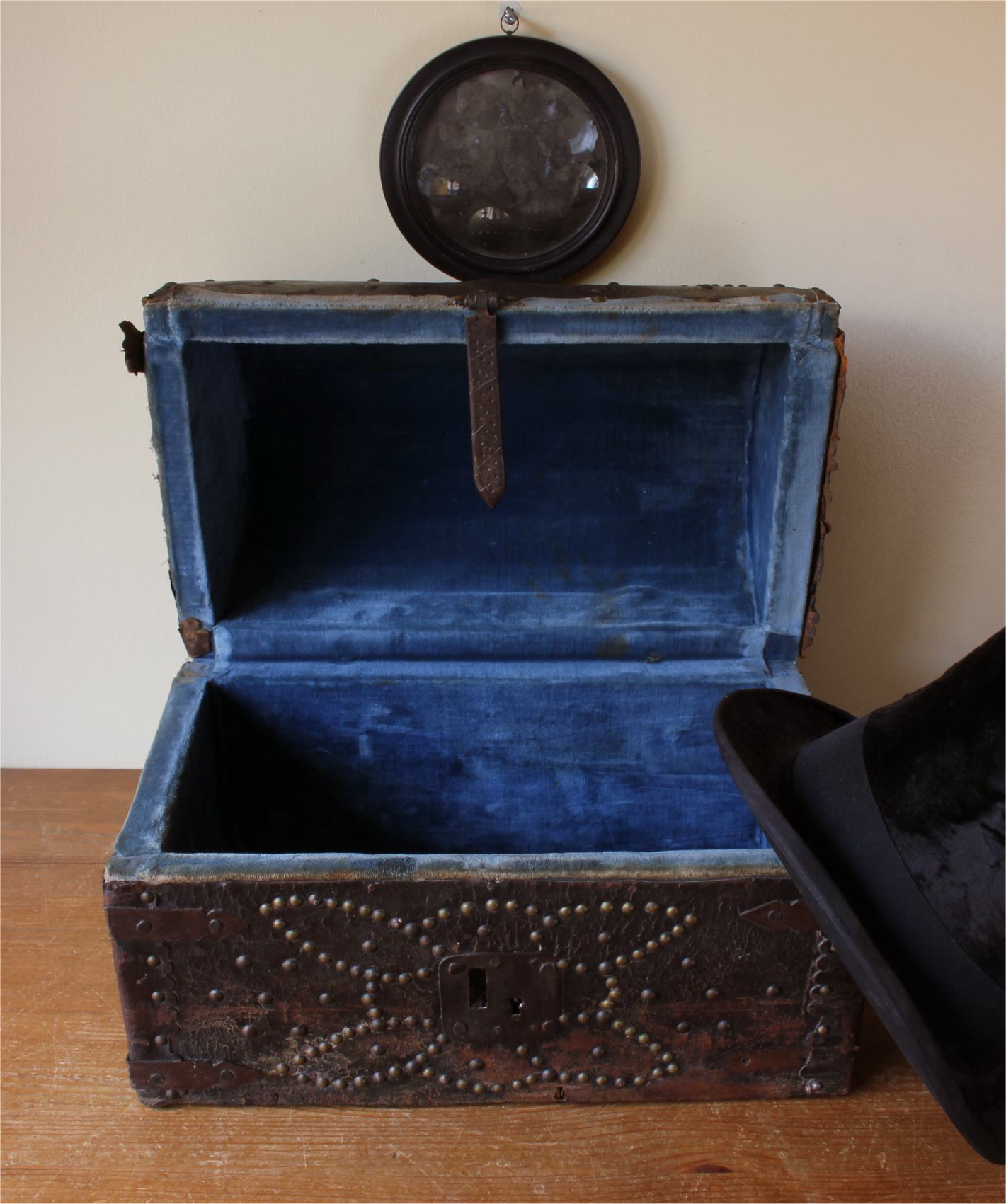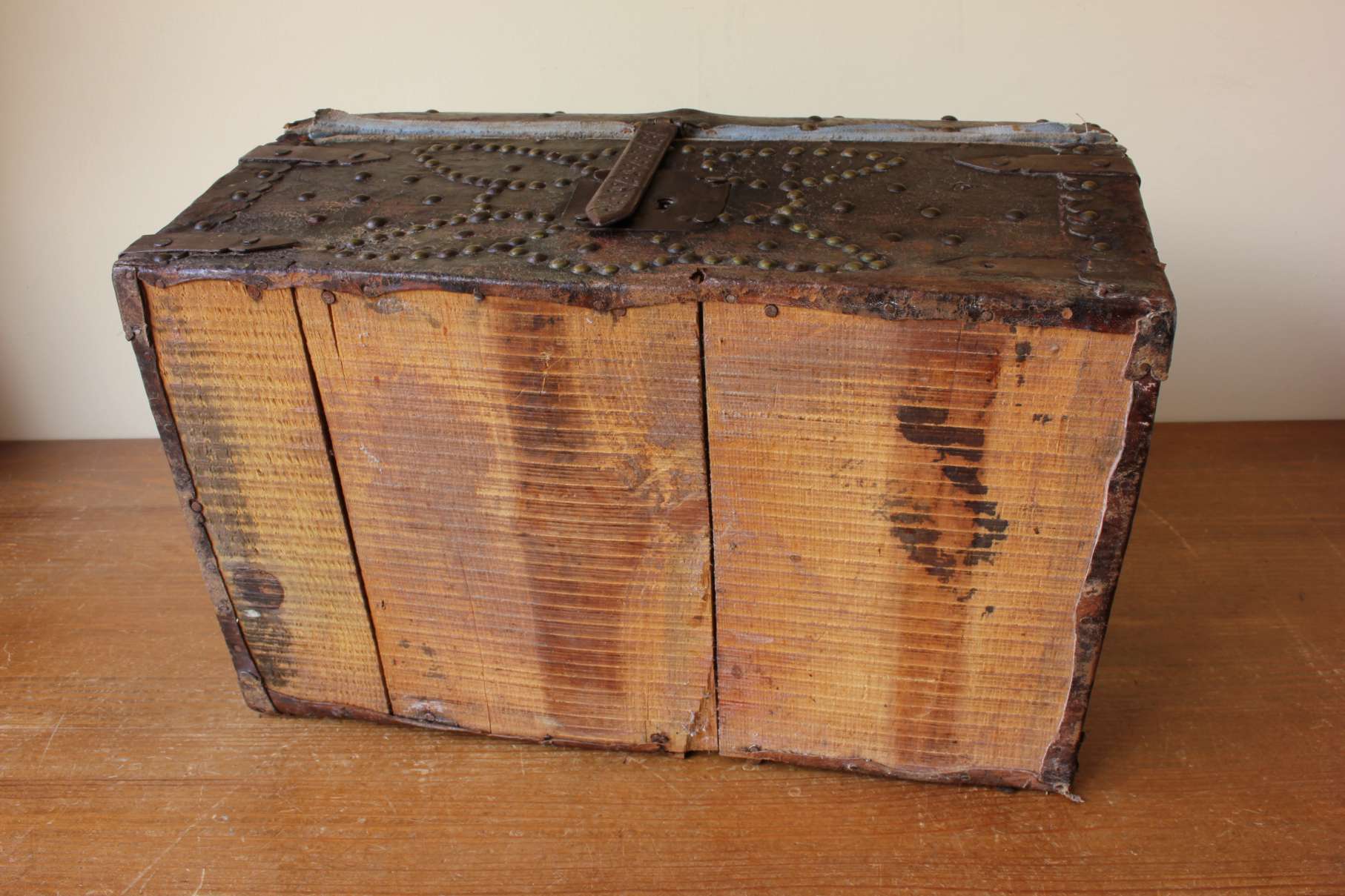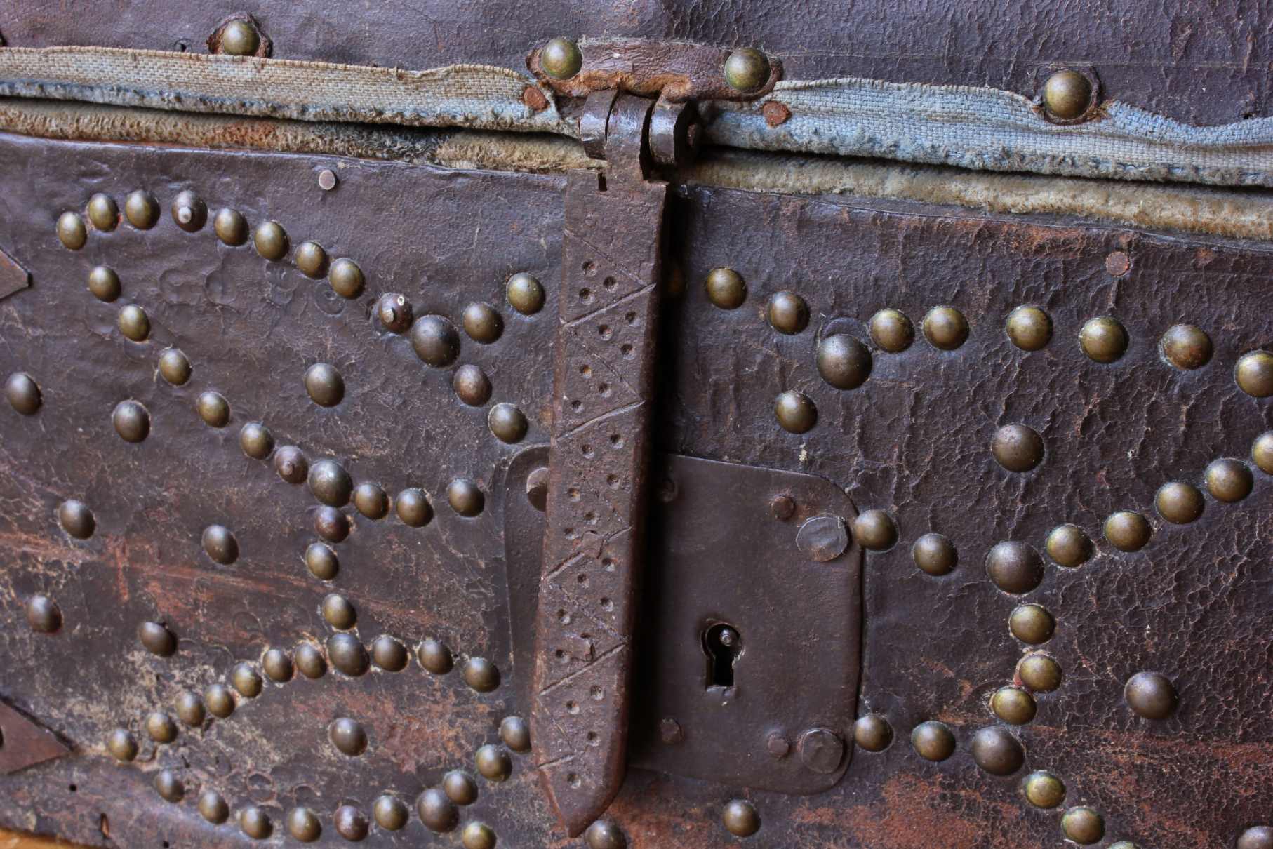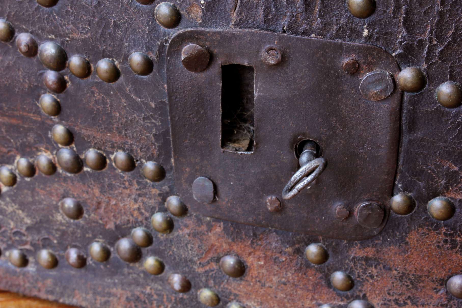 Condition: Very good antique condition with signs of use in keeping with age. Some losses and wear to leather. Some missing studs and metalwork. Box can be opened and locked using the key which is not original. Please see pictures.