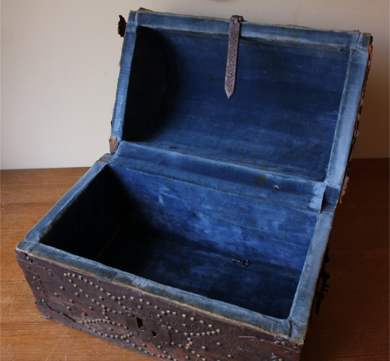This strongbox which would have been used to store valuables has a blue velvet interior, an aged patina and has a stunning decorative look.