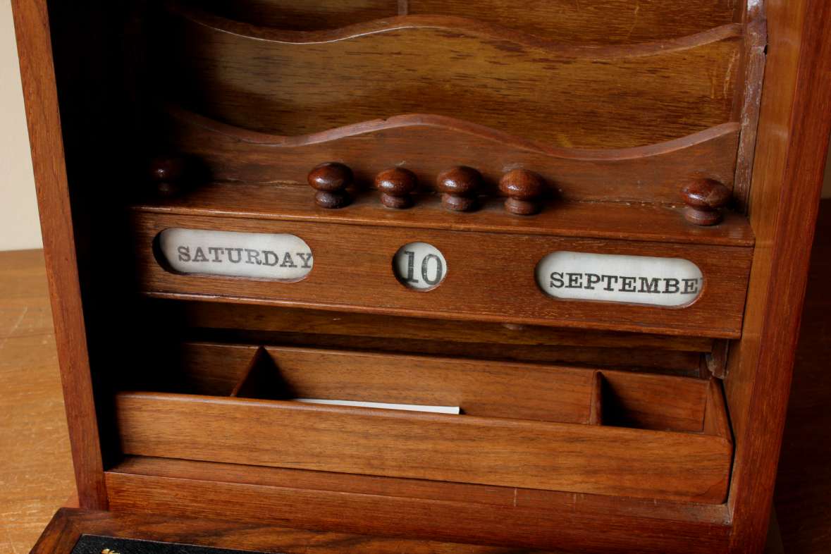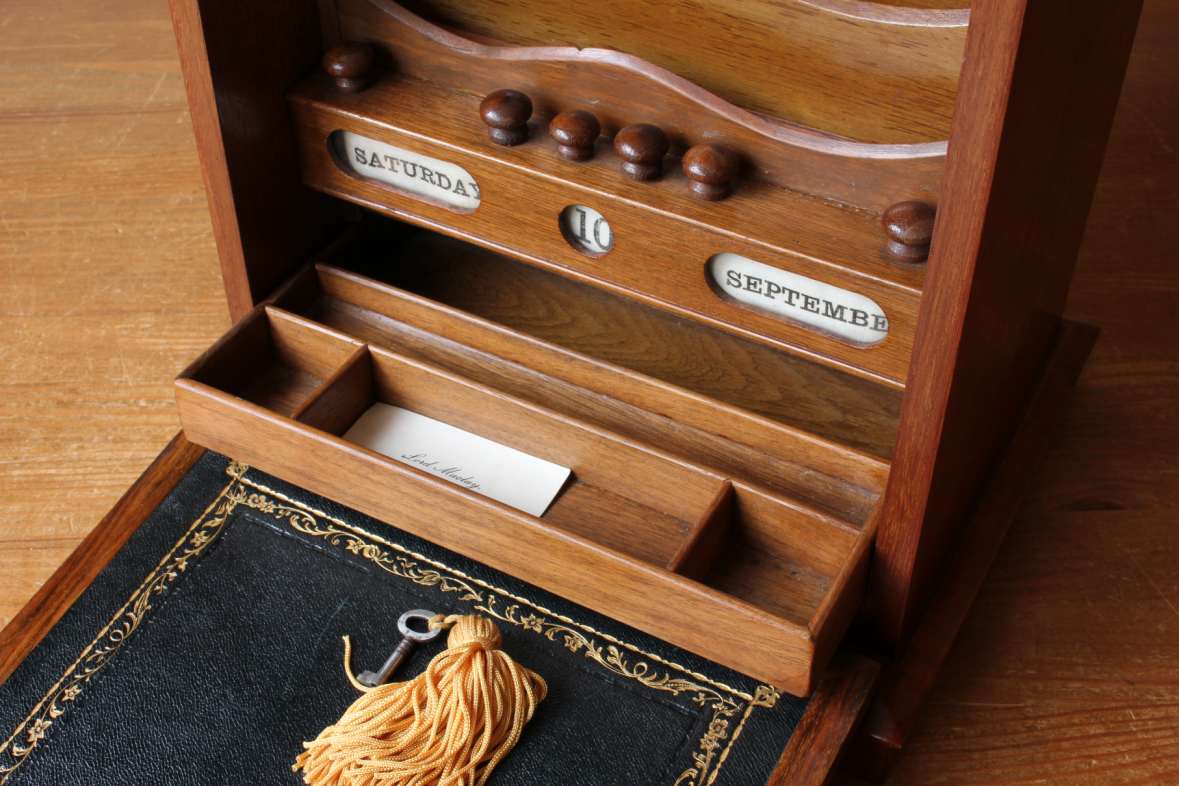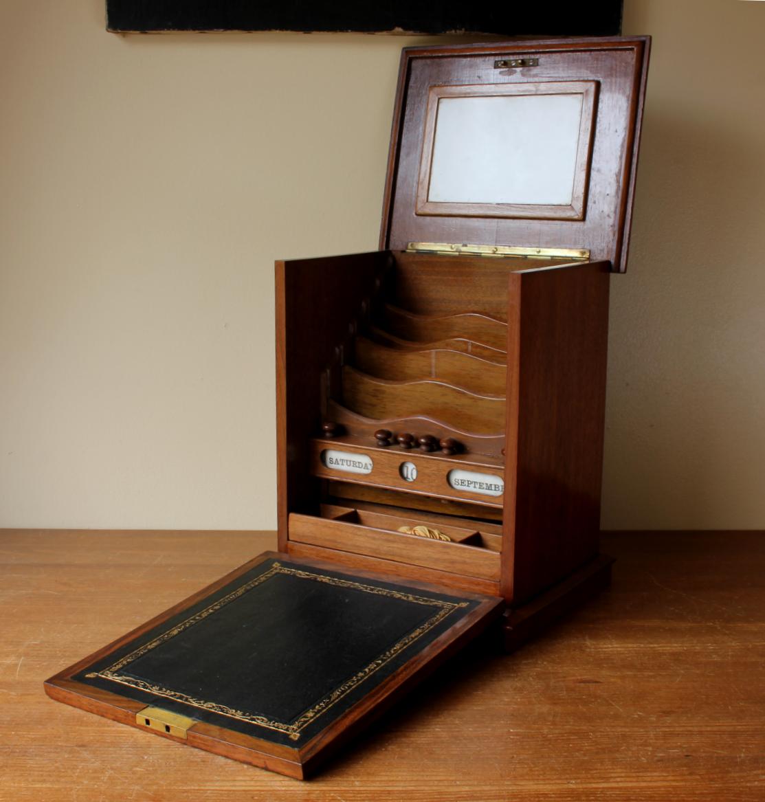 The front of this charming box has a brass lock that unlocks with the key and drops to becomes a writing slope with fitted leather. The inside is nicely fitted with wooden stationery compartments, bottom sliding drawer, a white writing board and a calendar.