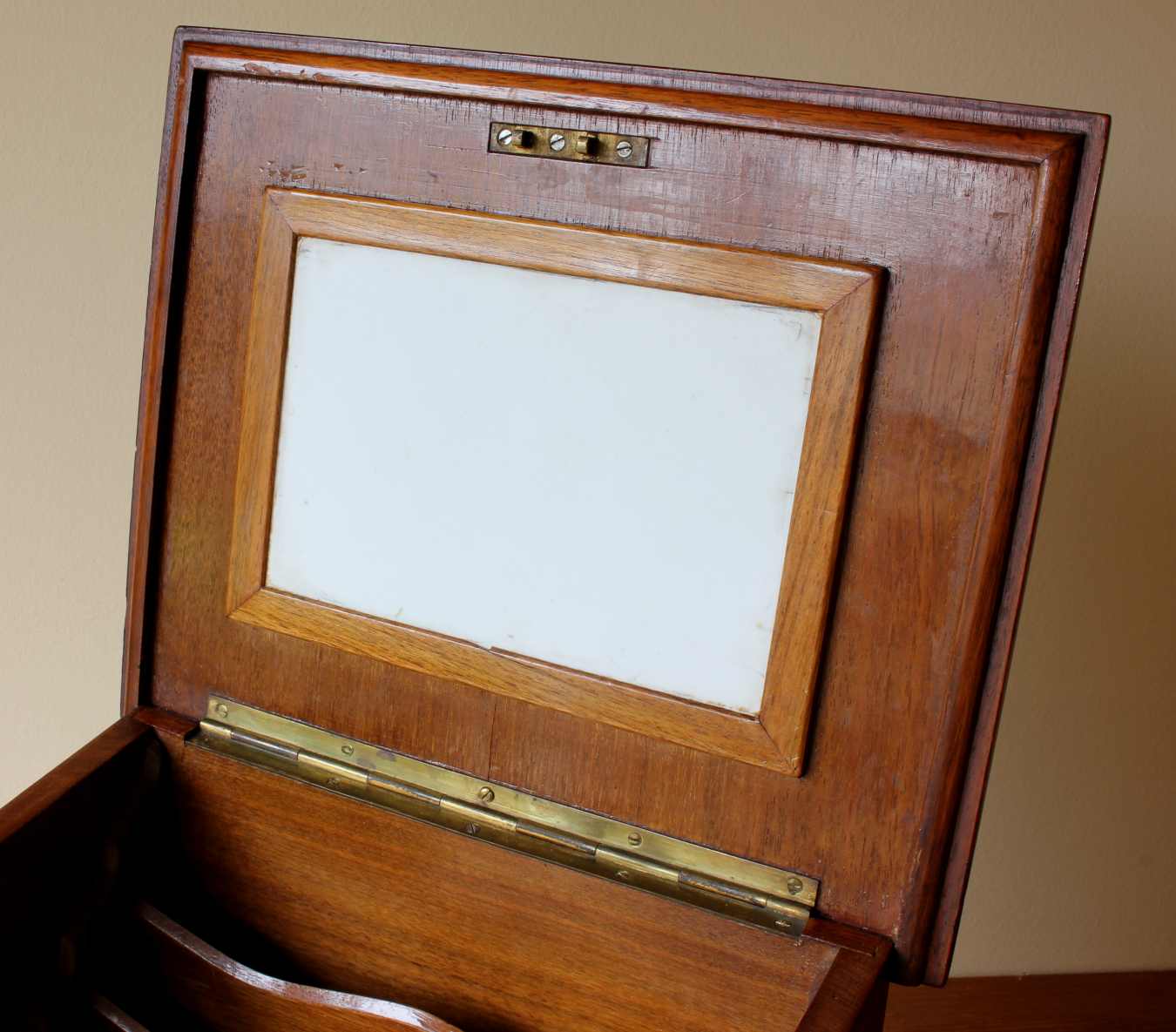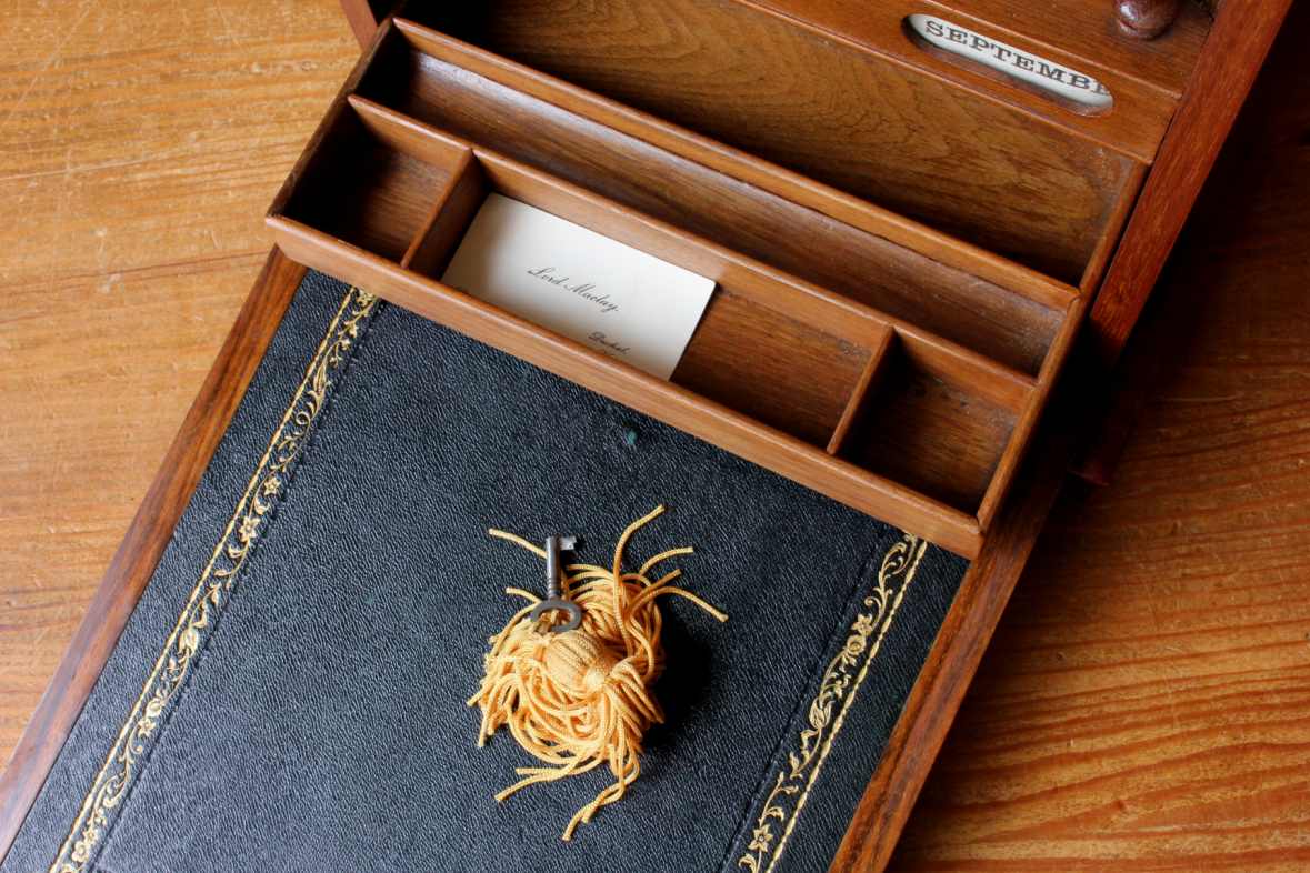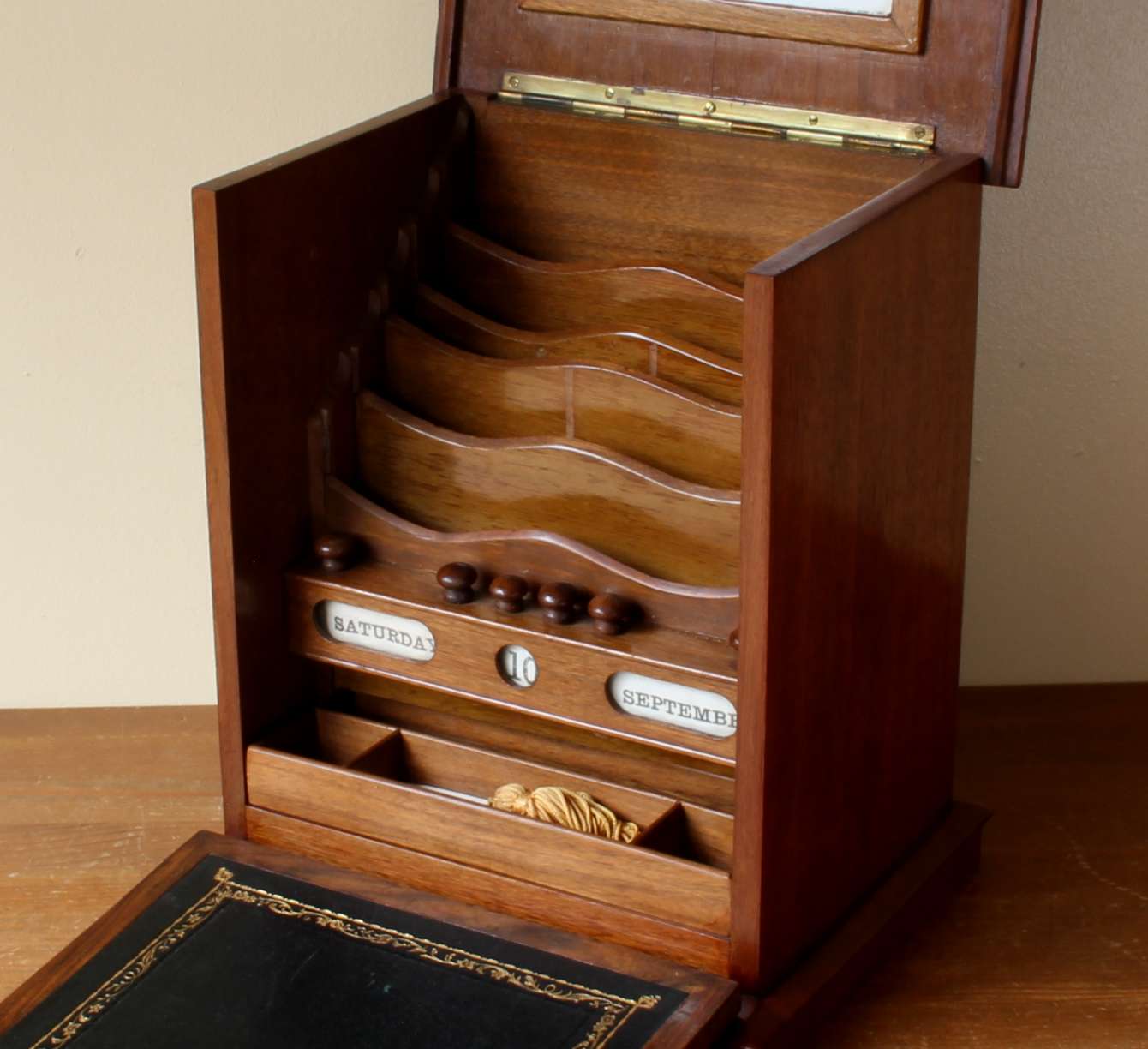 The front of this charming box has a brass lock that unlocks with the key and drops to becomes a writing slope with fitted leather. The inside is nicely fitted with wooden stationery compartments, bottom sliding drawer, a white writing board and a calendar.