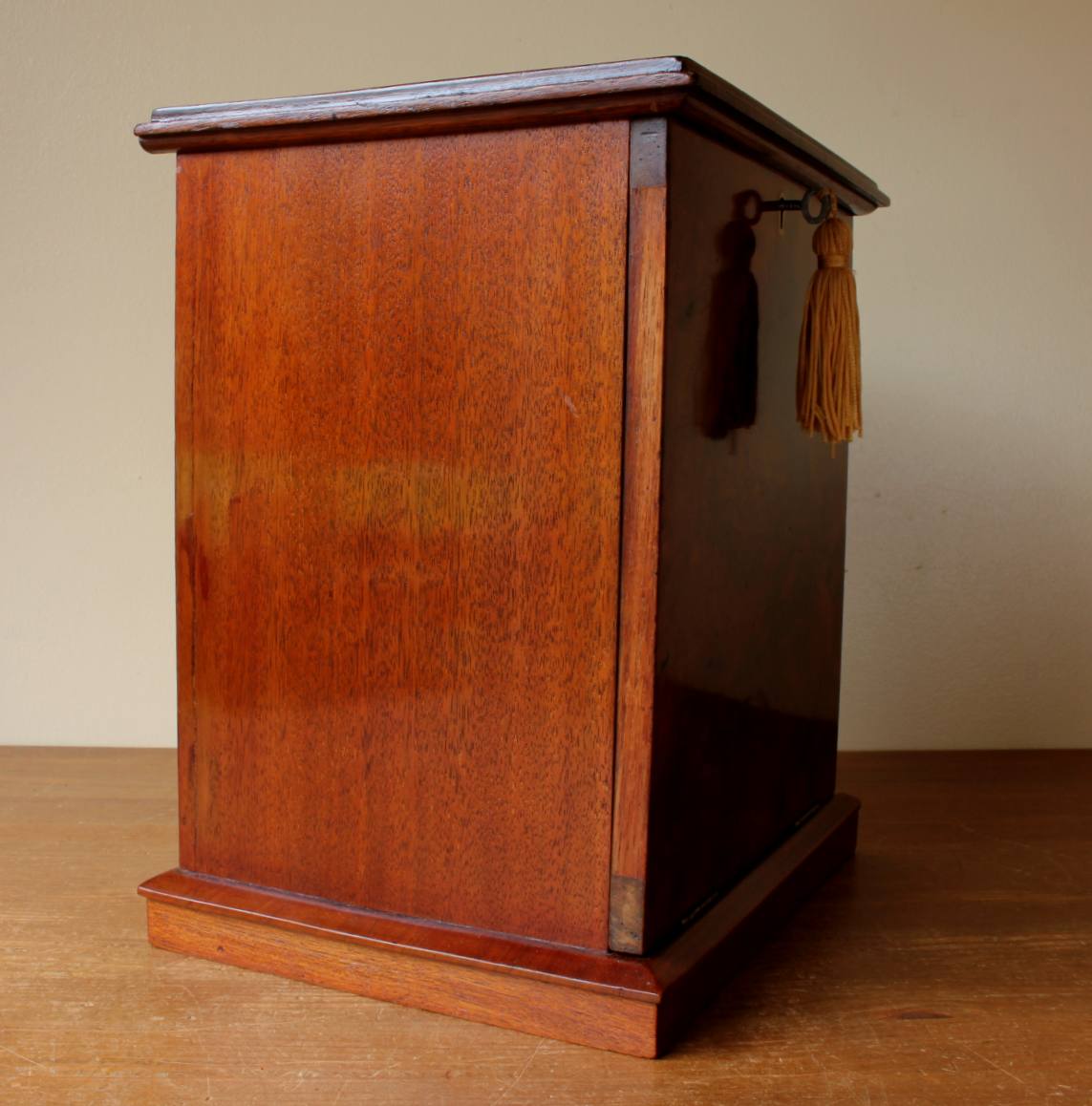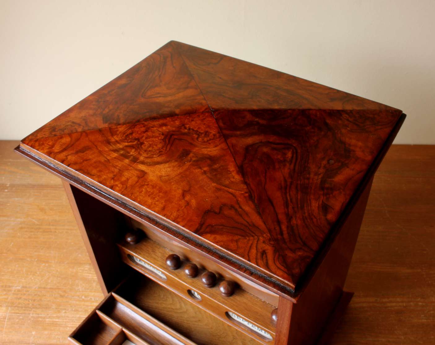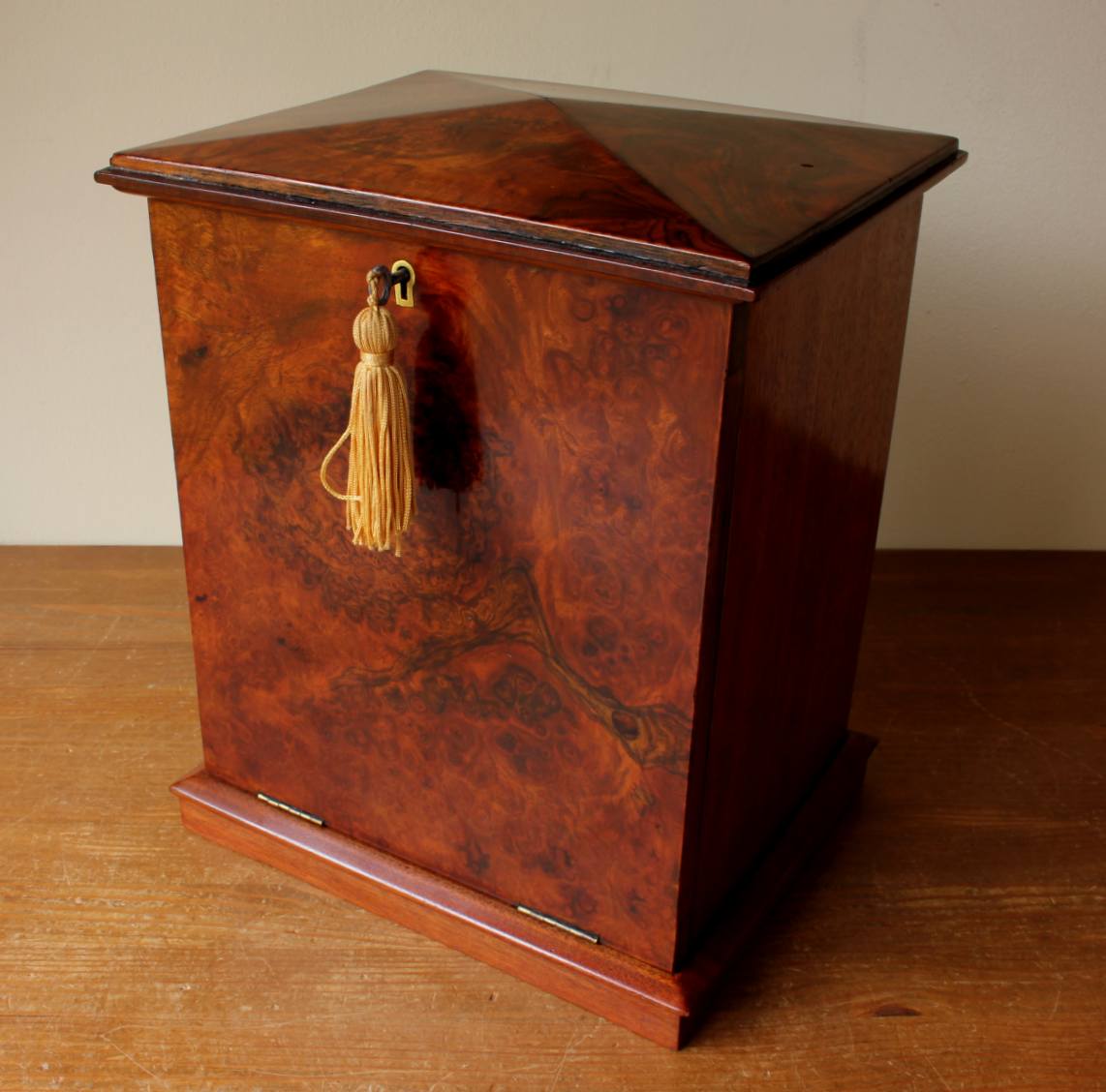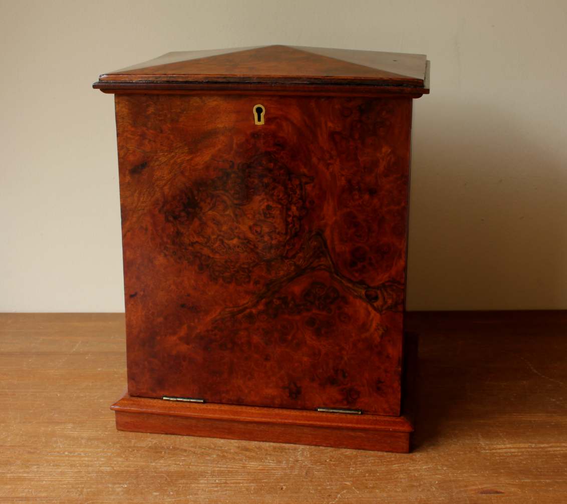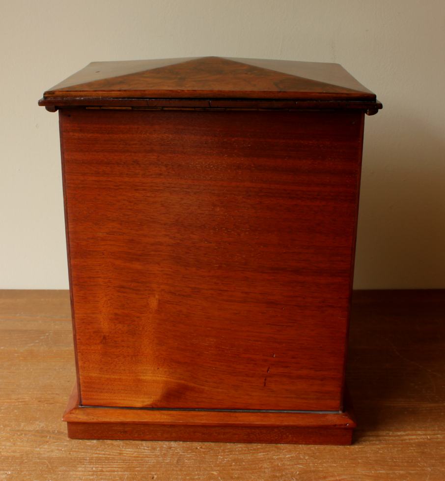 This handsome antique stationery box which dates from the late 19th century has an attractive tall design with a walnut veneer front and top which can be locked.