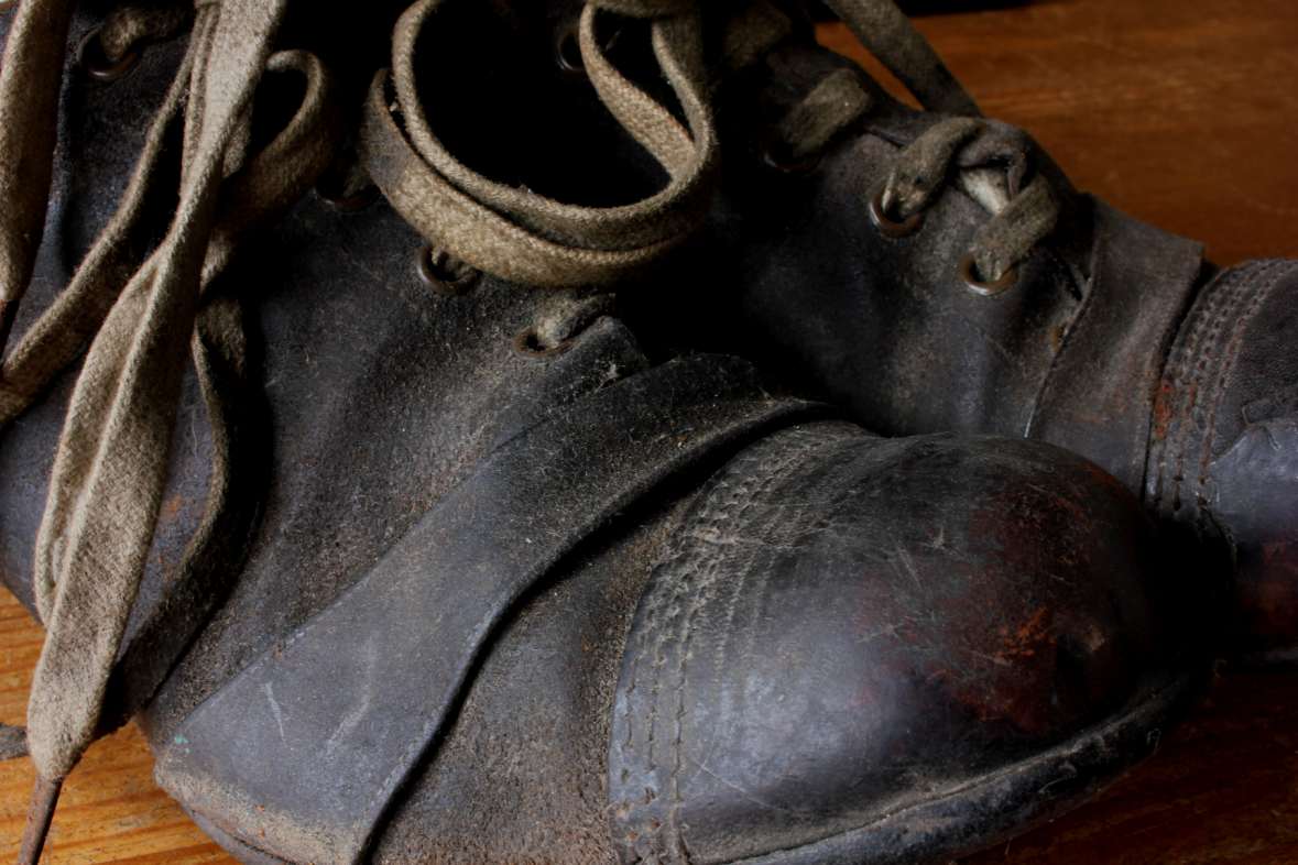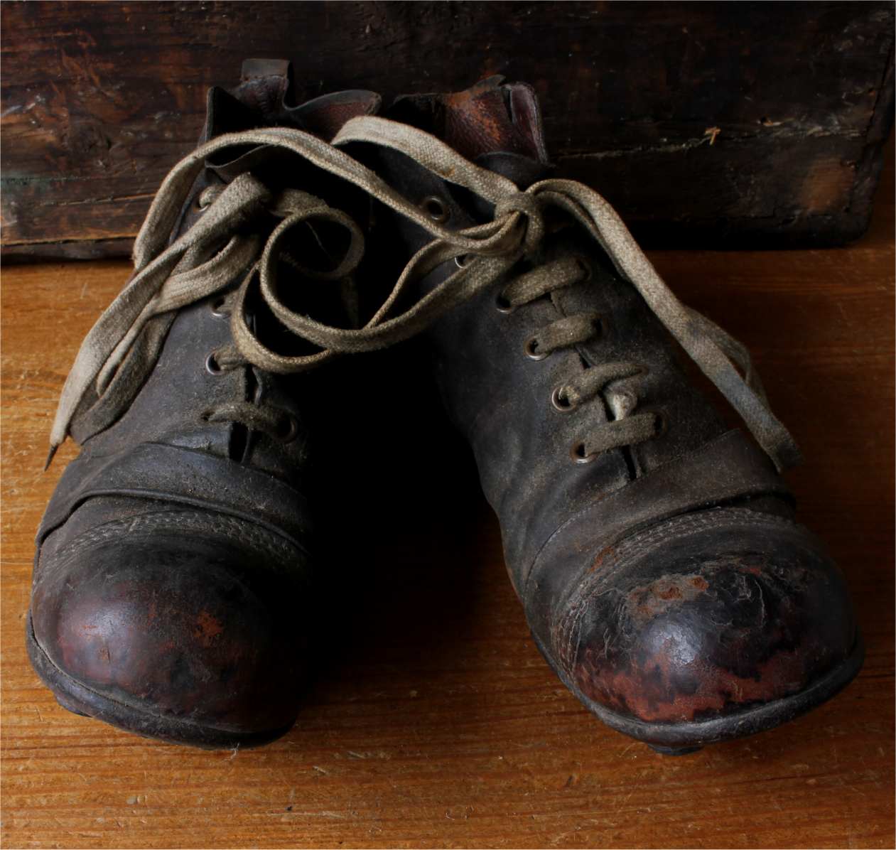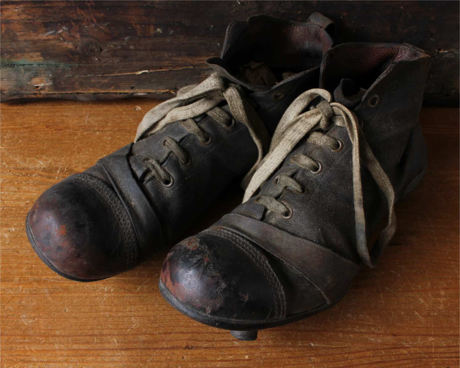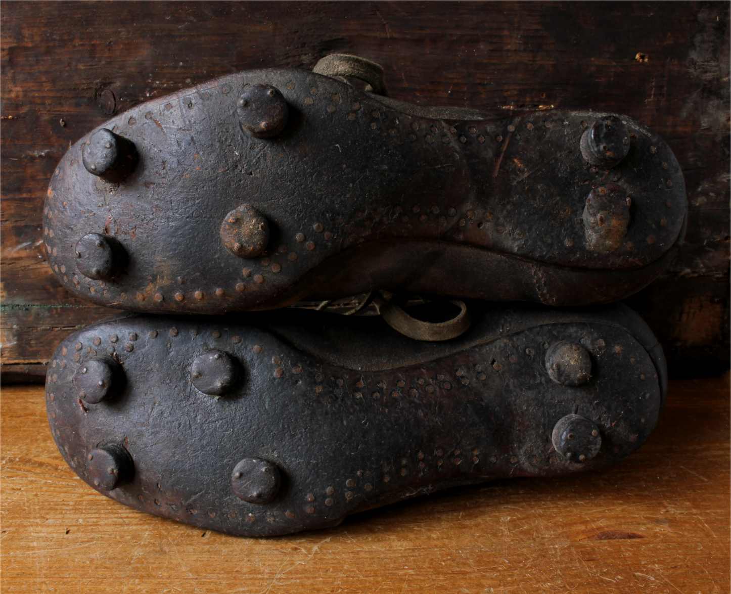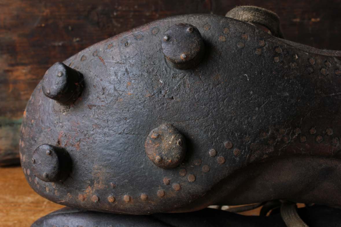 This well used pair of vintage football boots which are made of brown leather have leather soles with nailed on studs and date from the 1940's.