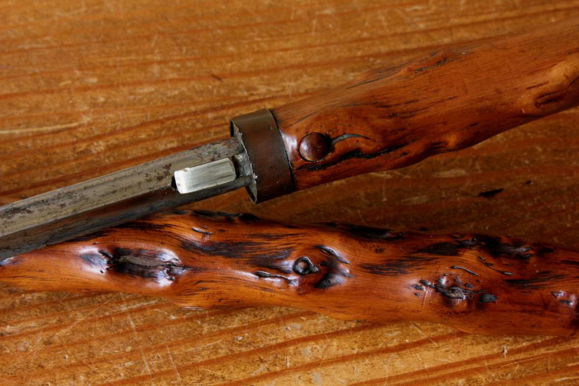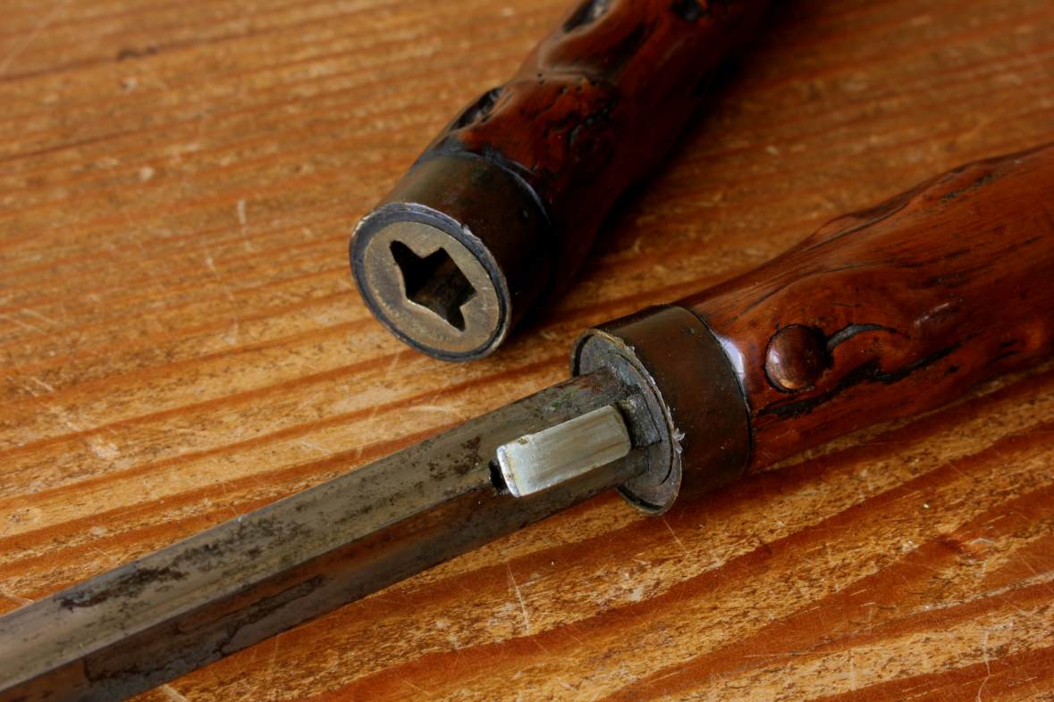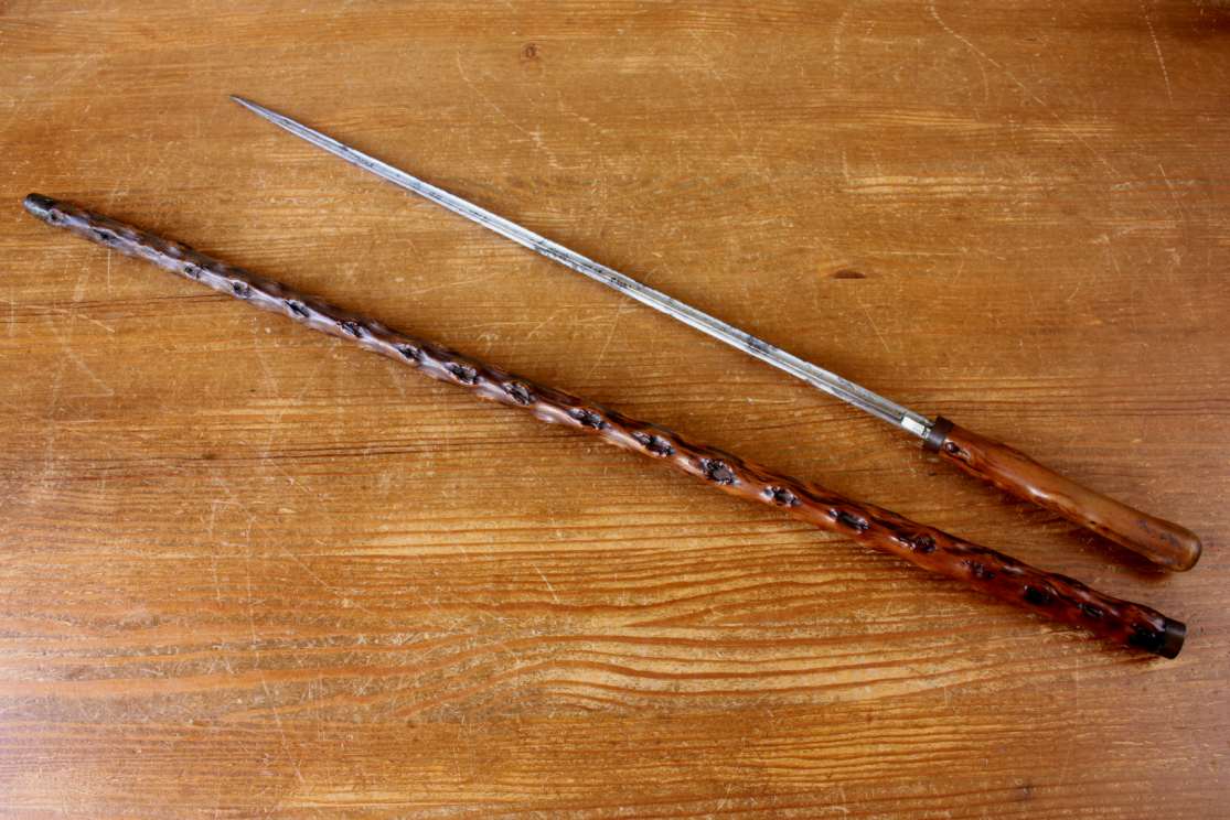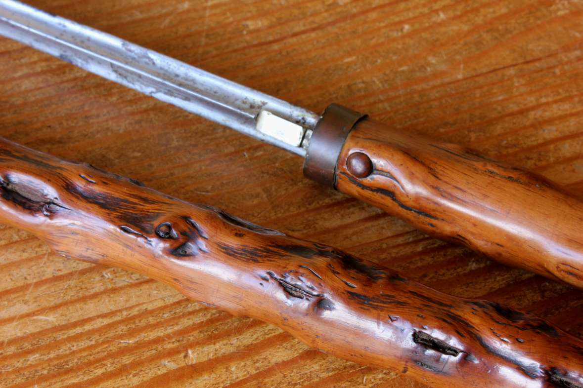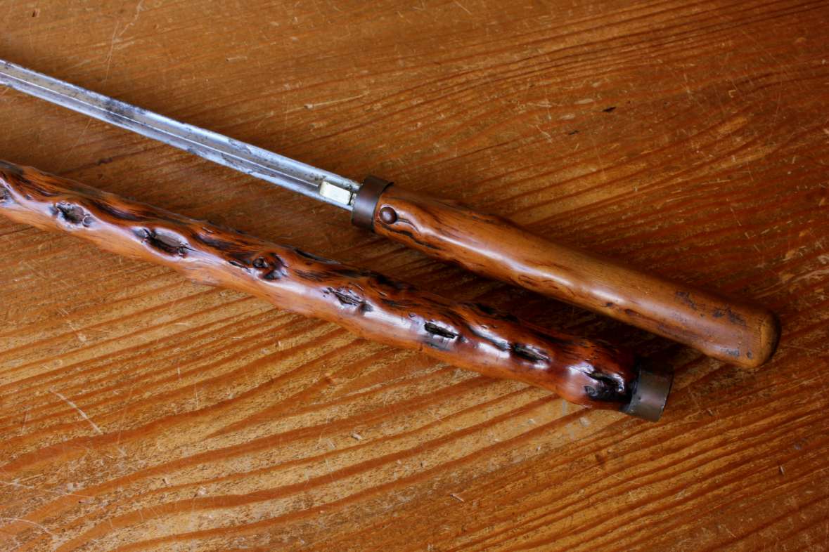 This wonderful quality swordstick has a push button which releases the sword that nicely slots inside the cane and firmly clicks into place when closed.