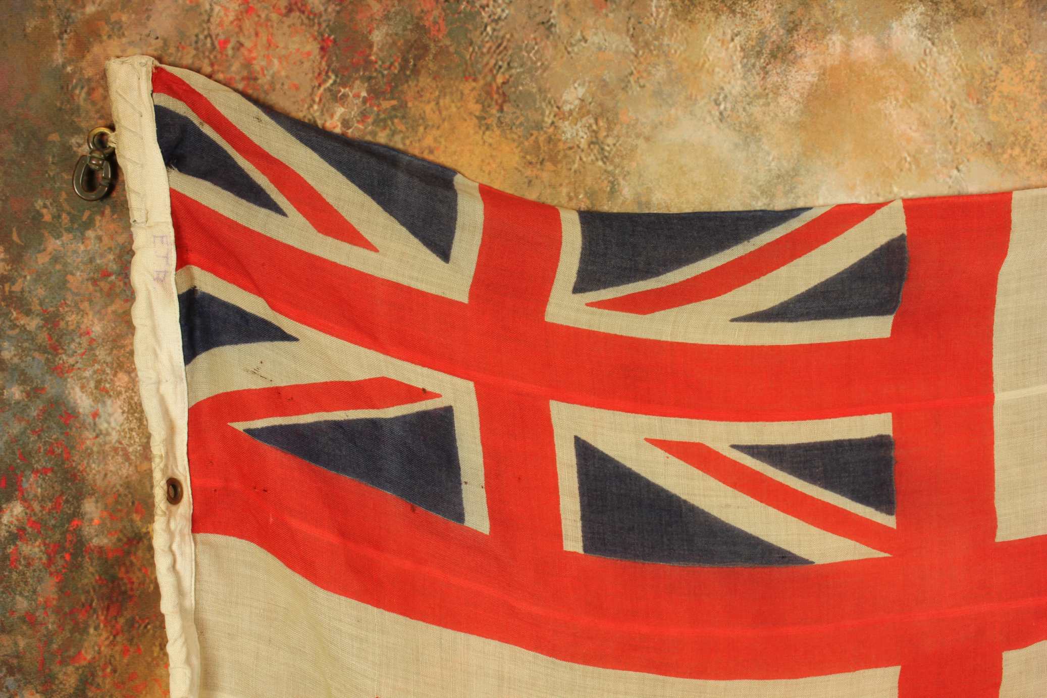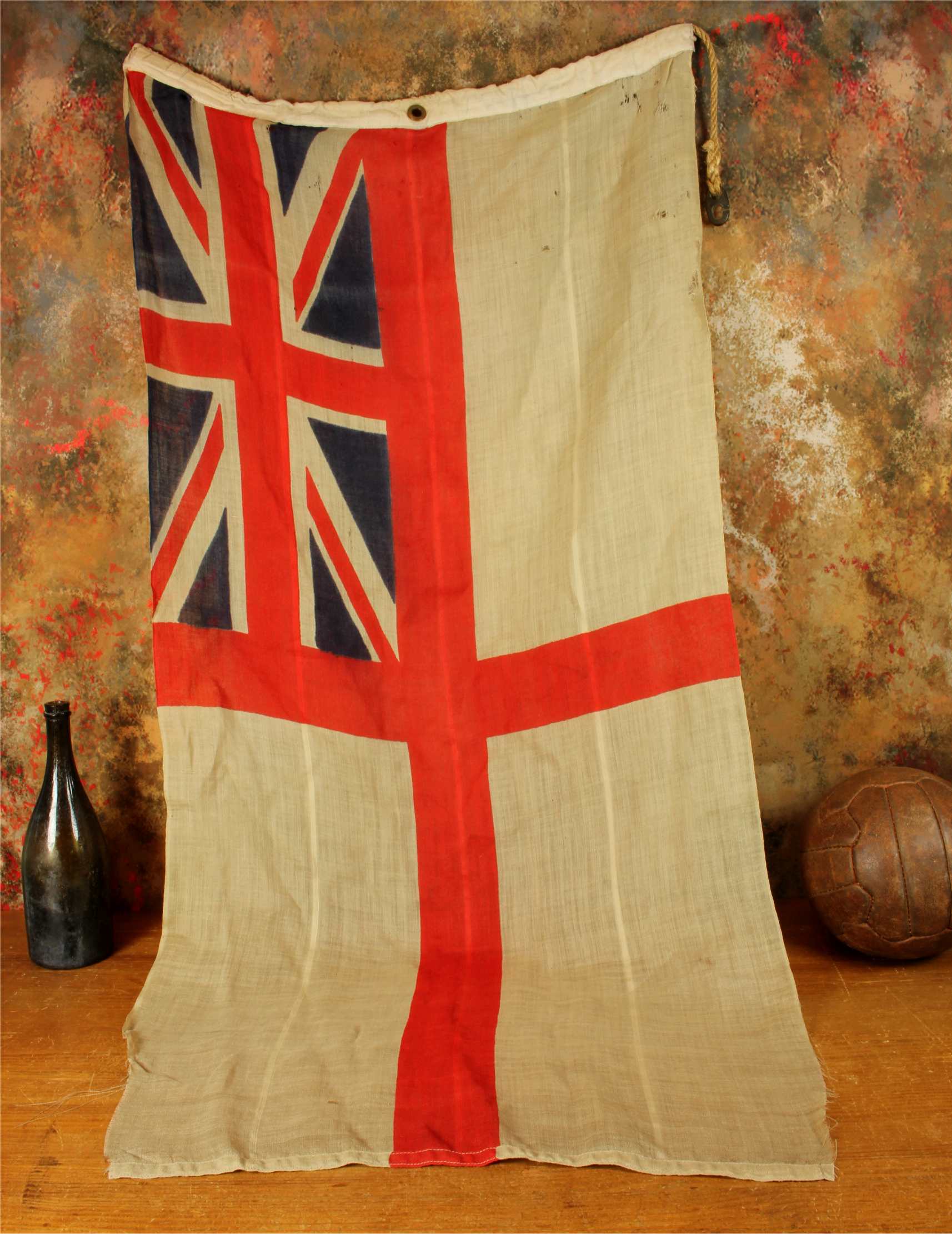 This antique British White Ensign Flag which is made of quality linen dates from c1900, has a halyard rope with bronze metal fittings and would have been used on the rear of a ship or boat.