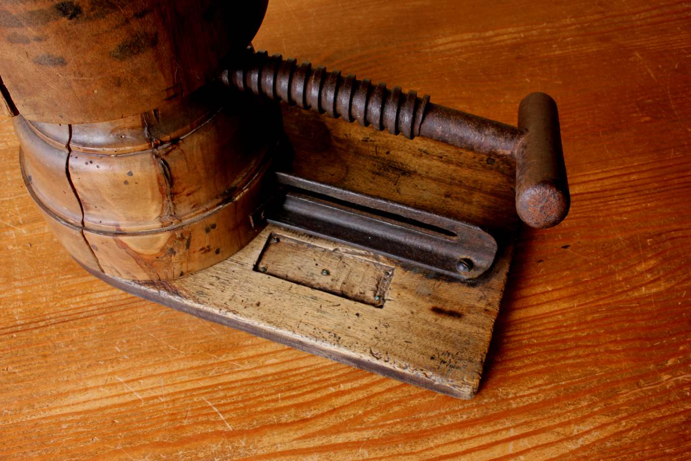 Condition: Very good used antique condition with signs of use in keeping with age. A nice patina and look. Some age related wear, some small chips, cracks and bruises. The handle screw mechanism works well. Size / name plate is missing. Please see pictures.