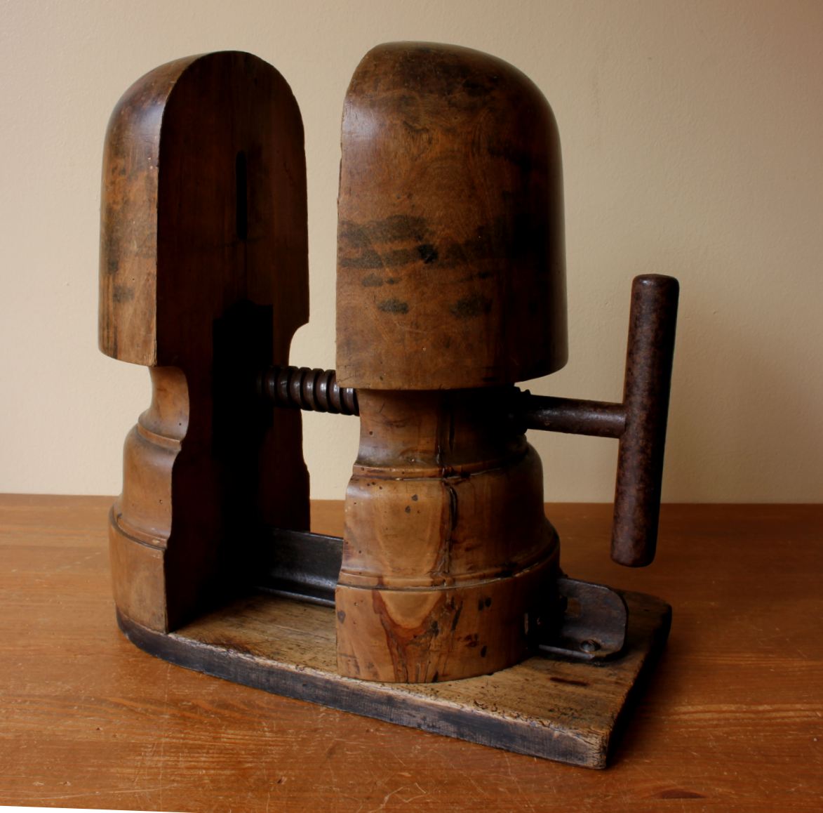 The stretcher has a wooden base with a metal screw adjustment handle that widens when turned and has a wonderful rich colour.