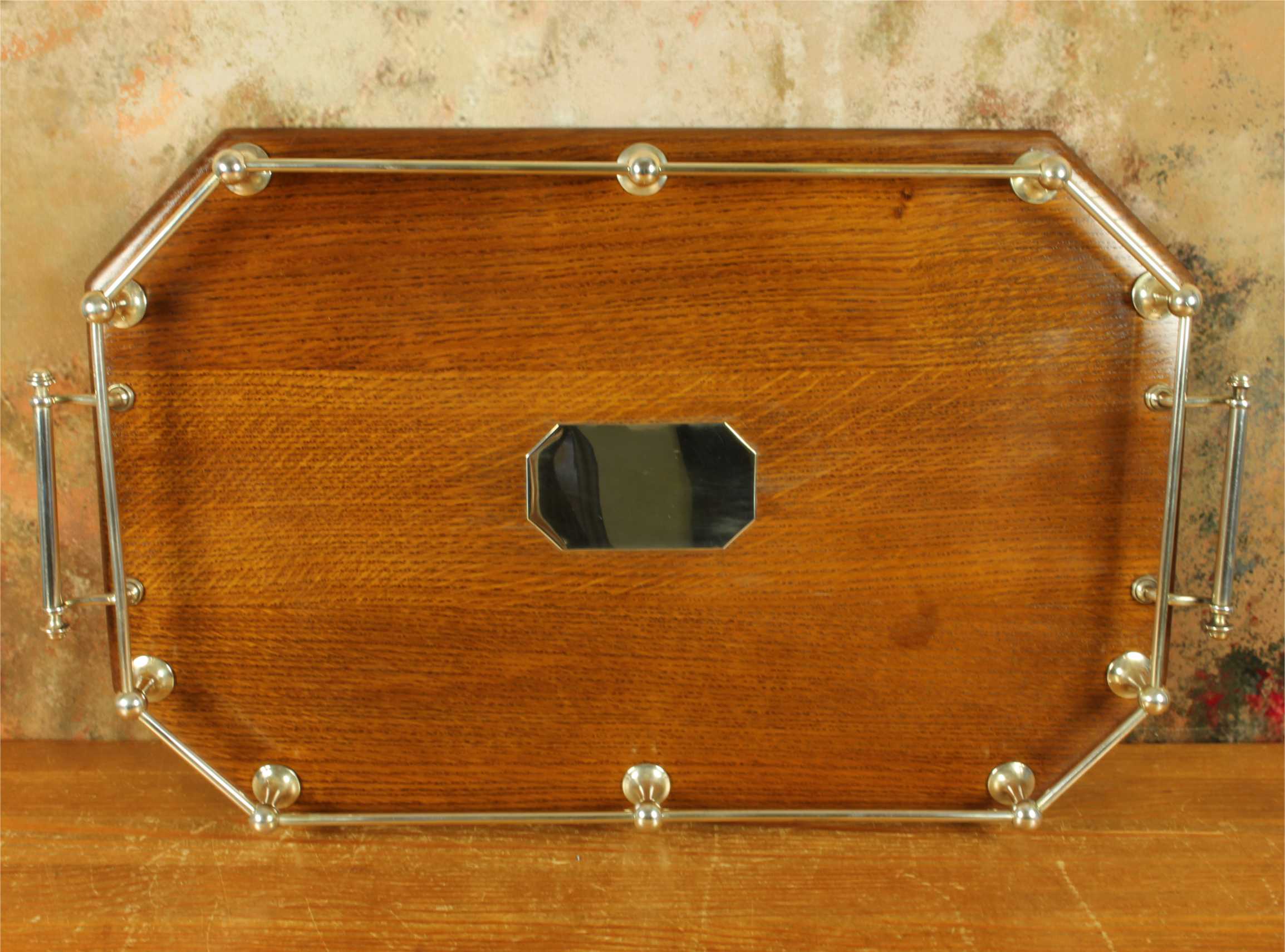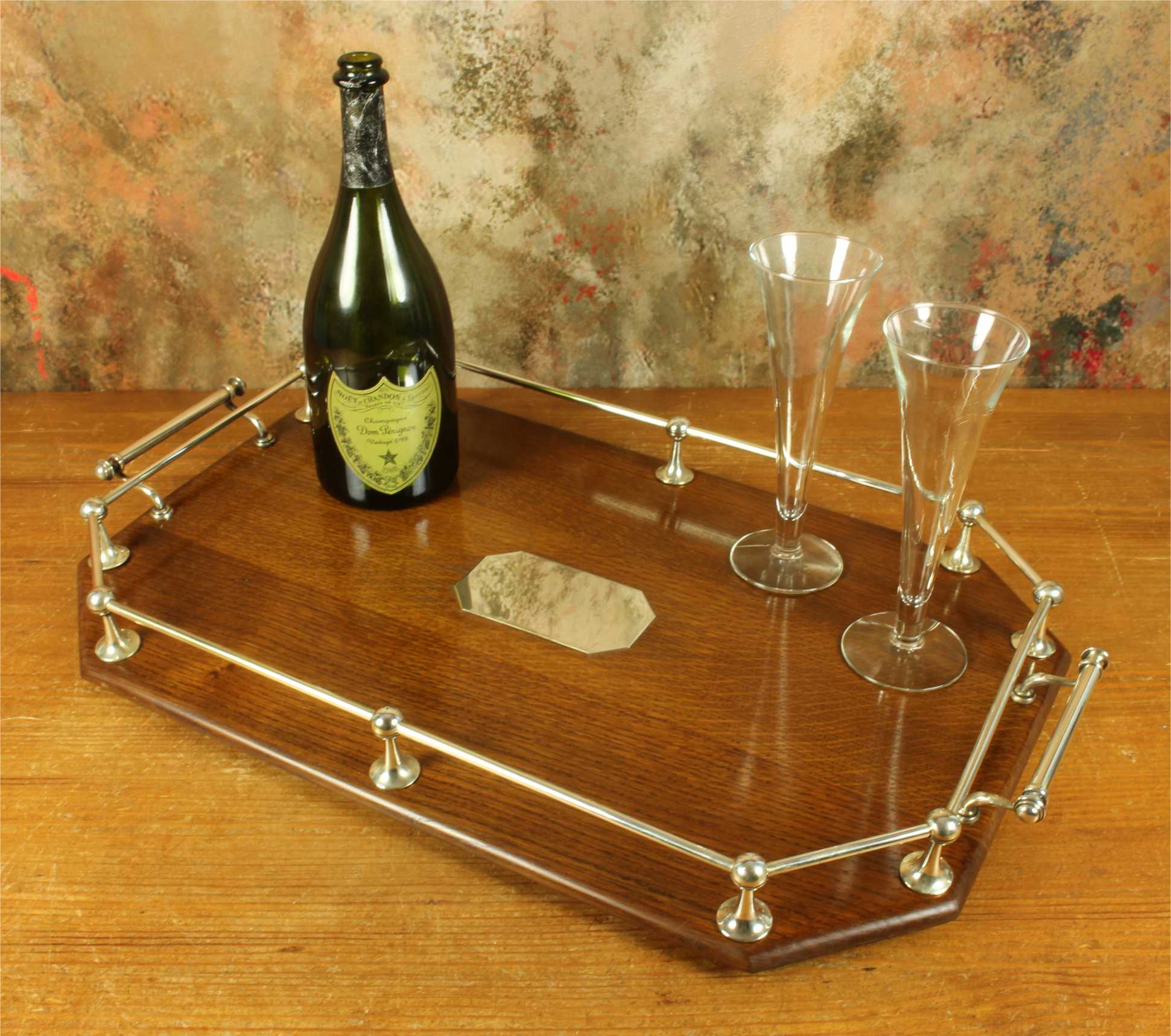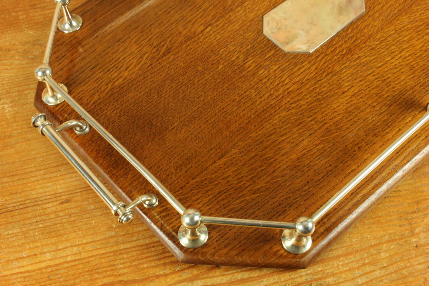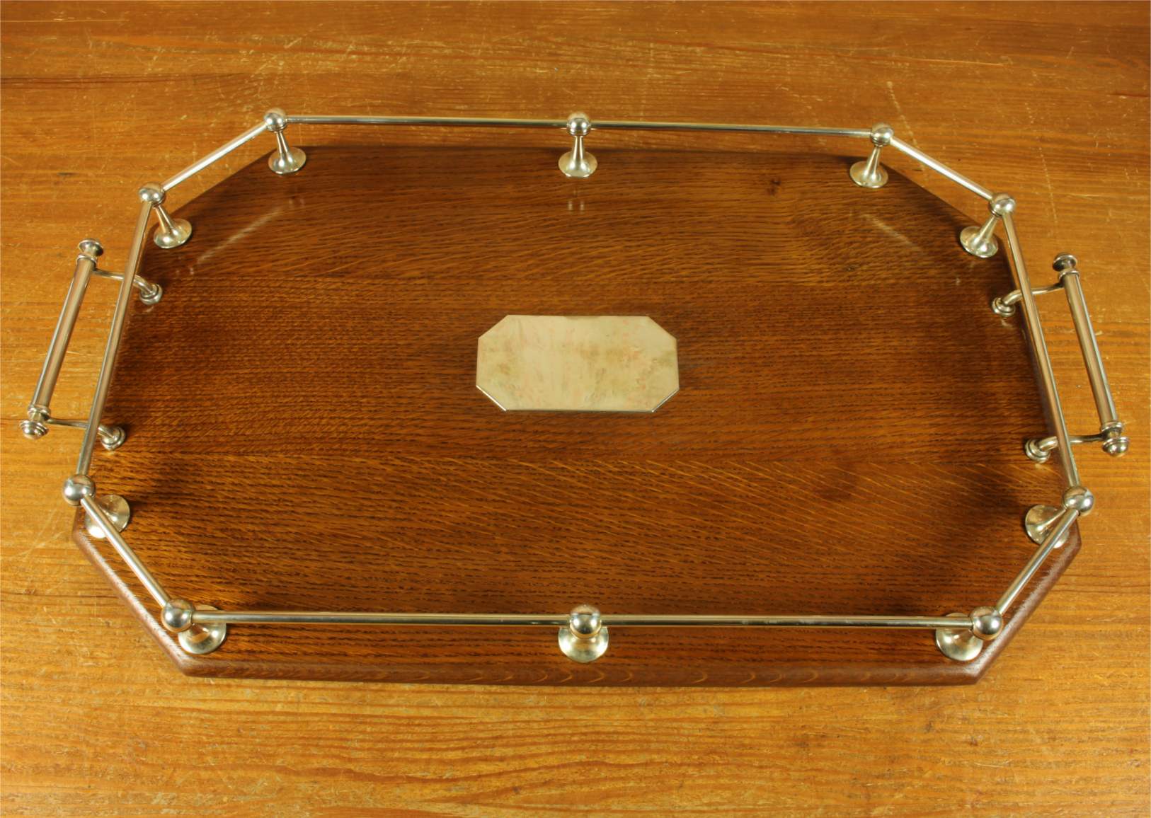 This handsome octagonal gallery tray which is made of English oak is an extra large size tray that has silver plated fittings and gallery rail, silver plate handles, has a central octagonal silver plated blank cartouche and sits on four wooden feet.