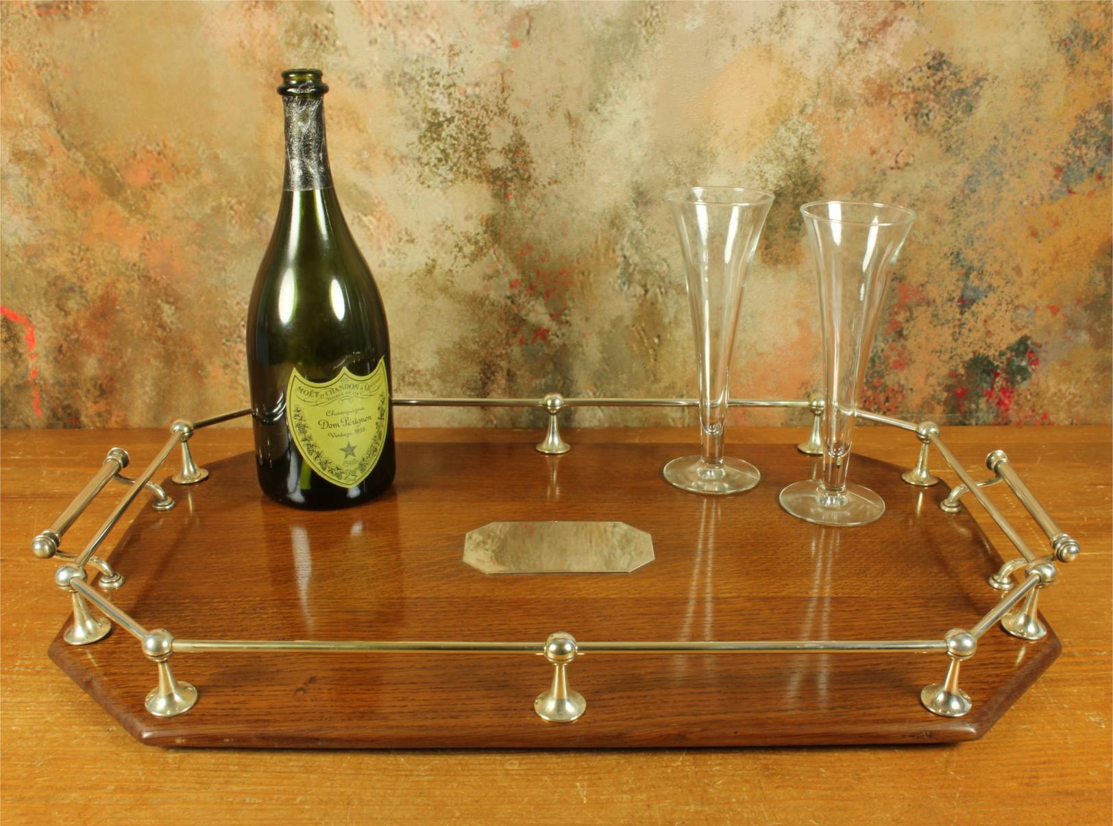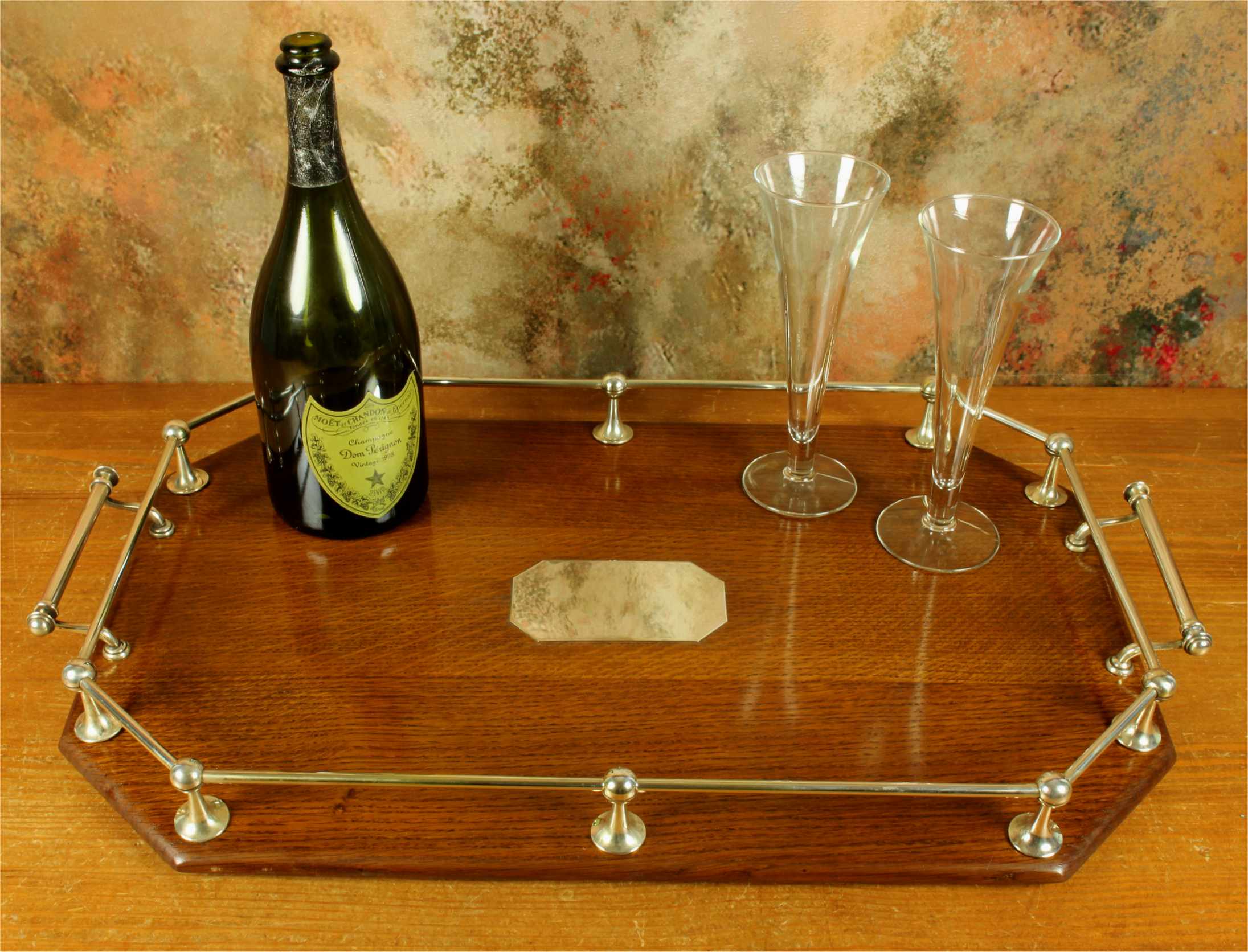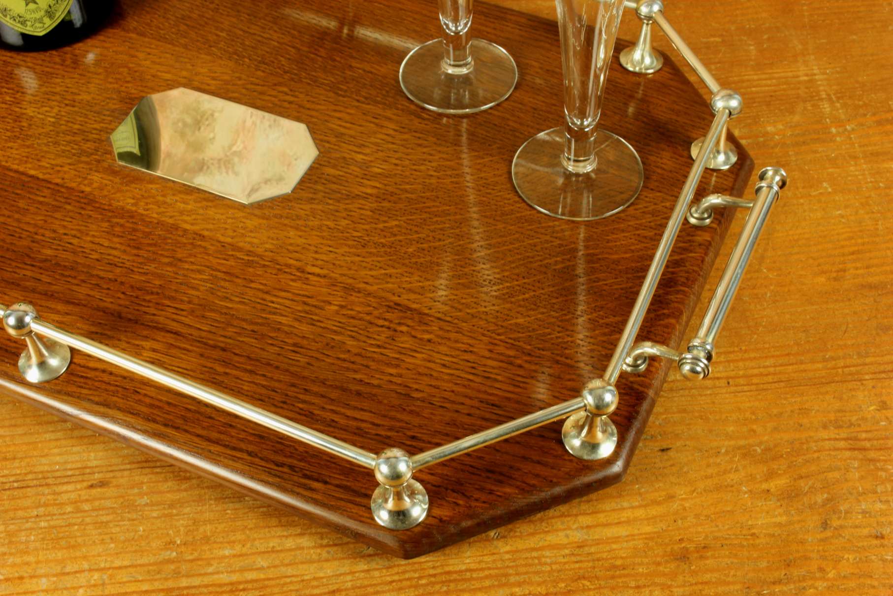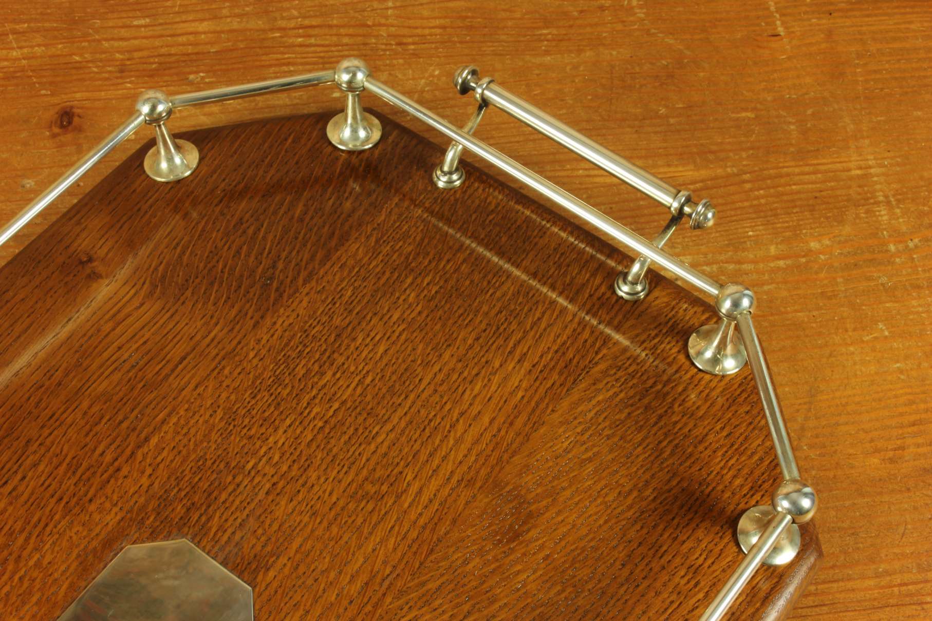 This handsome octagonal gallery tray which is made of English oak is an extra large size tray that has silver plated fittings and gallery rail, silver plate handles, has a central octagonal silver plated blank cartouche and sits on four wooden feet.