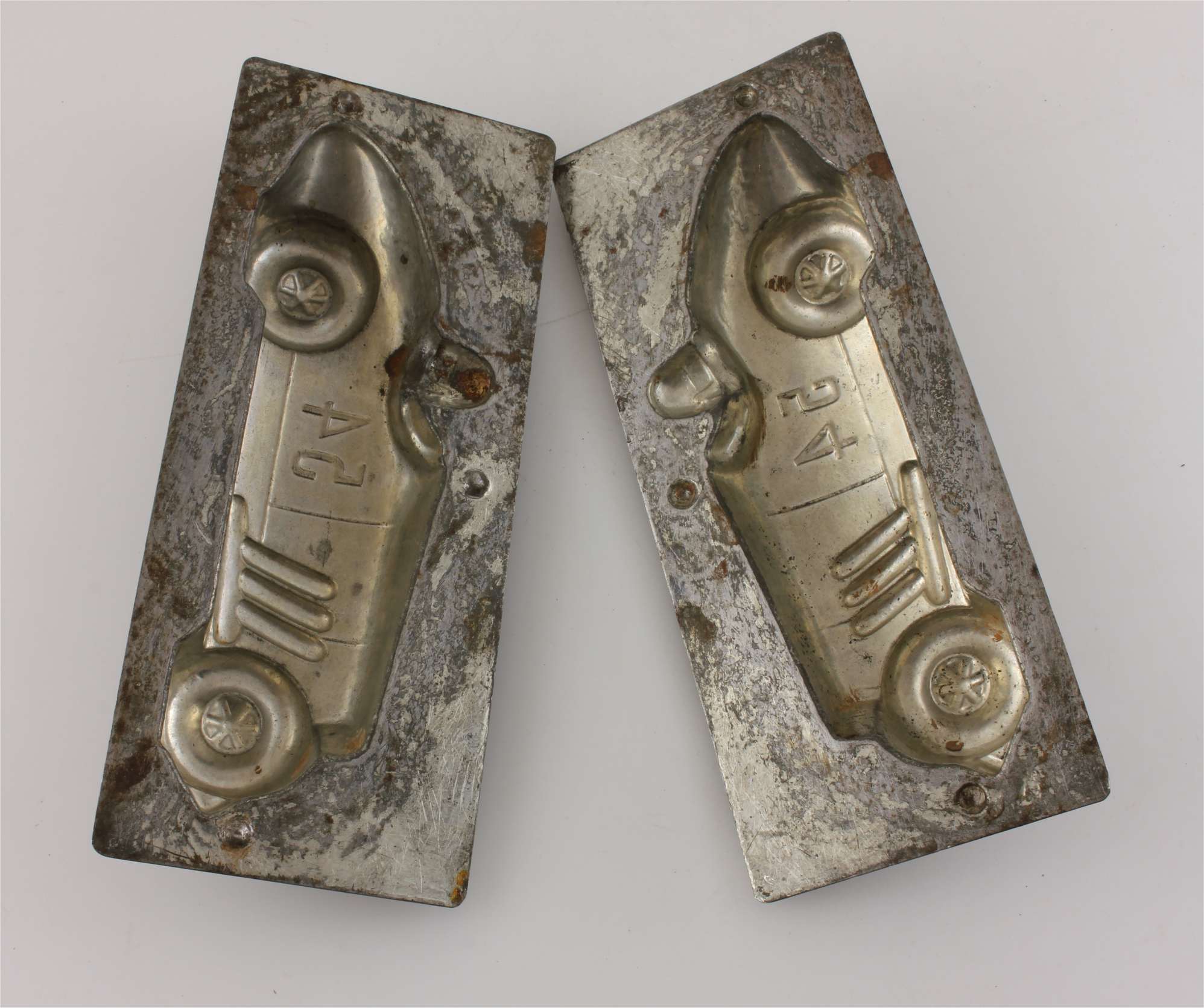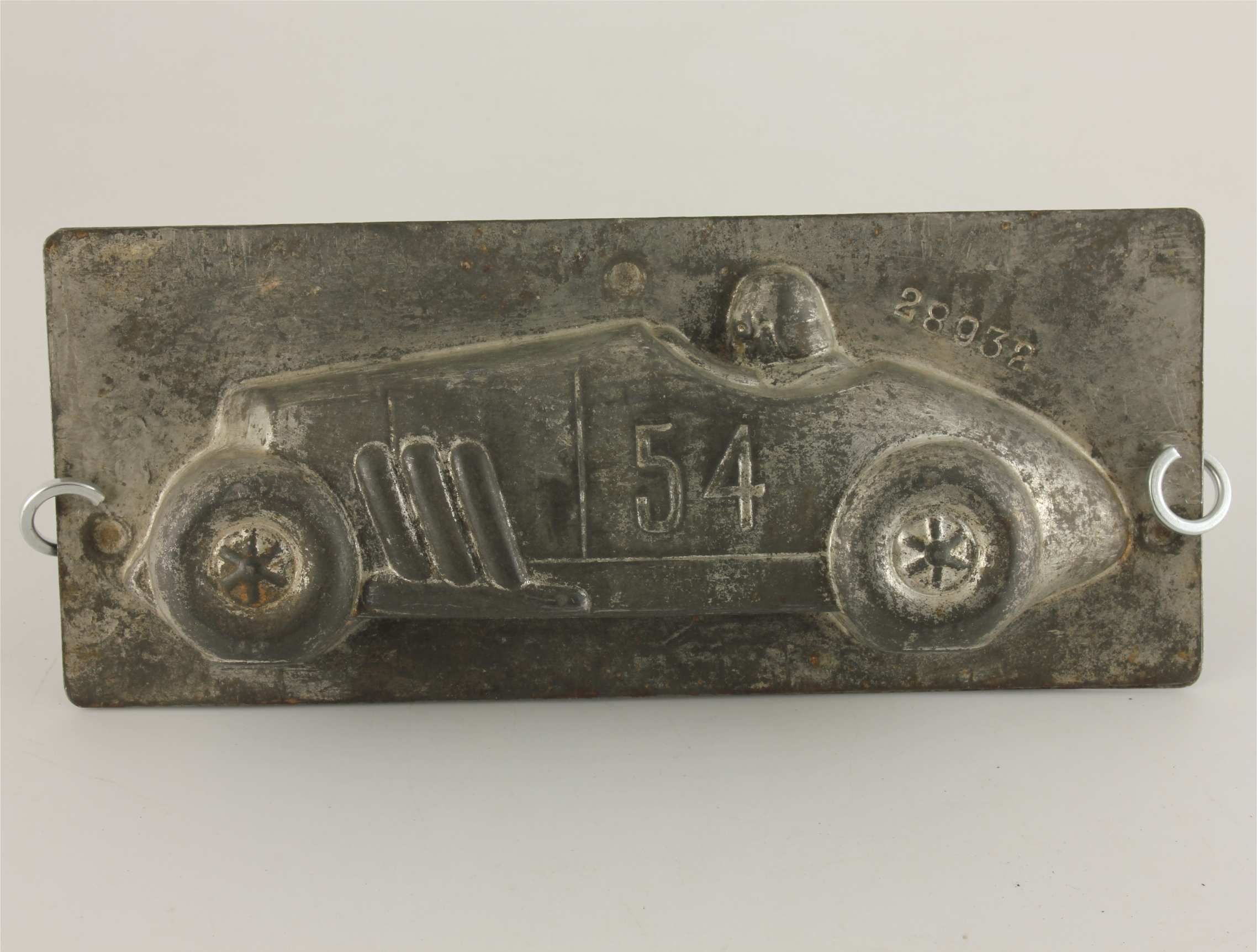 This antique mould which comes in 2 sections is of an early racing car marked number 54 with it's driver.