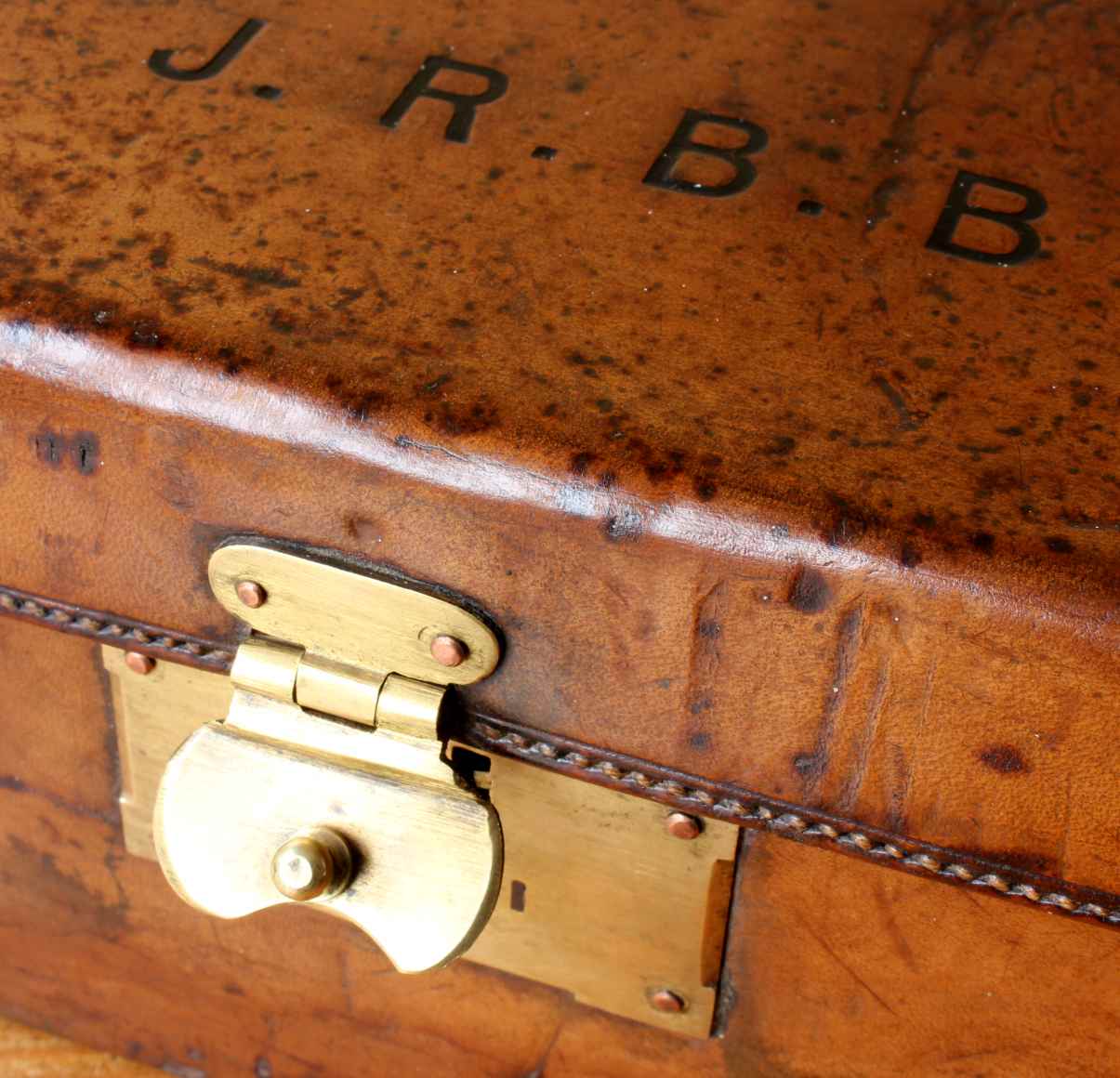 The interior is divided into 5 compartments which are fitted with leather lifting straps, has an Army & Navy Co-Operative Society Limited. No. 8 Gun Department. 105, Victoria Street, Westminster, London S.W label and the outside is nicely monogrammed with J.R.B.B to the top.