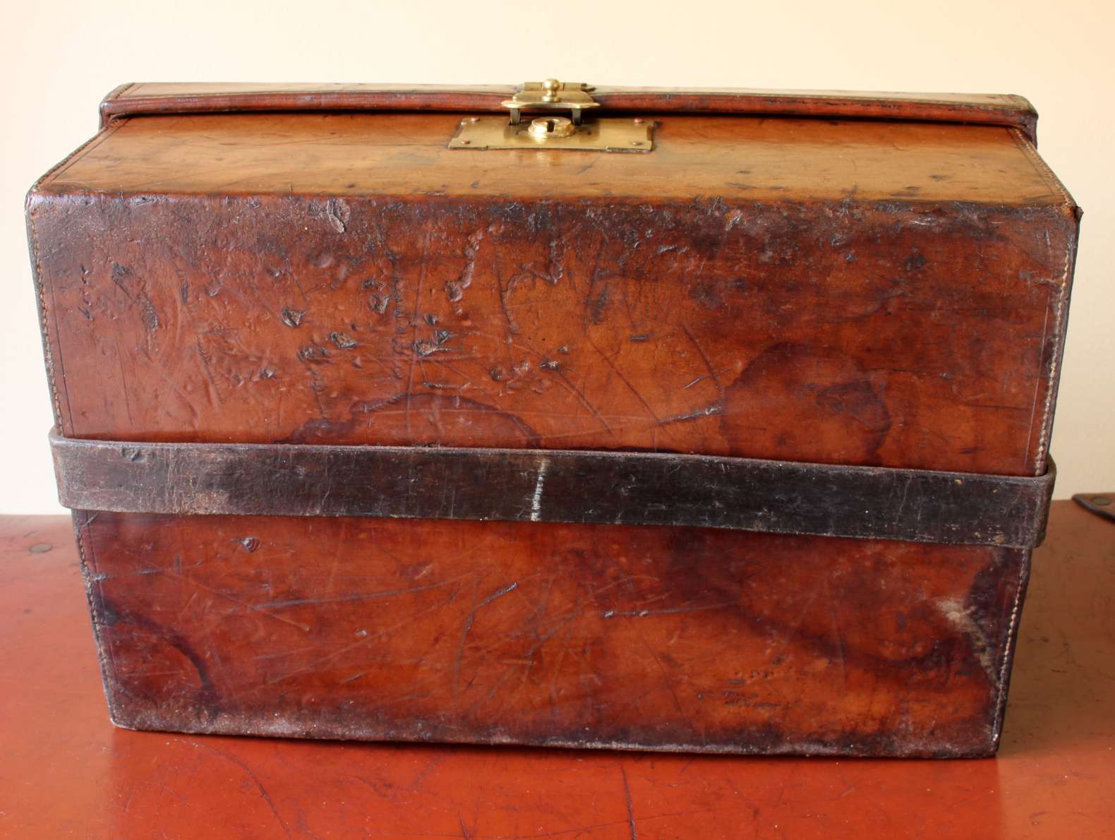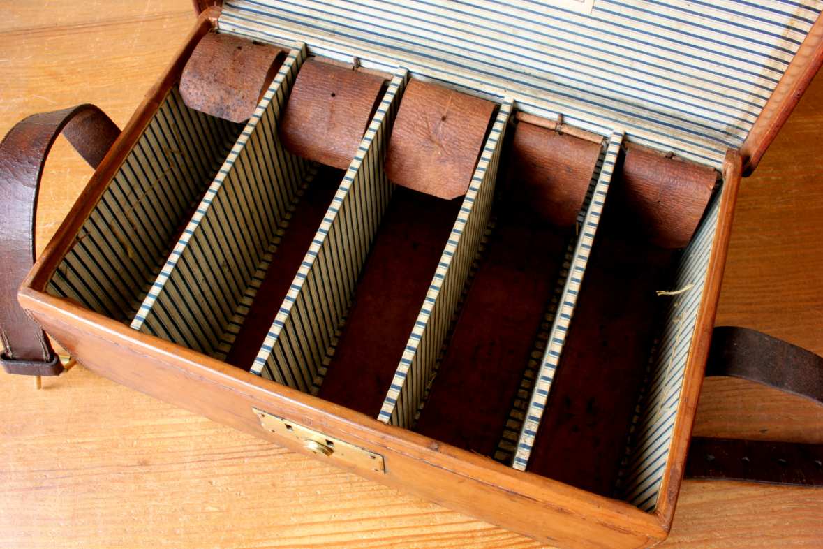 The handsome leather case has a wonderful rich patina and is very well made with brass lock/clasp and a strong exterior strap which also acts as a carrying handle.