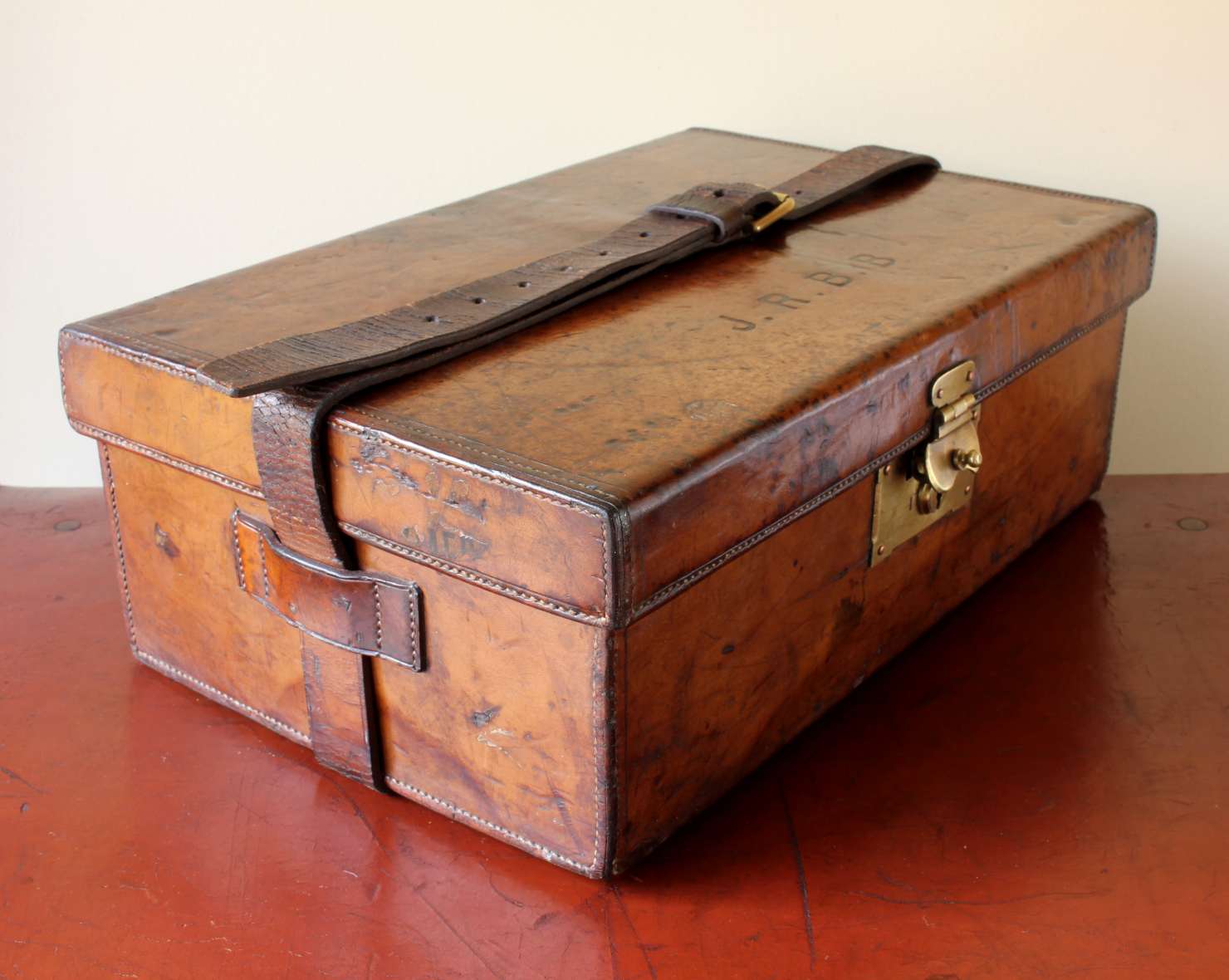 Condition: Excellent used antique condition with a wonderful patina and warm rich colour. Age related wear with scuffs and scrapes. The case is very sound and usable. Good stitching and strong corners. Clasp does not clip shut and we do not have the key. Please see pictures.