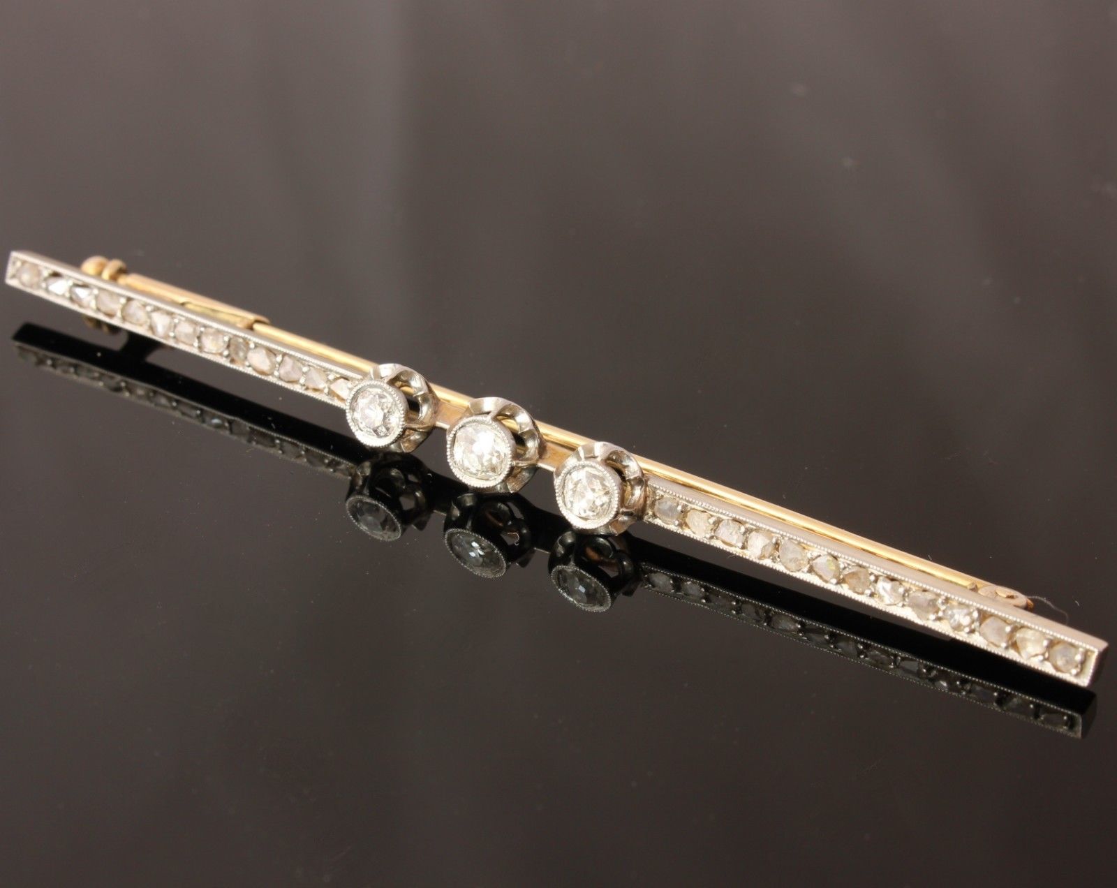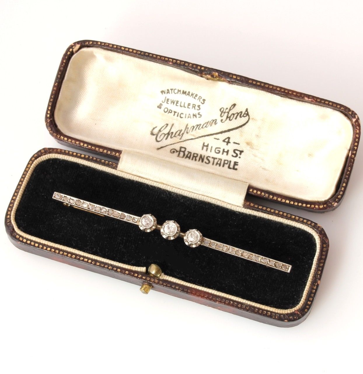 This pretty Art Deco brooch which comes with a fitted presentation case has 3 central old cut natural diamonds and rose cut diamonds to each side of the bar which are all set in a platinum mount and total est 0.62ct. The diamonds are clear, bright and sparkly.