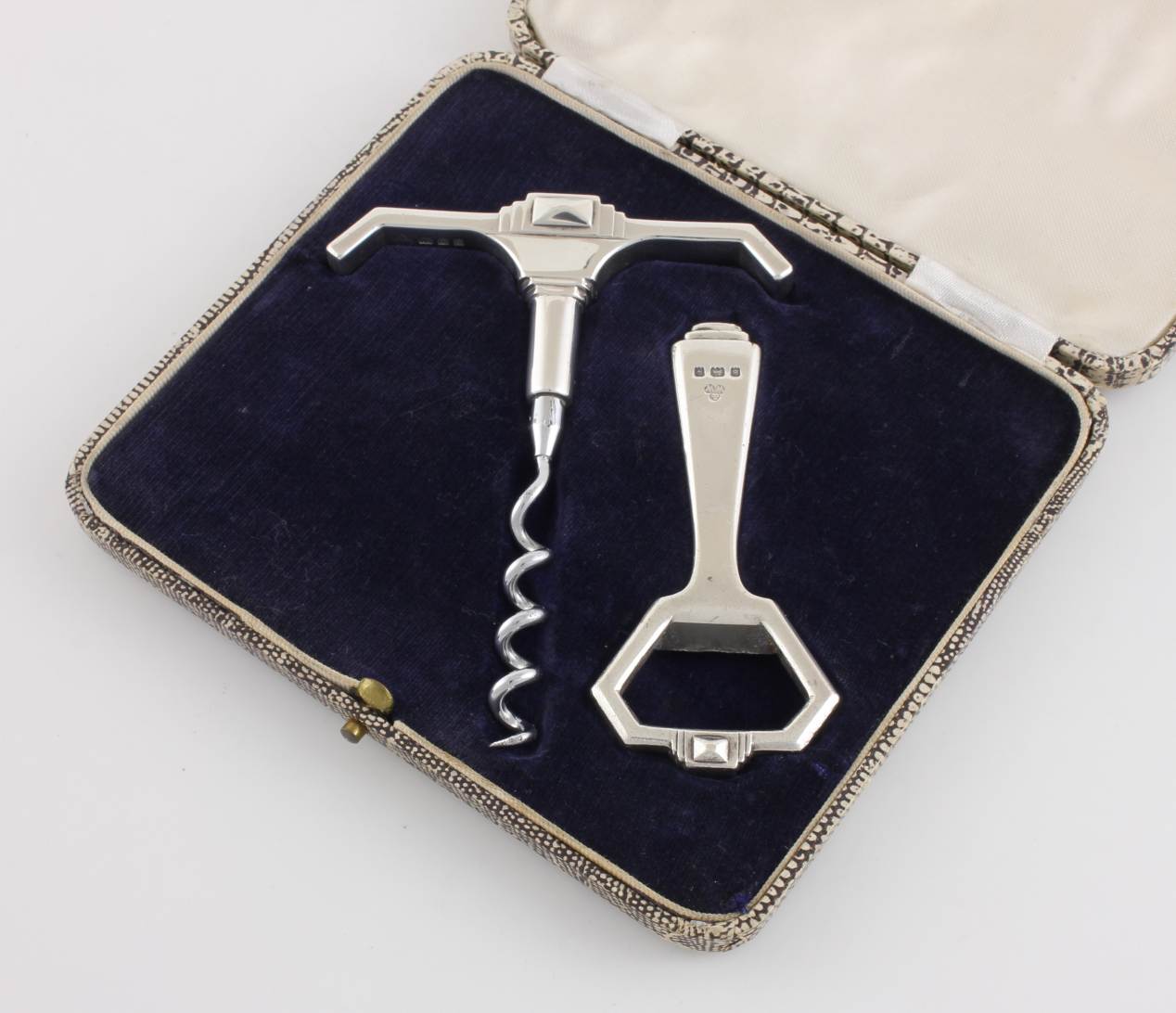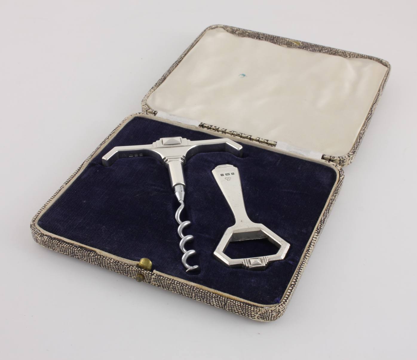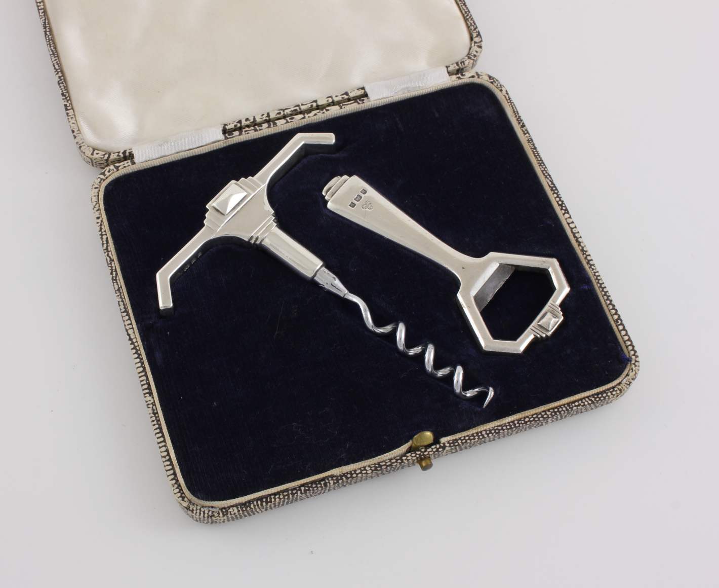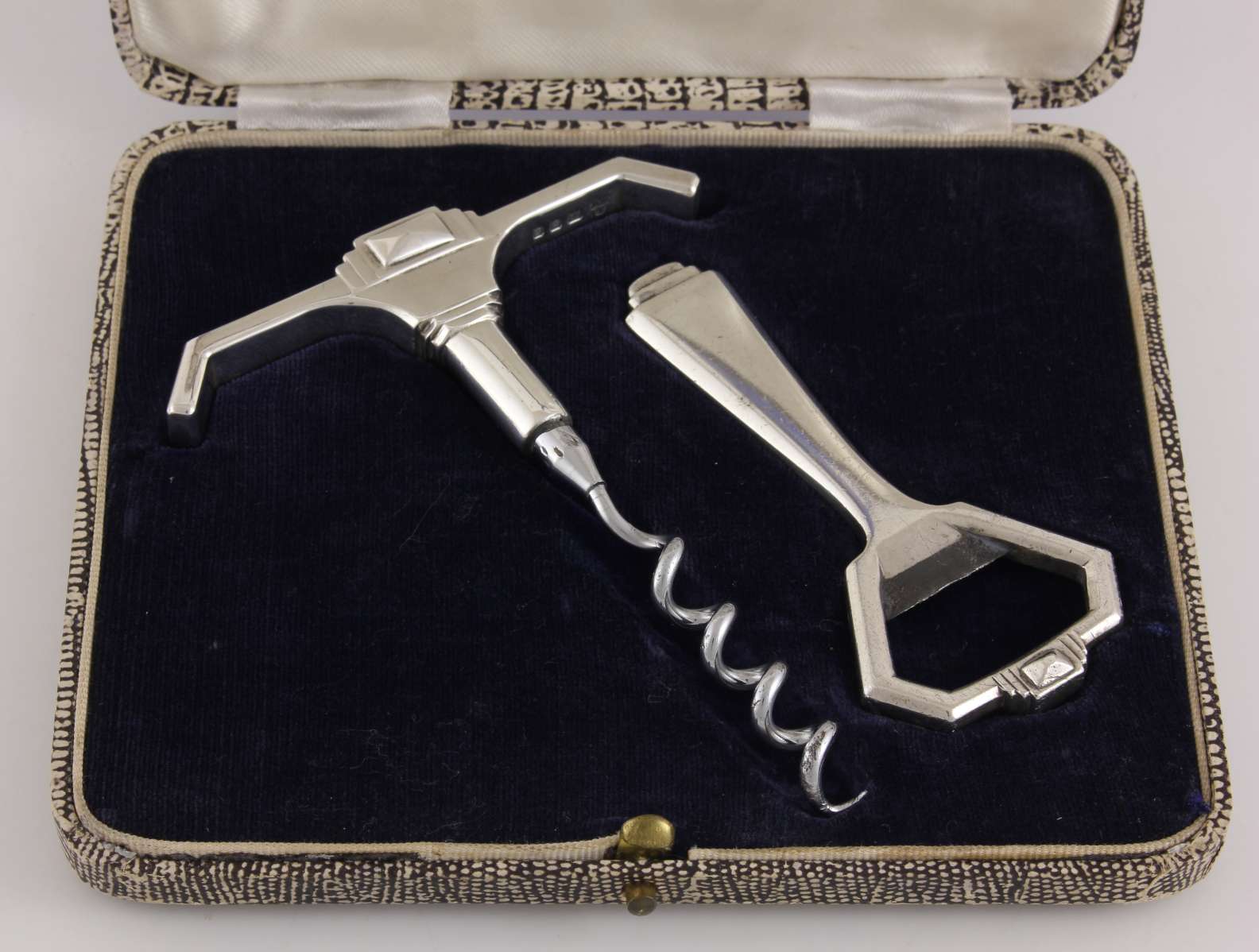 This stylish antique silver corkscrew and bottle opener set which is made by Wakely & Wheeler is fully hallmarked for 1933 on both pieces, have a stunning Art Deco design and are in their original fitted case.