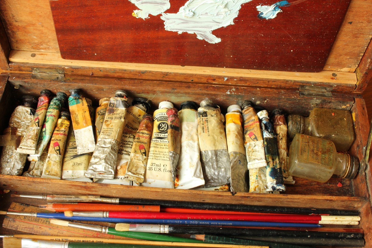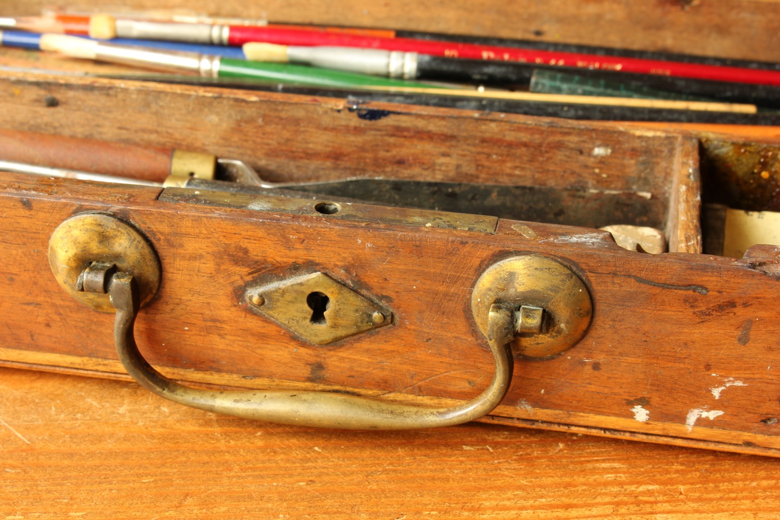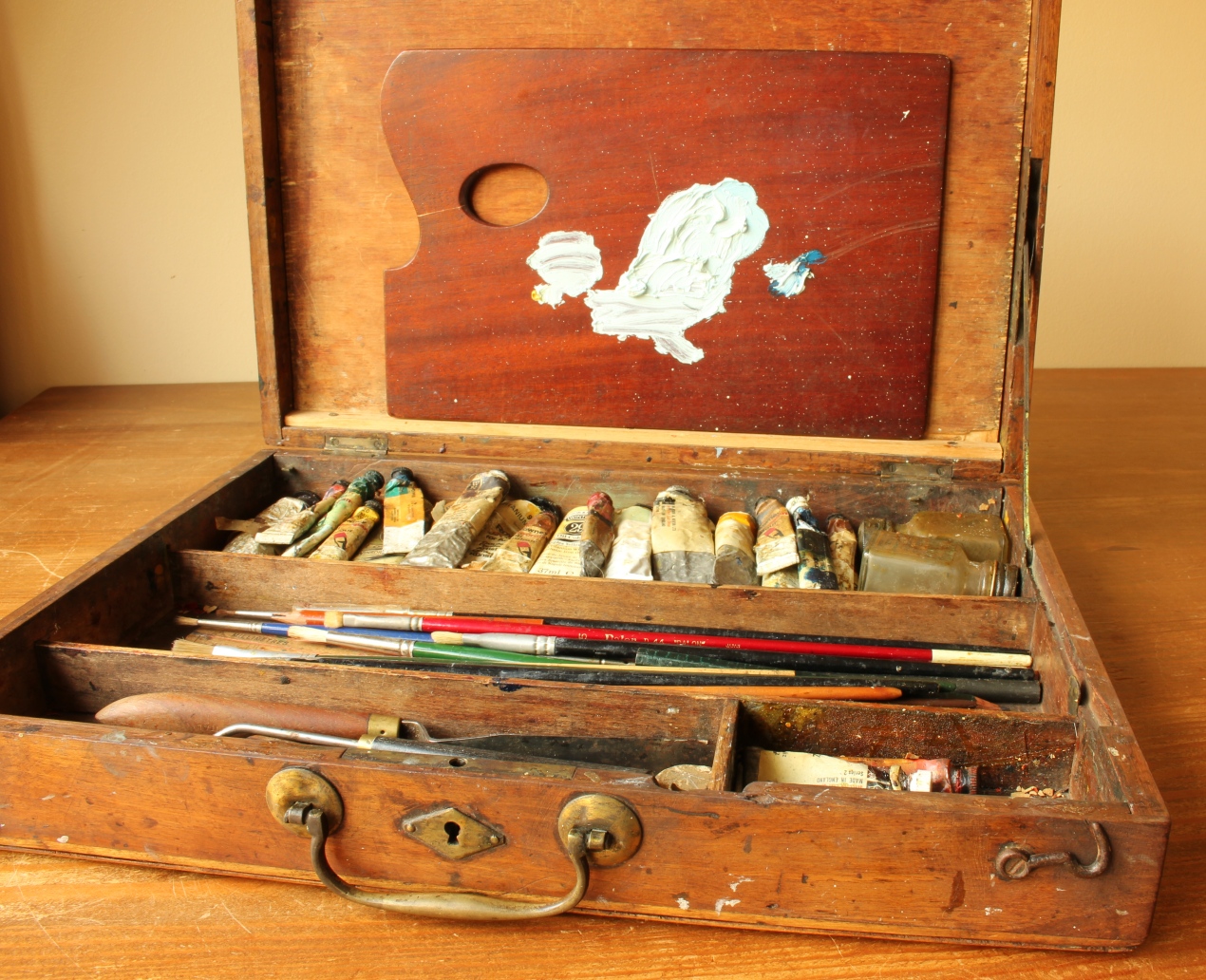 The box has a mixture of oil paints, brushes, wood pallet, bottles and some other items which date from the 20th century.