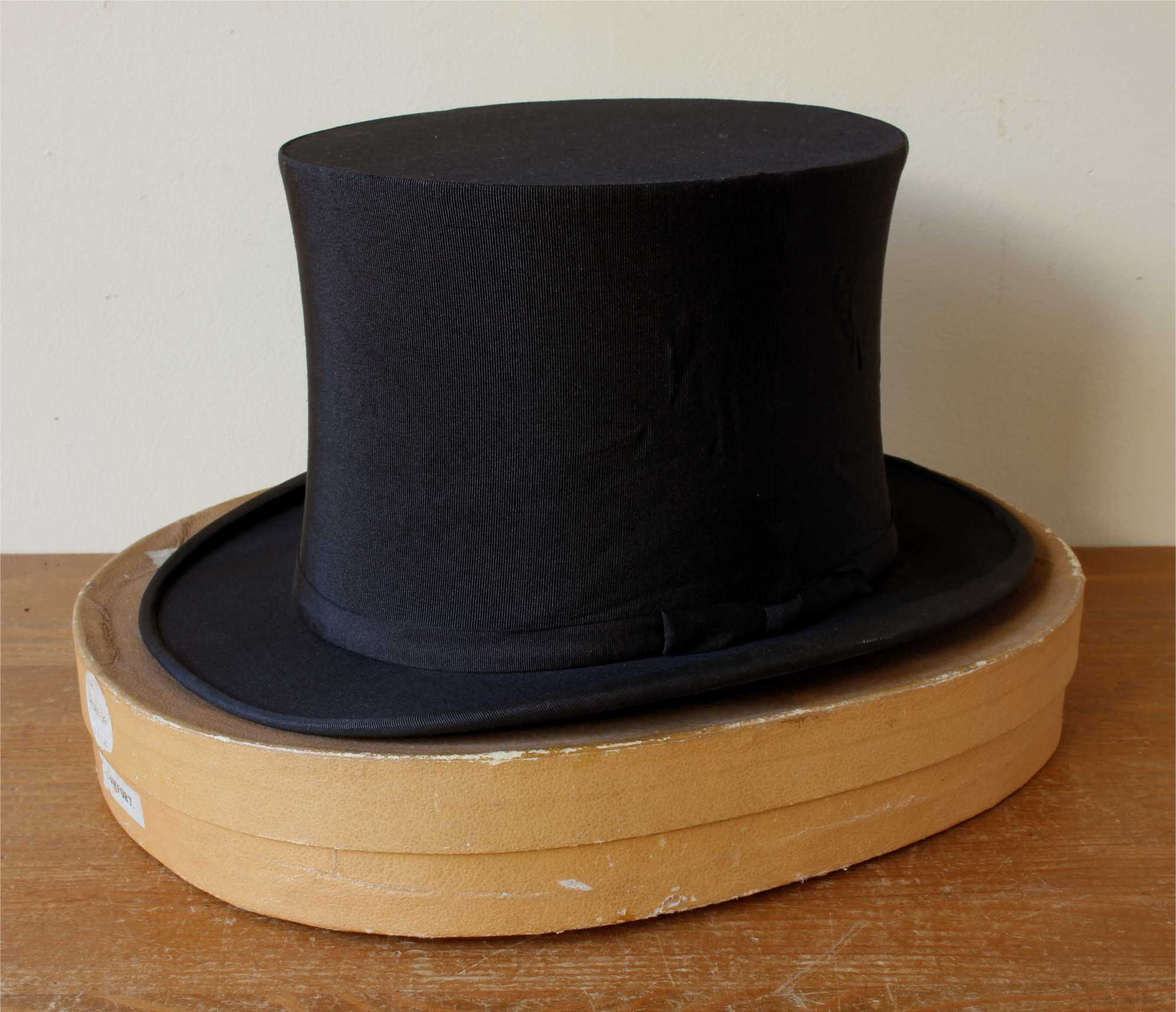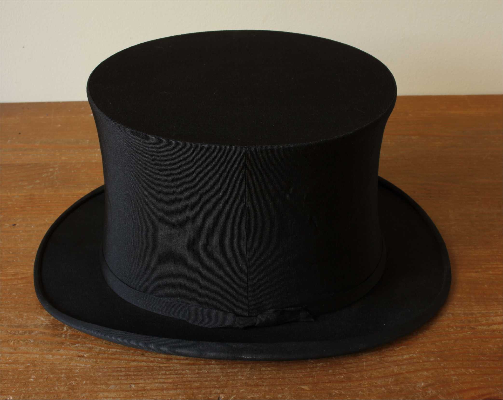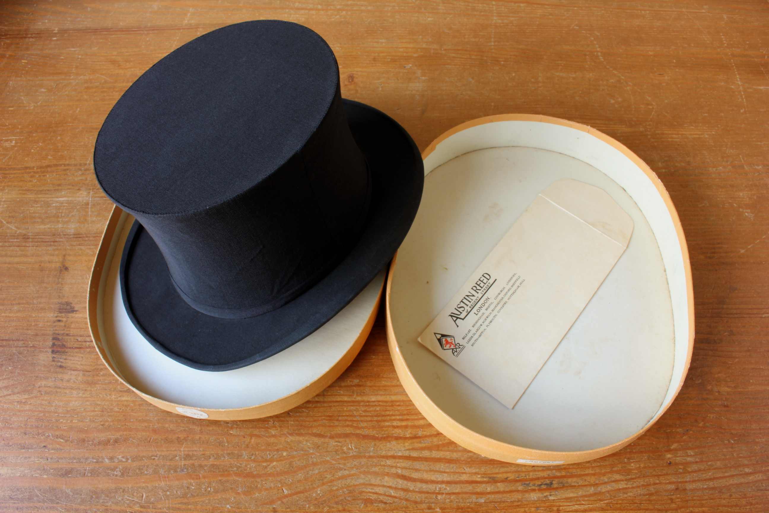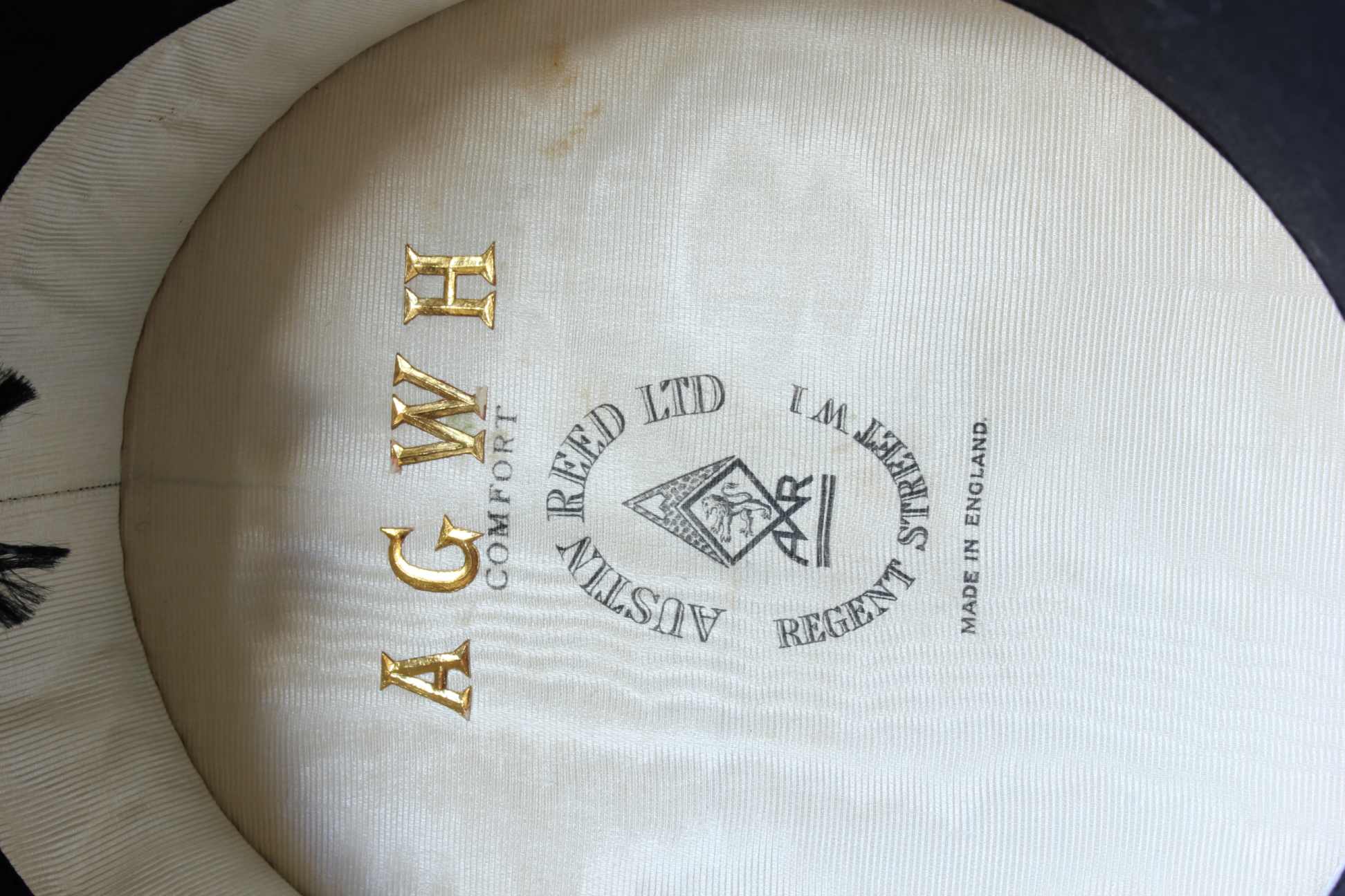 This handsome antique / vintage opera top hat which is a collapsible / pop up type hat is marked to the inside with the maker's details of Austin Reed Ltd, Regent Street, London along with it's original owner's initials of AGWH.