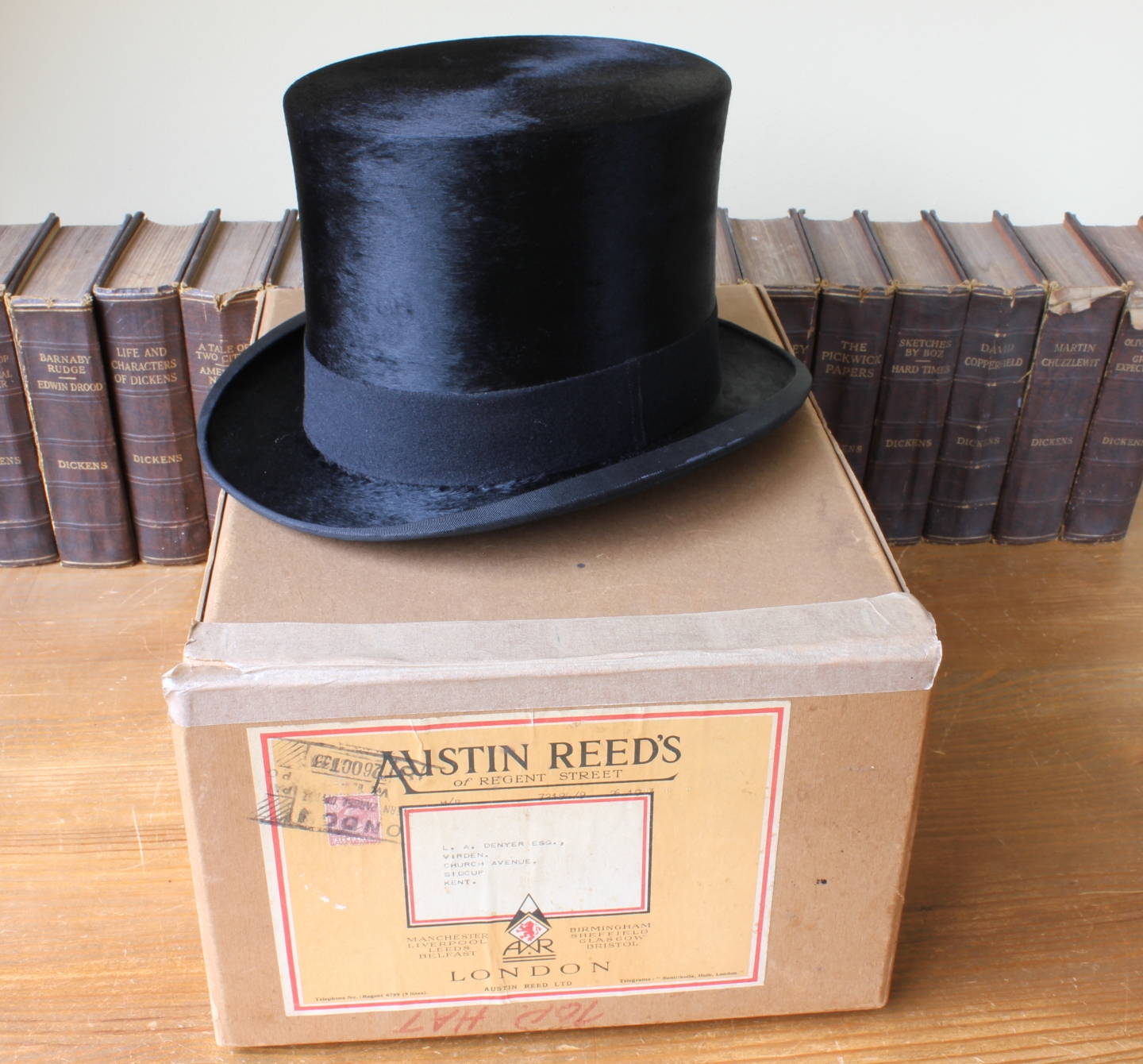 A beautiful and stylish Gentleman's plush moleskin (Imitation Beaver Fur) top hat is manufactured by top Hat Maker Austin Reed Ltd, Regent Street, London and comes complete with original storage box.