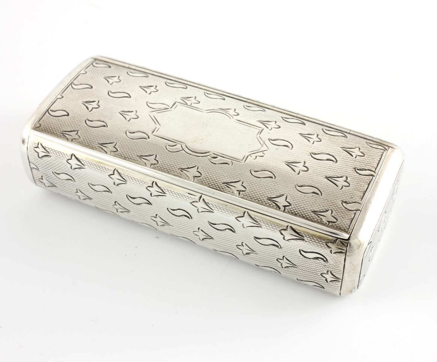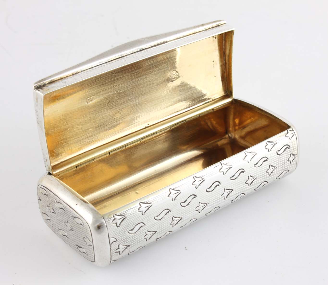 This charming antique snuff box which is made of Austrian silver has beautiful all over engine turned decoration with an unusual pattern and dates from 1853.